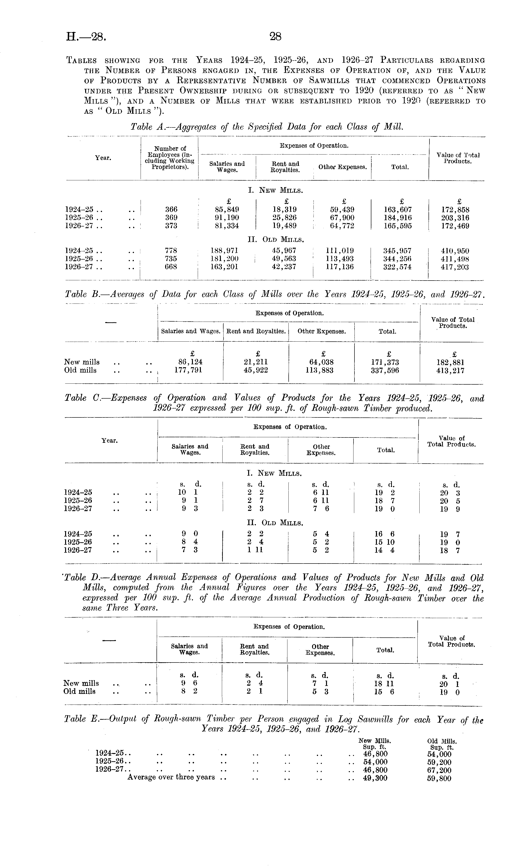 Tables showing fob the Years 1924-25, 1925-26, and 1926-27 Particulars regarding the Number of Persons engaged in, the Expenses of Operation of, and the Value of Products by a Representative Number of Sawmills that commenced Operations under the Present Ownership during or subsequent to 1920 (referred to as " New Mills "), and a Number of Mills that were established prior to 1920 (referred to as " Old Mills ").