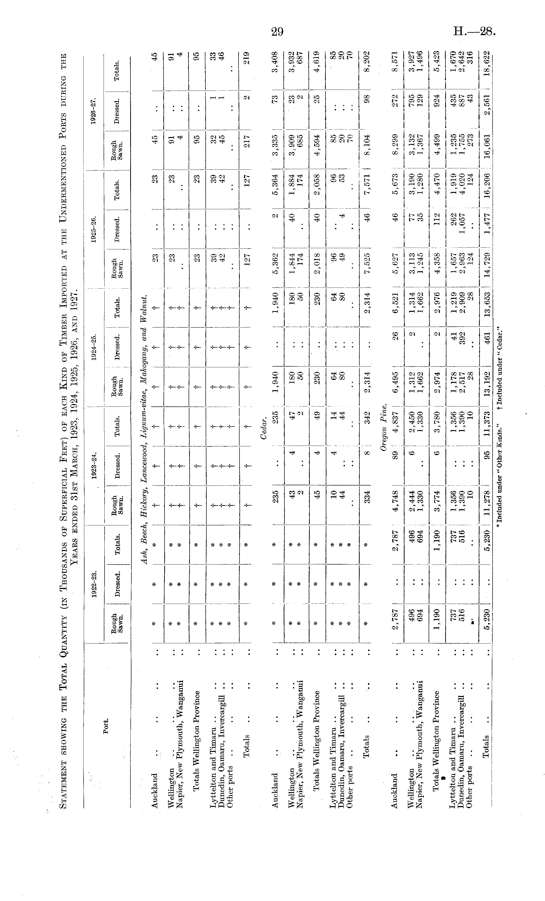 1922-23. 1923-24. 1924-25. ! 1925-26. | 1926-27. Port. : j 1 ; ! fa^J 1 Dressed. Totals. "sawn 1 Dressed. | Totals. "sawf 1 Dressed. Totals. faTO* 1 Dressed. Totals. fawn? Dressed. Totals. Ash, Beech, Hickory, Lancewood, IAgnum-vitae, Mahogany, and Walnut. Auckland .. .. .. .. * * * -j- f f t t ,f I ' 23 .. 23 45 .. 45 Wellington .. .. .. * * * -|- -j- -j- f f f | 23 23 91 91 Napier, New Plymouth, Wanganui ..* * * t f f t t t •• •• 4.. 4 Totals Wellington Province * * * -j- t t t t t 23 23 95 95 Lyttelton and Timaru .. .. * * * -j- f f f f f j 39 39 32 1 33 Dunedin, Oamaru, Invercargill .... * * * f f t f f f ! 42 42 45 1 J 46 Other ports .. .. .. .. * * * -j- f f f f f J .. Totals .. .. * * * t t tit t f ! 127 .. 127 217 2 219 Cedar. Auckland .. * * 235 .. j 235 j 1,940 .. 1,940 5,362 2 5,364 3,335 j 73 3,408 Wellington .. .. .. .. * * * 43 4 47 180 ..180 1,844 40 1,884 3,909 23 3,932 Napier, New Plymouth, Wanganui * j * * 2 2 50 50 174 .. 174 685 2 687 Totals Wellington Province * j * * 45 4 49 230 .. 230 2,018 40 2,058 4,594 ! 25 4,619 Lyttelton and Timaru .. .. * * * 10 4 14 64 64 96 96 85 85 Dunedin, Oamaru, Invercargill .. * * * 44 44 80 80 49 4 53 20 j 20 Other ports .. .. .. .. * * * .. j .. .. .. .. ! 70 j 70 Totals .. .. .. * * * 334 S 342 2,314 .. 2,314 7,525 46 7,571 | 8,104 ! 98 8,202 Oregon Pine. Auckland .. .. .. .. 2,787 .. j 2,787 4,748 89 4,837 j 6,495 26 6,521 j 5,627 j 46 5,673 | 8,299 272 8,571 Wellington .. .. . .. .. 496 .. 496 2,444 6 2.450 I 1,312 2 1,314 3,113 77 3,190 ! 3.132 795 3,927 Napier, New Plymouth, Wanganui .. 694 .. 694 1,330 .. 1,330 j 1,662 .. 1,662 1,245: 35 1,280 1,367 129 1,496 Totals Wellington Province .. 1,190 .. 1,190 3,774 6 3,780 2,974 2 2,976 4,358 112 4,470 4,499 924 5,423 « _ Lyttelton and Timaru .. .. .. 737 .. 737 1,356 .. 1,356 1,178 41 1,219 1,657 262 1,919 1,235 435 1,670 Dunedin, Oamaru, Invercargill .. .. 516 .. 516 1,390 .. 1,390 2,517 392 2,909 2,963 ! 1,057 4,020 1,755 887 2,642 Other ports .. .. .. .. ,. .. .. 10 .. 10 28 .. 28 124 | j 124 273 43 316 Totals .. „ 5,230 5,230 I 11,278 95 11,373 13,192 461 13,653 14,729 I 1,477 16,206 ; 16,061 2,561 , 18,622 * Included under " Other Kinds." f Included under " Cedar."