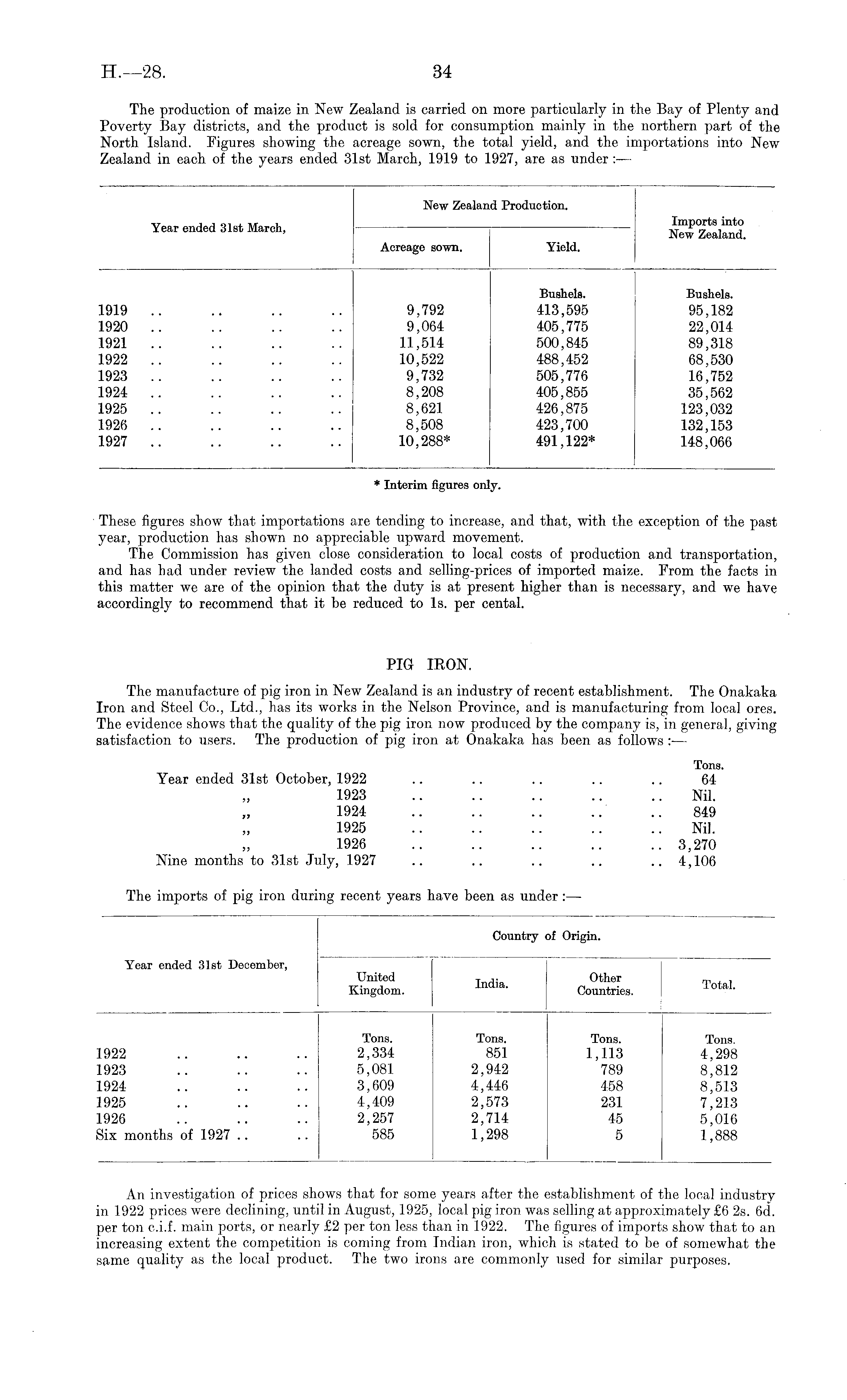 These figures show that importations are tending to increase, and that, with the exception of the past year, production has shown no appreciable upward movement. The Commission has given close consideration to local costs of production and transportation, and has had under review the landed costs and selling-prices of imported maize. From the facts in this matter we are of the opinion that the duty is at present higher than is necessary, and we have accordingly to recommend that it be reduced to Is. per cental. PIG IRON. The manufacture of pig iron in New Zealand is an industry of recent establishment. The Onakaka Iron and Steel Co., Ltd., has its works in the Nelson Province, and is manufacturing from local ores. The evidence shows that the quality of the pig iron now produced by the company is, in general, giving satisfaction to users. The production of pig iron at Onakaka has been as follows : — Tons. Year ended 31st October, 1922 .. .. .. .. .. 64 1923 Nil. 1924 .. .. .. .. .. 849 1925 Nil. 1926 .. .. .. .. .. 3,270 Nine months to 31st July, 1927 .. .. .. .. .. 4,106 The imports of pig iron during recent years have been as under : —