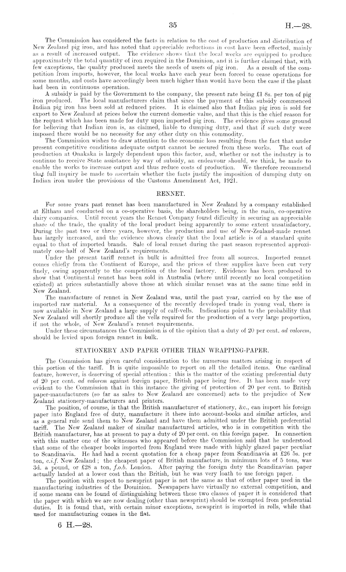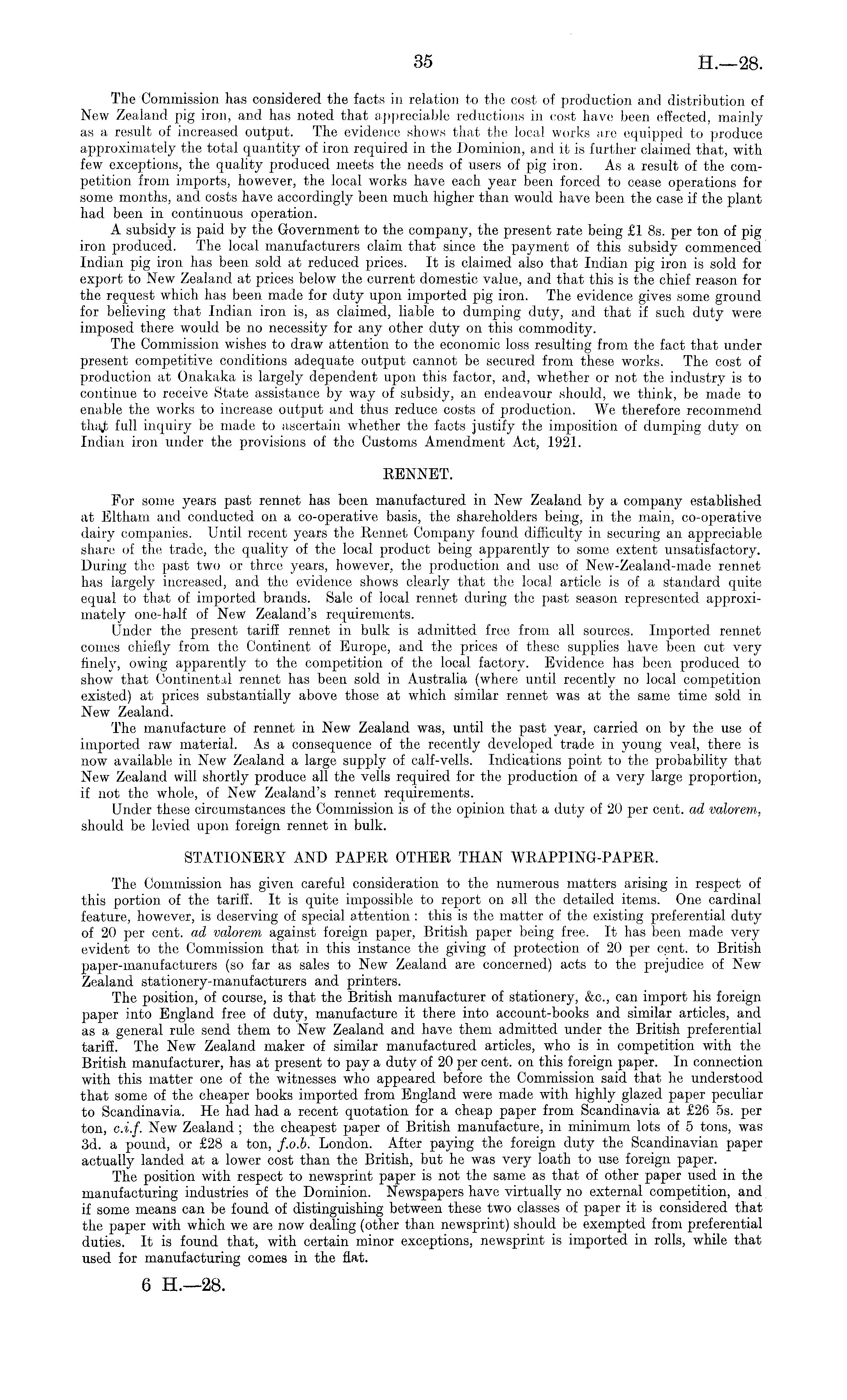 The Commission has considered the facts in relation to the cost of production and distribution of New Zealand pig iron, and has noted that appreciable reductions in cost have been effected, mainly as a result of increased output. The evidence shows that the local works are equipped to produce approximately the total quantity of iron required in the Dominion, and it is further claimed that, with few exceptions, the quality produced meets the needs of users of pig iron. As a result of the competition from imports, however, the local works have each year been forced to cease operations for some months, and costs have accordingly been much higher than would have been the case if the plant had been in continuous operation. A subsidy is paid by the Government to the company, the present rate being £1 Bs. per ton of pig iron produced. The local manufacturers claim that since the payment of this subsidy commenced Indian pig iron has been sold at reduced prices. It is claimed also that Indian pig iron is sold for export to New Zealand at prices below the current domestic value, and that this is the chief reason for the request which has been made for duty upon imported pig iron. The evidence gives some ground for believing that Indian iron is, as claimed, liable to dumping duty, and that if such duty were imposed there would be no necessity for any other duty on this commodity. The Commission wishes to draw attention to the economic loss resulting from the fact that under present competitive conditions adequate output cannot be secured from these works. The cost of production at Onakaka is largely dependent upon this factor, and, whether or not the industry is to continue to receive State assistance by way of subsidy, an endeavour should, we think, be made to enable the works to increase output and thus reduce costs of production. We therefore recommend thajfc full inquiry be made to ascertain whether the facts justify the imposition of dumping duty on Indian iron under the provisions of the Customs Amendment Act, 1921. RENNET. For some years past rennet has been manufactured in New Zealand by a company established at Eltham and conducted on a co-operative basis, the shareholders being, in the main, co-operative dairy companies. Until recent years the Rennet Company found difficulty in securing an appreciable share of the trade, the quality of the local product being apparently to some extent unsatisfactory. During the past two or three years, however, the production and use of New-Zealand-made rennet has largely increased, and the evidence shows clearly that the local article is of a standard quite equal to that of imported brands. Sale of local rennet during the past season represented approximately one-half of New Zealand's requirements. Under the present tariff rennet in bulk is admitted free from all sources. Imported rennet comes chiefly from the Continent of Europe, and the prices of these supplies have been cut very finely, owing apparently to the competition of the local factory. Evidence has been produced to show that Continental rennet has been sold in Australia (where until recently no local competition existed) at prices substantially above those at which similar rennet was at the same time sold in New Zealand. The manufacture of rennet in New Zealand was, until the past year, carried on by the use of imported raw material. As a consequence of the recently developed trade in young veal, there is now available in New Zealand a large supply of calf-vells. Indications point to the probability that New Zealand will shortly produce all the veils required for the production of a very large proportion, if not the whole, of New Zealand's rennet requirements. Under these circumstances the Commission is of the opinion that a duty of 20 per cent, ad valorem. should be levied upon foreign rennet in bulk. STATIONERY AND PAPER OTHER THAN WRAPPING-PAPER. The Commission has given careful consideration to the numerous matters arising in respect of this portion of the tariff. It is quite impossible to report on all the detailed items. One cardinal feature, however, is deserving of special attention : this is the matter of the existing preferential duty of 20 per cent, ad valorem against foreign paper, British paper being free. It has been made very evident to the Commission that in this instance the giving of protection of 20 per cent, to British paper-manufacturers (so far as sales to New Zealand are concerned) acts to the prejudice of New Zealand stationery-manufacturers and printers. The position, of course, is that the British manufacturer of stationery, &c., can import his foreign paper into England free of duty, manufacture it there into account-books and similar articles, and as a general rule send them to New Zealand and have them admitted under the British preferential tariff. The New Zealand maker of similar manufactured articles, who is in competition with the British manufacturer, has at present to pay a duty of 20 per cent, on this foreign paper. In connection with this matter one of the witnesses who appeared before the Commission said that he understood that some of the cheaper books imported from England were made with highly glazed paper peculiar to Scandinavia. He had had a recent quotation for a cheap paper from Scandinavia at £26 ss. per ton, c.i.f. New Zealand ; the cheapest paper of British manufacture, in minimum lots of 5 tons, was 3d. a pound, or £28 a ton, f.o.b. London. After paying the foreign duty the Scandinavian paper actually landed at a lower cost than the British, but he was very loath to use foreign paper. The position with respect to newsprint paper is not the same as that of other paper used in the manufacturing industries of the Dominion. Newspapers have virtually no external competition, and if some means can be found of distinguishing between these two classes of paper it is considered that the paper with which we are now dealing (other than newsprint) should