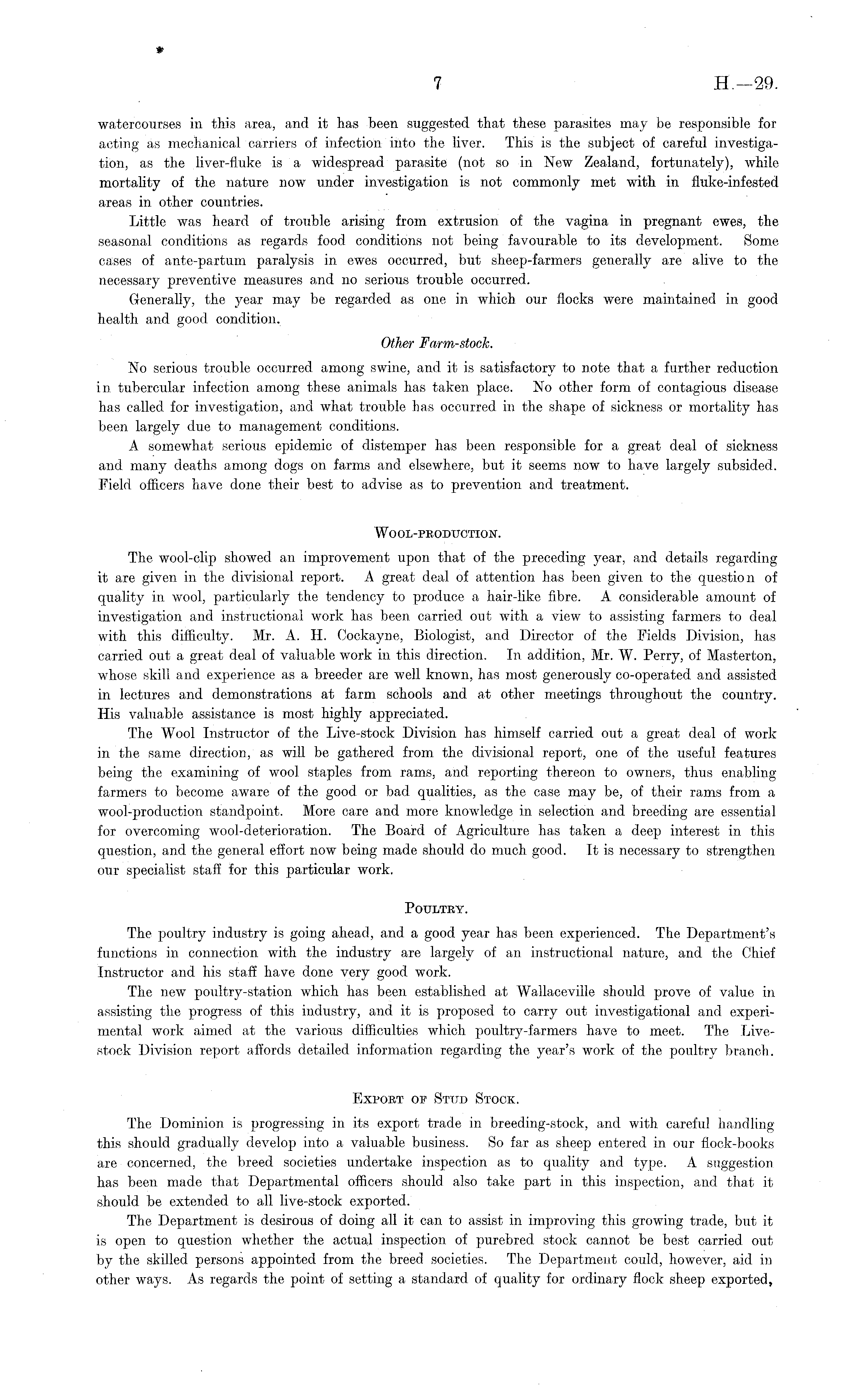 watercourses in this area, and it has been suggested that these parasites may be responsible for acting as mechanical carriers of infection into the liver. This is the subject of careful investigation, as the liver-fluke is a widespread parasite (not so in New Zealand, fortunately), while mortality of the nature now under investigation is not commonly met with in fluke-infested areas in other countries. Little was heard of trouble arising from extrusion of the vagina in pregnant ewes, the seasonal conditions as regards food conditions not being favourable to its development. Some cases of ante-partum paralysis in ewes occurred, but sheep-farmers generally are alive to the necessary preventive measures and no serious trouble occurred. Generally, the year may be regarded as one in which our flocks were maintained in good health and good condition. Other Farm-stock. No serious trouble occurred among swine, and it is satisfactory to note that a further reduction in tubercular infection among these animals has taken place. No other form of contagious disease has called for investigation, and what trouble has occurred in the shape of sickness or mortality has been largely due to management conditions. A somewhat serious epidemic of distemper has been responsible for a great deal of sickness and many deaths among dogs on farms and elsewhere, but it seems now to have largely subsided. Field officers have done their best to advise as to prevention and treatment. Wool-production. The wool-clip showed an improvement upon that of the preceding year, and details regarding it are given in the divisional report. A great deal of attention has been given to the question of quality in wool, particularly the tendency to produce a hair-like fibre. A considerable amount of investigation and instructional work has been carried out with a view to assisting farmers to deal with this difficulty. Mr. A. H. Cockayne, Biologist, and Director of the Fields Division, has carried out a great deal of valuable work in this direction. In addition, Mr. W. Perry, of Masterton, whose skill and experience as a breeder are well known, has most generously co-operated and assisted in lectures and demonstrations at farm schools and at other meetings throughout the country. His valuable assistance is most highly appreciated. The Wool Instructor of the Live-stock Division has himself carried out a great deal of work in the same direction, as will be gathered from the divisional report, one of the useful features being the examining of wool staples from rams, and reporting thereon to owners, thus enabling farmers to become aware of the good or bad qualities, as the case may be, of their rams from a wool-production standpoint. More care and more knowledge in selection and breeding are essential for overcoming wool-deterioration. The Board of Agriculture has taken a deep interest in this question, and the general effort now being made should do much good. It is necessary to strengthen our specialist staff for this particular work. Poultry. The poultry industry is going ahead, and a good year has been experienced. The Department's functions in connection with the industry are largely of an instructional nature, and the Chief Instructor and his staff have done very good work. The new poultry-station which has been established at Wallaceville should prove of value in assisting the progress of this industry, and it is proposed to carry out investigational and experimental work aimed at the various difficulties which poultry-farmers have to meet. The Livestock Division report affords detailed information regarding the year's work of the poultry branch. Export of Stud Stock. The Dominion is progressing in its export trade in breeding-stock, and with careful handling this should gradually develop into a valuable business. So far as sheep entered in our flock-books are concerned, the breed societies undertake inspection as to quality and type. A suggestion has been made that Departmental officers should also take part in this inspection, and that it should be extended to all live-stock exported. The Department is desirous of doing all it can to assist in improving this growing trade, but it is open to question whether the actual inspection of purebred stock cannot be best carried out by the skilled persons appointed from the breed societies. The Department could, however, aid in other ways. As regards the point of setting a standard of quality for ordinary flock sheep exported,