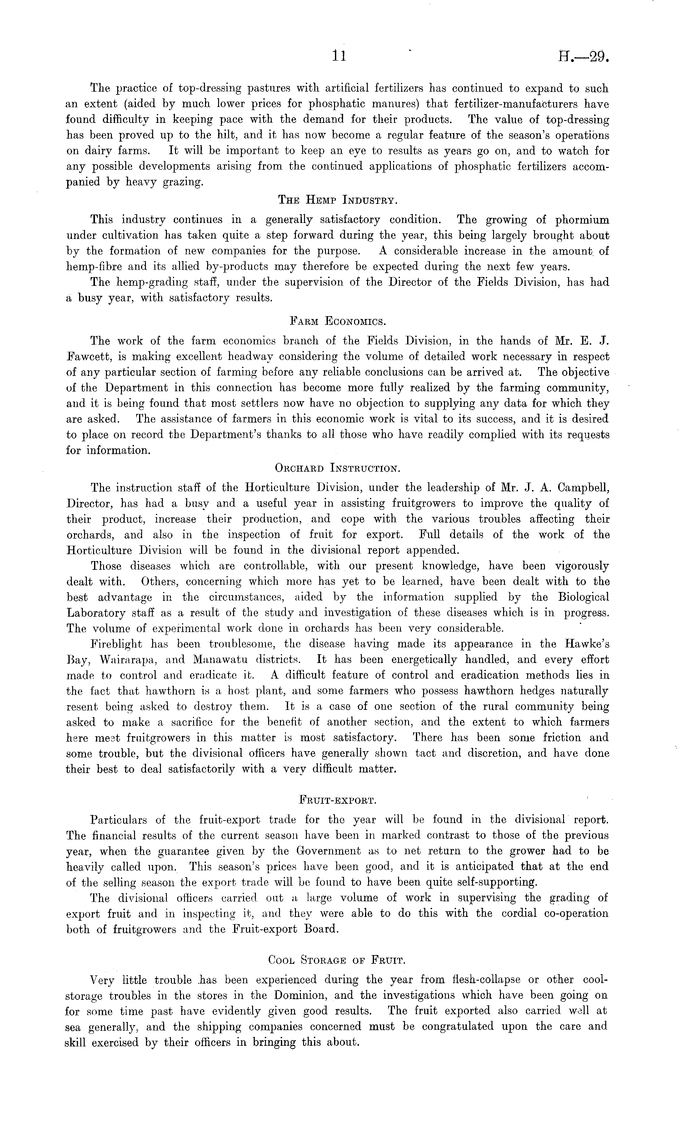 The practice of top-dressing pastures with artificial fertilizers has continued to expand to such an extent (aided by much lower prices for phosphatic manures) that fertilizer-manufacturers have found difficulty in keeping pace with the demand for their products. The value of top-dressing has been proved up to the hilt, and it has now become a regular feature of the season's operations on dairy farms. It will be important to keep an eye to results as years go on, and to watch for any possible developments arising from the continued applications of phosphatic fertilizers accompanied by heavy grazing. The Hemp Industry. This industry continues in a generally satisfactory condition. The growing of phormium under cultivation has taken quite a step forward during the year, this being largely brought about by the formation of new companies for the purpose. A considerable increase in the amount of hemp-fibre and its allied by-products may therefore be expected during the next few years. The hemp-grading staff, under the supervision of the Director of the Fields Division, has had a busy year, with satisfactory results. Farm Economics. The work of the farm economics branch of the Fields Division, in the hands of Mr. E. J. Fawcett, is making excellent headway considering the volume of detailed work necessary in respect of any particular section of farming before any reliable conclusions can be arrived at. The objective of the Department in this connection has become more fully realized by the farming community, and it is being found that most settlers now have no objection to supplying any data for which they are asked. The assistance of farmers in this economic work is vital to its success, and it is desired to place on record the Department's thanks to all those who have readily complied with its requests for information. Orchard Instruction. The instruction staff of the Horticulture Division, under the leadership of Mr. J. A. Campbell, Director, has had a busy and a useful year in assisting fruitgrowers to improve the quality of their product, increase their production, and cope with the various troubles affecting their orchards, and also in the inspection of fruit for export. Full details of the work of the Horticulture Division will be found in the divisional report appended. Those diseases which are controllable, with our present knowledge, have been vigorously dealt with. Others, concerning which more has yet to be learned, have been dealt with to the best advantage in the circumstances, aided by the information supplied by the Biological Laboratory staff as a result of the study and investigation of these diseases which is in progress. The volume of experimental work done in orchards has been very considerable. Fireblight has been troublesome, the disease having made its appearance in the Hawke's Bay, Wairarapa, and Manawatu districts. It has been energetically handled, and every effort made to control and eradicate it. A difficult feature of control and eradication methods lies in the fact that hawthorn is a. host plant, and some farmers who possess hawthorn hedges naturally resent being asked to destroy them. It is a case of one section of the rural community being asked to make a sacrifice for the benefit of another section, and the extent to which farmers here meet fruitgrowers in this matter is most satisfactory. There has been some friction and some trouble, but the divisional officers have generally shown tact and discretion, and have done their best to deal satisfactorily with a very difficult matter. Fruit-export. Particulars of the fruit-export trade for the year will be found in the divisional report. The financial results of the current season have been in marked contrast to those of the previous year, when the guarantee given by the Government as to net return to the grower had to be heavily called upon. This season's prices have been good, and it is anticipated that at the end of the selling season the export trade will be found to have been quite self-supporting. The divisional officers carried out a large volume of work in supervising the grading of export fruit and in inspecting it, and they were able to do this with the cordial co-operation both of fruitgrowers and the Fruit-export Board. Cool Storage of Fruit. Very little trouble .has been experienced during the year from flesh-collapse or other coolstorage troubles in the stores in the Dominion, and the investigations which have been going on for some time past have evidently given good results. The fruit exported also carried well at sea generally, and the shipping companies concerned must be congratulated upon the care and skill exercised by their officers in bringing this about.