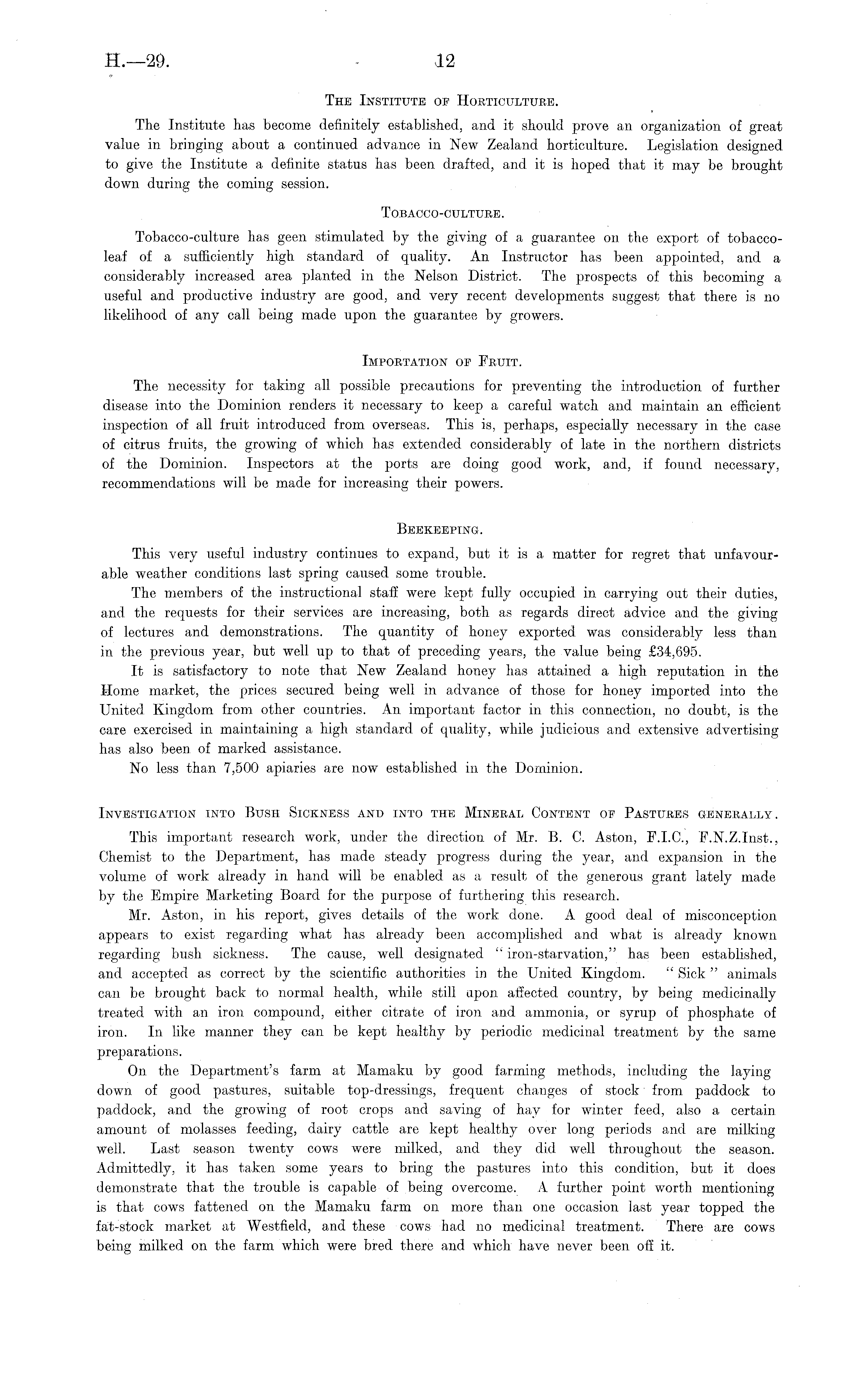 The Institute of Horticulture. The Institute has become definitely established, and it should prove an organization of great value in bringing about a continued advance in New Zealand horticulture. Legislation designed to give the Institute a definite status has been drafted, and it is hoped that it may be brought down during the coming session. Tobacco-culture. Tobacco-culture has geen stimulated by the giving of a guarantee on the export of tobaccoleaf of a sufficiently high standard of quality. An Instructor has been appointed, and a Considerably increased area planted in the Nelson District. The prospects of this becoming a useful and productive industry are good, and very recent developments suggest that there is no likelihood of any call being made upon the guarantee by growers. Importation op Fruit. The necessity for taking all possible precautions for preventing the introduction of further disease into the Dominion renders it necessary to keep a careful watch and maintain an efficient inspection of all fruit introduced from overseas. This is, perhaps, especially necessary in the case of citrus fruits, the growing of which has extended considerably of late in the northern districts of the Dominion. Inspectors at the ports are doing good work, and, if found necessary, recommendations will be made for increasing their powers. Beekeeping. This very useful industry continues to expand, but it is a matter for regret that unfavourable weather conditions last spring caused some trouble. The members of the instructional staff were kept fully occupied in carrying out their duties, and the requests for their services are increasing, both as regards direct advice and the giving of lectures and demonstrations. The quantity of honey exported was considerably less than in the previous year, but well up to that of preceding years, the value being £34,695. It is satisfactory to note that New Zealand honey has attained a high reputation in the Home market, the prices secured being well in advance of those for honey imported into the United Kingdom from other countries. An important factor in this connection, no doubt, is the care exercised in maintaining a high standard of quality, while judicious and extensive advertising has also been of marked assistance. No less than 7,500 apiaries are now established in the Dominion. Investigation into Bush Sickness and into the Mineral Content op Pastures generally. This important research work, under the direction of Mr. B. C. Aston, F.1.C., F.N.Z.lnst., Chemist to the Department, has made steady progress during the year, and expansion in the volume of work already in hand will be enabled as a result of the generous grant lately made by the Empire Marketing Board for the purpose of furthering this research. Mr. Aston, in his report, gives details of the work done. A good deal of misconception appears to exist regarding what has already been accomplished and what is already known regarding bush sickness. The cause, well designated " iron-starvation," has been established, and accepted as correct by the scientific authorities in the United Kingdom. " Sick " animals can be brought back to normal health, while still upon affected country, by being medicinally treated with an iron compound, either citrate of iron and ammonia, or syrup of phosphate of iron. In like manner they can be kept healthy by periodic medicinal treatment by the same preparations. On the Department's farm at Mamaku by good farming methods, including the laying down of good pastures, suitable top-dressings, frequent changes of stock from paddock to paddock, and the growing of root crops and saving of hay for winter feed, also a certain amount of molasses feeding, dairy cattle are kept healthy over long periods and are milking well. Last season twenty cows were milked, and they did well throughout the season. Admittedly, it has taken some years to bring the pastures into this condition, but it does demonstrate that the trouble is capable of being overcome. A further point worth mentioning is that cows fattened on the Mamaku farm on more than one occasion last year topped the fat-stock market at Westfield, and these cows had no medicinal treatment. There are cows being milked on the farm which were bred there and which have never been off it.