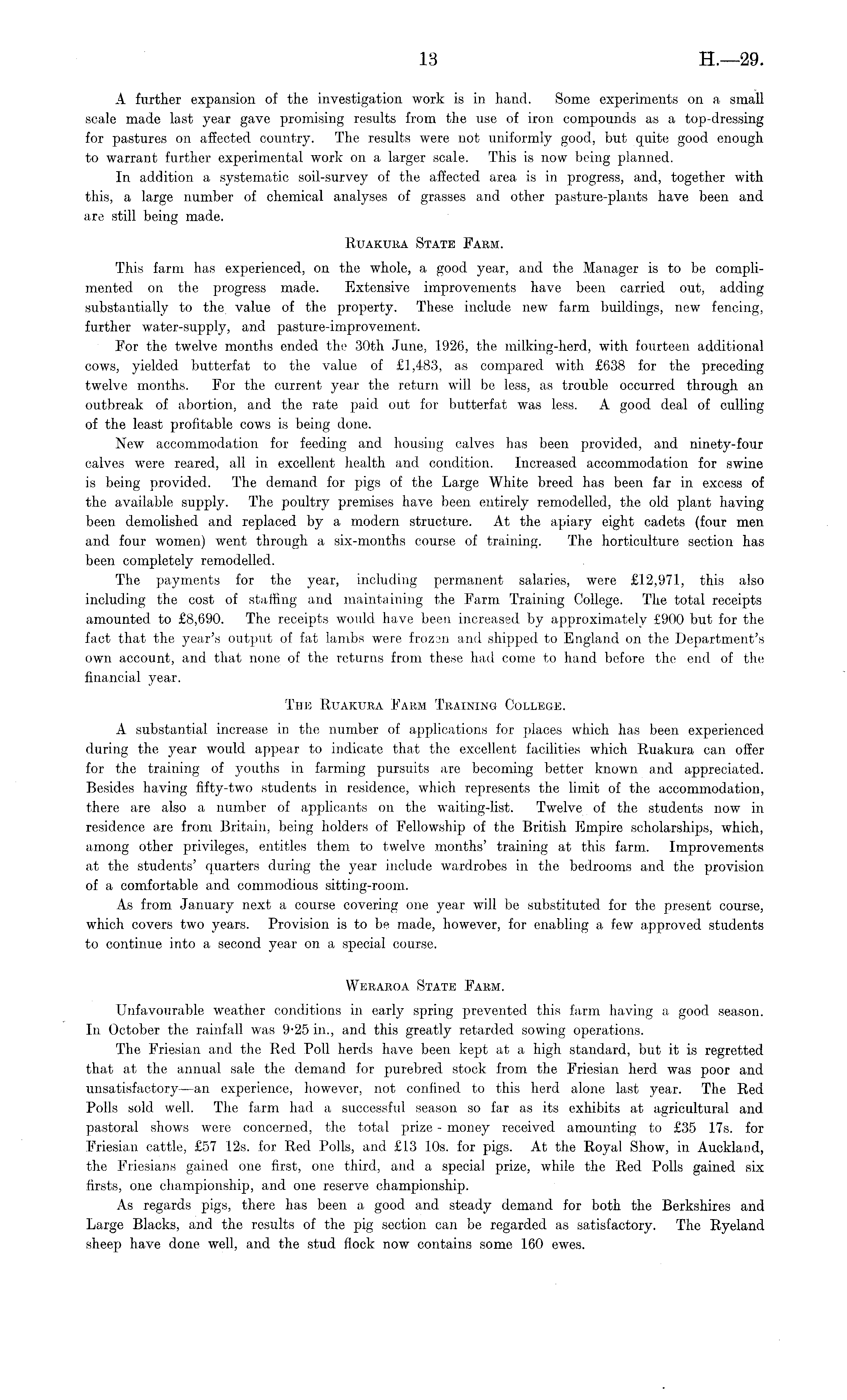 A further expansion of the investigation work is in hand. Some experiments on a small scale made last year gave promising results from the use of iron compounds as a top-dressing for pastures on affected country. The results were not uniformly good, but quite good enough to warrant further experimental work on a larger scale. This is now being planned. In addition a systematic soil-survey of the affected area is in progress, and, together with this, a large number of chemical analyses of grasses and other pasture-plants have been and are still being made. Ruakura State Farm. This farm has experienced, on the whole, a good year, and the Manager is to be complimented on the progress made. Extensive improvements have been carried out, adding substantially to the value of the property. These include new farm buildings, new fencing, further water-supply, and pasture-improvement. For the twelve months ended the 30th June, 1926, the milking-herd, with fourteen additional cows, yielded butterfat to the value of £1,483, as compared with £638 for the preceding twelve months. For the current year the return will be less, as trouble occurred through an outbreak of abortion, and the rate paid out for butterfat was less. A good deal of culling of the least profitable cows is being done. New accommodation for feeding and housing calves has been provided, and ninety-four calves were reared, all in excellent health and condition. Increased accommodation for swine is being provided. The demand for pigs of the Large White breed has been far in excess of the available supply. The poultry premises have been entirely remodelled, the old plant having been demolished and replaced by a modern structure. At the apiary eight cadets (four men and four women) went through a six-months course of training. The horticulture section has been completely remodelled. The payments for the year, including permanent salaries, were £12,971, this also including the cost of staffing and maintaining the Farm Training College. The total receipts amounted to £8,690. The receipts would have been increased by approximately £900 but for the fact that the year's output of fat lambs were frozsn and shipped to England on the Department's own account, and that none of the returns from these had come to hand before the end of the financial year. The Ruakura Farm Training College. A substantial increase in the number of applications for places which has been experienced during the year would appear to indicate that the excellent facilities which Ruakura can offer for the training of youths in farming pursuits are becoming better known and appreciated. Besides having fifty-two students in residence, which represents the limit of the accommodation, there are also a number of applicants on the waiting-list. Twelve of the students now in residence are from Britain, being holders of Fellowship of the British Empire scholarships, which, among other privileges, entitles them to twelve months' training at this farm. Improvements at the students' quarters during the year include wardrobes in the bedrooms and the provision of a comfortable and commodious sitting-room. As from January next a course covering one year will be substituted for the present course, which covers two years. Provision is to be made, however, for enabling a few approved students to continue into a second year on a special course. Weraroa State Farm. Unfavourable weather conditions in early spring prevented this farm having a good season. In October the rainfall was 9-25 in., and this greatly retarded sowing operations. The Friesian and the Red Poll herds have been kept at a high standard, but it is regretted that at the annual sale the demand for purebred stock from the Friesian herd was poor and unsatisfactory—an experience, however, not confined to this herd alone last year. The Red Polls sold well. The farm had a successful season so far as its exhibits at agricultural and pastoral shows were concerned, the total prize - money received amounting to £35 17s. for Friesian cattle, £57 12s. for Red Polls, and £13 10s. for pigs. At the Royal Show, in Auckland, the Friesians gained one first, one third, and a special prize, while the Red Polls gained six firsts, one championship, and one reserve championship. As regards pigs, there has been a good and steady demand for both the Berkshires and Large Blacks, and the results of the pig section can be regarded as satisfactory. The Ryeland sheep have done well, and the stud flock now contains some 160 ewes.