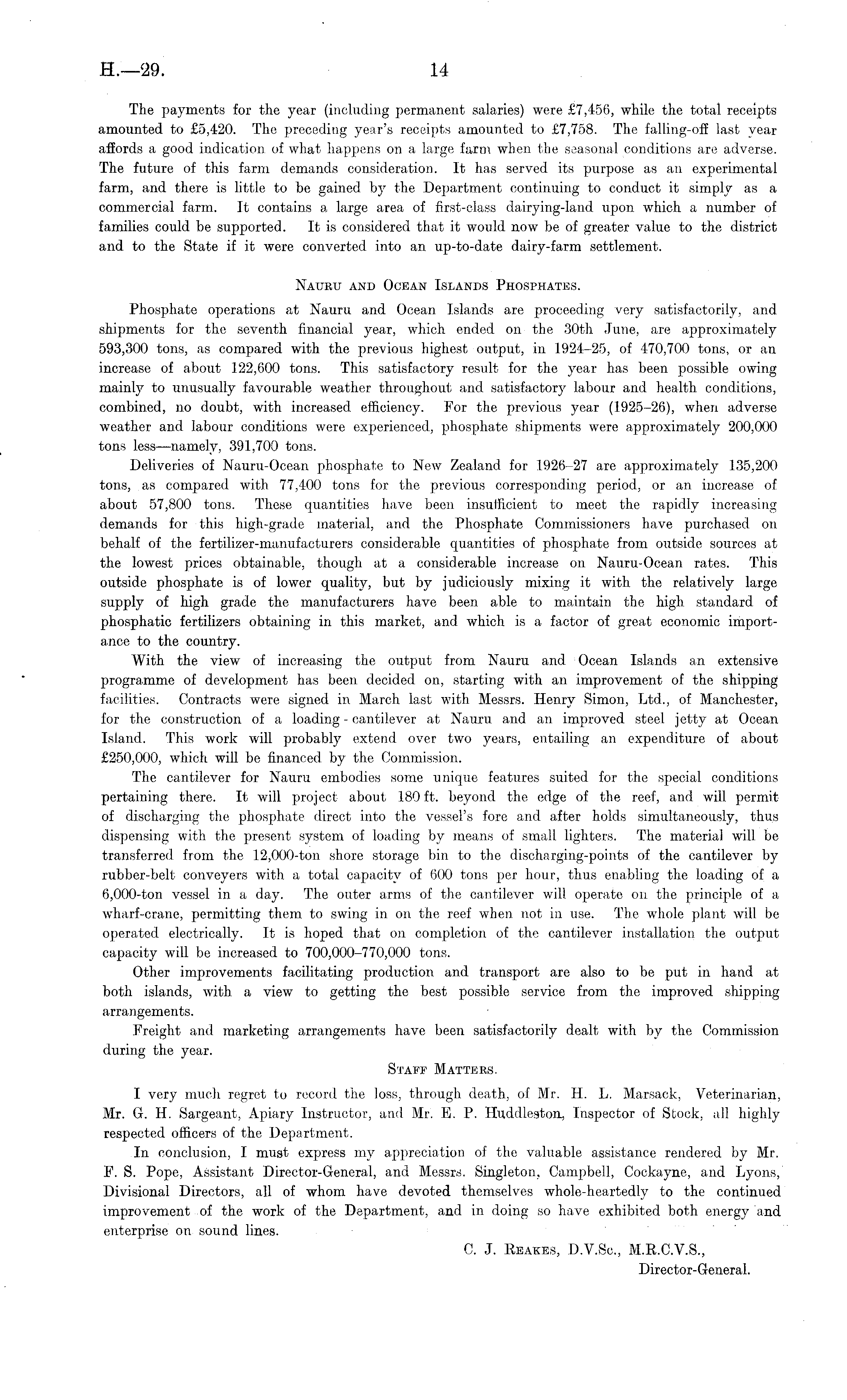 The payments for the year (including permanent salaries) were £7,456, while the total receipts amounted to £5,420. The preceding year's receipts amounted to £7,758. The falling-off last year affords a good indication, of what happens on a large farm when the seasonal conditions are adverse. The future of this farm demands consideration. It has served its purpose as an experimental farm, and there is little to be gained by the Department continuing to conduct it simply as a commercial farm. It contains a large area of first-class dairying-land upon which a number of families could be supported. It is considered that it would now be of greater value to the district and to the State if it were converted into an up-to-date dairy-farm settlement. Nauru and Ocean Islands Phosphates. Phosphate operations at Nauru and Ocean Islands are proceeding very satisfactorily, and shipments for the seventh financial year, which ended on the 30th June, are approximately 593,300 tons, as compared with the previous highest output, in 1924-25, of 470,700 tons, or an increase of about 122,600 tons. This satisfactory result for the year has been possible owing mainly to unusually favourable weather throughout and satisfactory labour and health conditions, combined, no doubt, with increased efficiency. For the previous year (1925-26), when adverse weather and labour conditions were experienced, phosphate shipments were approximately 200,000 tons less —namely, 391,700 tons. Deliveries of Nauru-Ocean phosphate to New Zealand for 1926-27 are approximately 135,200 tons, as compared with 77,400 tons for the previous corresponding period, or an increase of about 57,800 tons. These quantities have been insufficient to meet the rapidly increasing demands for this high-grade material, and the Phosphate Commissioners have purchased on behalf of the fertilizer-manufacturers considerable quantities of phosphate from outside sources at the lowest prices obtainable, though at a considerable increase on Nauru-Ocean rates. This outside phosphate is of lower quality, but by judiciously mixing it with the relatively large supply of high grade the manufacturers have been able to maintain the high standard of phosphatic fertilizers obtaining in this market, and which is a factor of great economic importance to the country. With the view of increasing the output from Nauru and Ocean Islands an extensive programme of development has been decided on, starting with an improvement of the shipping facilities. Contracts were signed in March last with Messrs. Henry Simon, Ltd., of Manchester, for the construction of a loading - cantilever at Nauru and an improved steel jetty at Ocean Island. This work will probably extend over two years, entailing an expenditure of about £250,000, which will be financed by the Commission. The cantilever for Nauru embodies some unique features suited for the special conditions pertaining there. It will project about 180 ft. beyond the edge of the reef, and will permit of discharging the phosphate direct into the vessel's fore and after holds simultaneously, thus dispensing with the present system of loading by means of small lighters. The material will be transferred from the 12,000-ton shore storage bin to the discharging-points of the cantilever by rubber-belt conveyers with a total capacity of 600 tons per hour, thus enabling the loading of a 6,000-ton vessel in a day. The outer arms of the cantilever will operate on the principle of a wharf-crane, permitting them to swing in on the reef when not in use. The whole plant will be operated electrically. It is hoped that on completion of the cantilever installation the output capacity will be increased to 700,000-770,000 tons. Other improvements facilitating production and transport are also to be put in hand at both islands, with a view to getting the best possible service from the improved shipping arrangements. Freight and marketing arrangements have been satisfactorily dealt with by the Commission during the year. Staff Matters. I very much regret to record the loss, through death, of Mr. H. L. Marsack, Veterinarian, Mr. G. H. Sargeant, Apiary Instructor, and Mr. E. P. Huddleston, Inspector of Stock, all highly respected officers of the Department. In conclusion, I must express my appreciation of the valuable assistance rendered by Mr. F. S. Pope, Assistant Director-General, and Messrs. Singleton, Campbell, Cockayne, and Lyons, Divisional Directors, all of whom have devoted themselves whole-heartedly to the continued improvement of the work of the Department, and in doing so have exhibited both energy and enterprise on sound lines. C. J. Reakes, D.V.Se., M.R.C.V.S., Director-General.