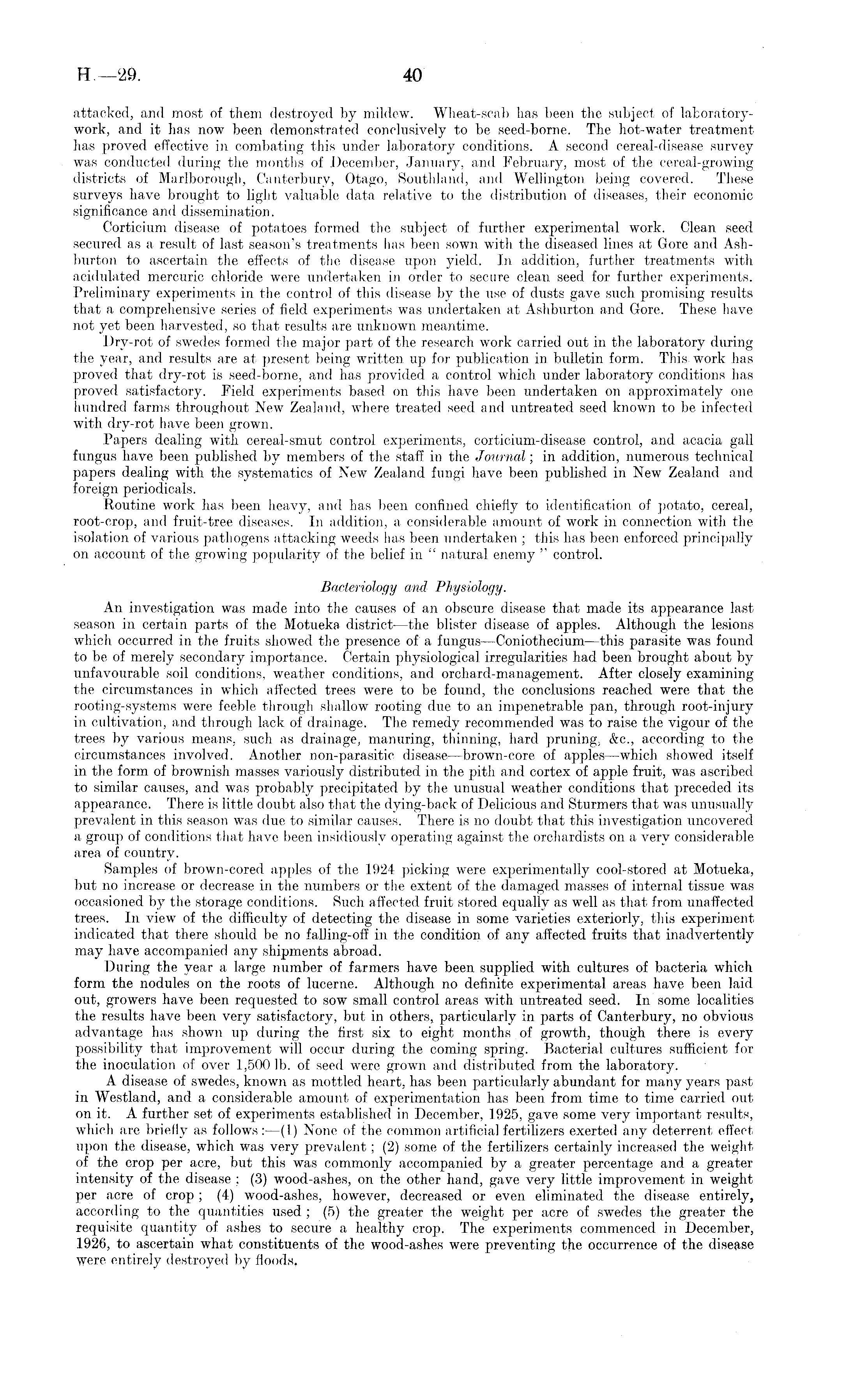 attacked, and most of them destroyed by mildew. Wheat-scab has been the subject of laboratorywork, and it has now been demonstrated conclusively to be seed-borne. The hot-water treatmenthas proved effective in combating this under laboratory conditions. A second cereal-disease survey was conducted during the months of December, January, and February, most of the cereal-growing districts of Marlborough, Canterbury, Otago, Southland, and Wellington being covered. These surveys have brought to light valuable data relative to the distribution of diseases, their economic significance and dissemination. Corticium disease of potatoes formed the subject of further experimental work. Clean seed secured as a result of last season's treatments has been sown with the diseased lines at Gore and Ashburton to ascertain the effects of the disease upon yield. In addition, further treatments with acidulated mercuric chloride were undertaken in order to secure clean seed for further experiments. Preliminary experiments in the control of this disease by the use of dusts gave such promising results that a comprehensive series of field experiments was undertaken at Ashburton and Gore. These have not yet been harvested, so that results are unknown meantime. Dry-rot of swedes formed the major part of the research work carried out in the laboratory during the year, and results are at present being written up for publication in bulletin form. This work has proved that dry-rot is seed-borne, and has provided a control which under laboratory conditions has proved satisfactory. Field experiments based on this have been undertaken on approximately one hundred farms throughout New Zealand, where treated seed and untreated seed known to be infected with dry-rot have been grown. Papers dealing with cereal-smut control experiments, corticium-disease control, and acacia gall fungus have been published by members of the staff in the Journal-, in addition, numerous technical papers dealing with the systematics of New Zealand fungi have been published in New Zealand and foreign periodicals. Routine work has been heavy, and has been confined chiefly to identification of potato, cereal, root-crop, and fruit-tree diseases. In addition, a considerable amount of work in connection with the isolation of various pathogens attacking weeds has been undertaken ; this has been enforced principally on account of the growing popularity of the belief in " natural enemy " control. Bacteriology and Physiology. An investigation was made into the causes of an obscure disease that made its appearance last season in certain parts of the Motueka district—the blister disease of apples. Although the lesions which occurred iti the fruits showed the presence of'a fungus—Coniothecium —this parasite was found to be of merely secondary importance. Certain physiological irregularities had been brought about by unfavourable soil conditions, weather conditions, and orchard-management. After closely examining the circumstances in which affected trees were to be found, the conclusions reached were that the rooting-systems were feeble through shallow rooting due to an impenetrable pan, through root-injury in cultivation, and through lack of drainage. The remedy recommended was to raise the vigour of the trees by various means, such as drainage, manuring, thinning, hard pruning, &c., according to the circumstances involved. Another non-parasitic disease —brown-core of apples —which showed itself in the form of brownish masses variously distributed in the pith and cortex of apple fruit, was ascribed to similar causes, and was probably precipitated by the unusual weather conditions that preceded its appearance. There is little doubt also that the dying-back of Delicious and Sturmers that was unusually prevalent in this season was due to similar causes. There is 110 doubt that this investigation uncovered a group of conditions that have been insidiously operating against the orchardists on a very considerable area of country. Samples of brown-cored apples of the 1924 picking were experimentally cool-stored at Motueka, but no increase or decrease in the numbers or the extent of the damaged masses of internal tissue was occasioned by the storage conditions. Such affected fruit stored equally as well as that from unaffected trees. 111 view of the difficulty of detecting the disease in some varieties exteriorly, this experiment indicated that there should be no falling-off in the condition of any affected fruits that inadvertently may have accompanied any shipments abroad. During the year a large number of farmers have been supplied with cultures of bacteria which form the nodules on the roots of lucerne. Although no definite experimental areas have been laid out, growers have been requested to sow small control areas with untreated seed. In some localities the results have been very satisfactory, but in others, particularly in parts of Canterbury, no obvious advantage has shown up during the first six to eight months of growth, though there is every possibility that improvement will occur during the coming spring. Bacterial cultures sufficient for the inoculation of over 1,500 lb. of seed were grown and distributed from the laboratory. A disease of swedes, known as mottled heart, has been particularly abundant for many years past in Westland, and a considerable amount of experimentation has been from time to time carried out on it. A further set of experiments established in December, 1925, gave some very important results, which are briefly as follows: —(1) None of the common artificial fertilizers exerted any deterrent effect upon the disease, which was very prevalent; (2) some of the fertilizers certainly increased the weight of the crop per acre, but this was commonly accompanied by a greater percentage and a greater intensity of the disease : (3) wood-ashes, on the other hand, gave very little improvement in weight per acre of crop ; (4) wood-ashes
