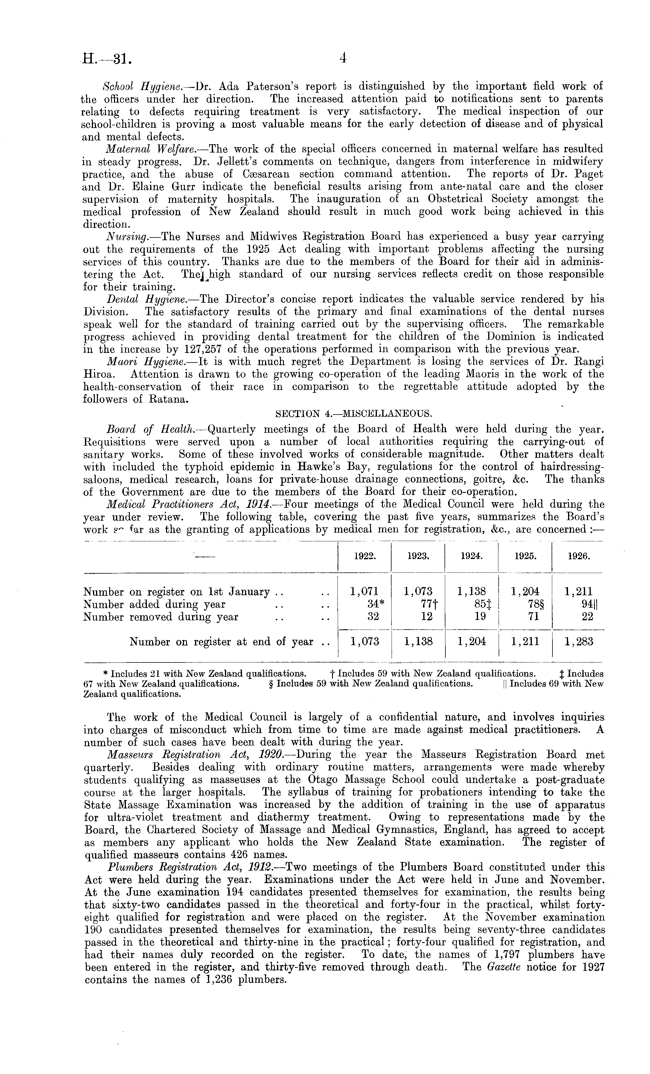 School Hygiene.—Dr. Ada Paterson's report is distinguished by the important field work of the officers under her direction. The increased attention paid to notifications sent to parents relating to defects requiring treatment is very satisfactory. The medical inspection of our school-children is proving a most valuable means for the early detection of disease and of physical and mental defects. Maternal Welfare. —The work of the special officers concerned in maternal welfare has resulted in steady progress. Dr. Jellett's comments on technique, dangers from interference in midwifery practice, and the abuse of Csesarean section command attention. The reports of Dr. Paget and Dr. Elaine Gurr indicate the beneficial results arising from ante-natal care and the closer supervision of maternity hospitals. The inauguration of an Obstetrical Society amongst the medical profession of New Zealand should result in much good work being achieved in this direction. Nursing.—The Nurses and Midwives Registration Board has experienced a busy year carrying out the requirements of the 1925 Act dealing with important problems affecting the nursing services of this country. Thanks are due to the members of the Board for their aid in administering the Act. Thejjiigh standard of our nursing services reflects credit on those responsible for their training. Dental Hygiene. —The Director's concise report indicates the valuable service rendered by his Division. The satisfactory results of the primary and final examinations of the dental nurses speak well for the standard of training carried out by the supervising officers. The remarkable progress achieved in providing dental treatment for the children of the Dominion is indicated in the increase by 127,257 of the operations performed in comparison with the previous year. Maori Hygiene. —It is with much regret the Department is losing the services of Dr. Rangi Hiroa. Attention is drawn to the growing co-operation of the leading Maoris in the work of the health-conservation of their race in comparison to the regrettable attitude adopted by the followers of Ratana. SECTION 4.—MISCELLANEOUS. Board of Health. —Quarterly meetings of the Board of Health were held during the year. Requisitions were served upon a number of local authorities requiring the carrying-out of sanitary works. Some of these involved works of considerable magnitude. Other matters dealt with included the typhoid epidemic in Hawke's Bay, regulations for the control of hairdressingsaloons, medical research, loans for private-house drainage connections, goitre, &c. The thanks of the Government are due to the members of the Board for their co-operation. Medical Practitioners Act, 1914. —Four meetings of the Medical Council were held during the year under review. The following table, covering the past five years, summarizes the Board's work *ar as the granting of applications by medical men for registration, &c., are concerned : —
