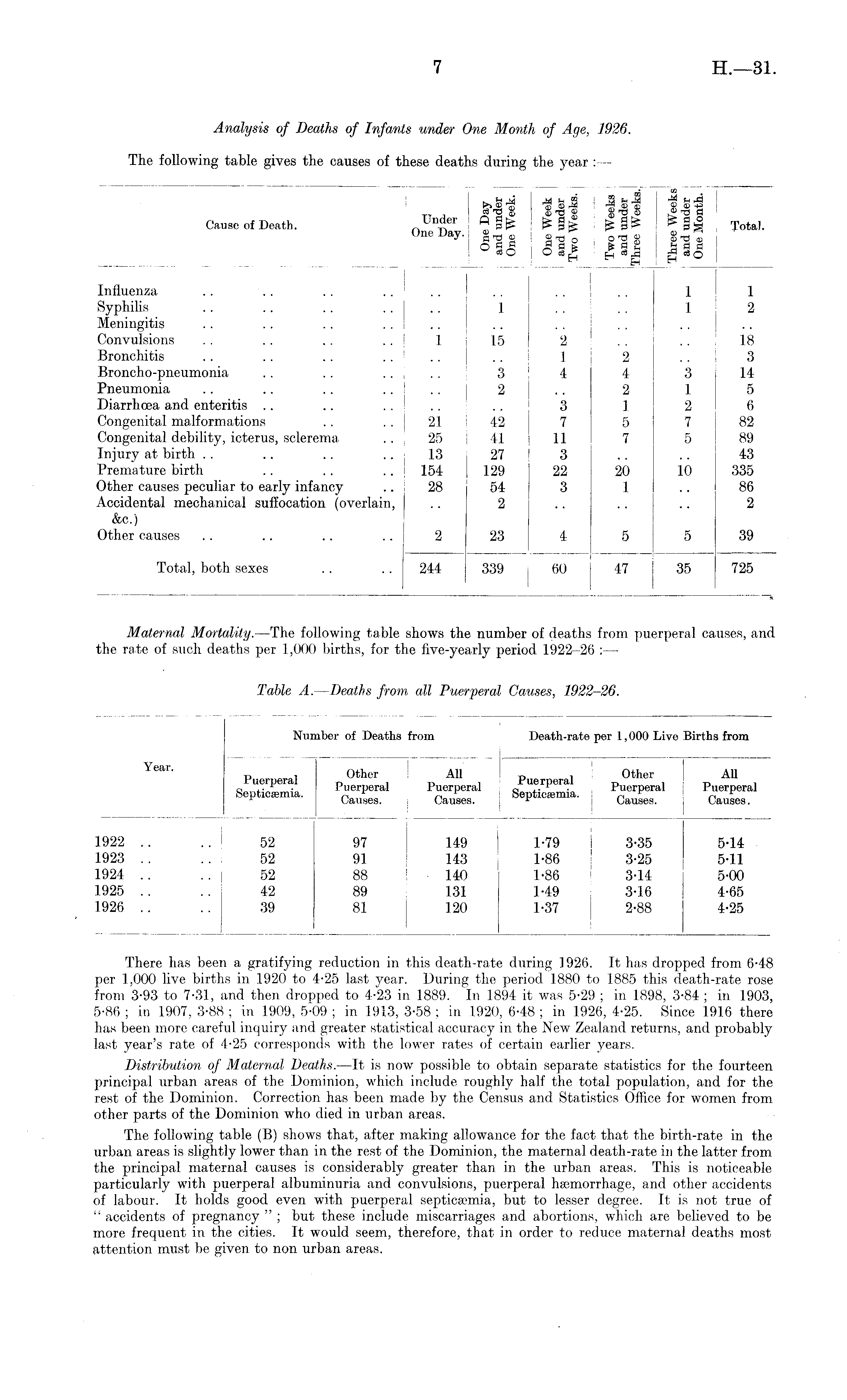 There has been a gratifying reduction in this death-rate during 1926. It has dropped from 6-48 per 1,000 live births in 1920 to 4-25 last year. During the period 1880 to 1885 this death-rate rose from 3-93 to 7-31, and then dropped to 4-23 in 1889. In 1894 it was 5-29 ; in 1898, 3-84 ; in 1903, 5-86 ; in 1907, 3-88 ; in 1909, 5-09 ; in 1913, 3-58 ; in 1920, 6-48 ; in 1926, 4-25. Since 1916 there lias been more careful inquiry and greater statistical accuracy in the New Zealand returns, and probably last year's rate of 4-25 corresponds with the lower rates of certain earlier years. Distribution of Maternal Deaths. —It is now possible to obtain separate statistics for the fourteen principal urban areas of the Dominion, which include roughly half the total population, and for the rest of the Dominion. Correction has been made by the Census and Statistics Office for women from other parts of the Dominion who died in urban areas. The following table (B) shows that, after making allowance for the fact that the birth-rate in the urban areas is slightly lower than in the rest of the Dominion, the maternal death-rate in the latter from the principal maternal causes is considerably greater than in the urban areas. This is noticeable particularly with puerperal albuminuria and convulsions, puerperal haemorrhage, and other accidents of labour. It holds good even with puerperal septica?mia, but to lesser degree. It is not true of " accidents of pregnancy " ; but these include miscarriages and abortions, which are believed to be more frequent in the cities. It would seem, therefore, that in order to reduce maternal deaths most attention must be given to non urban areas.
