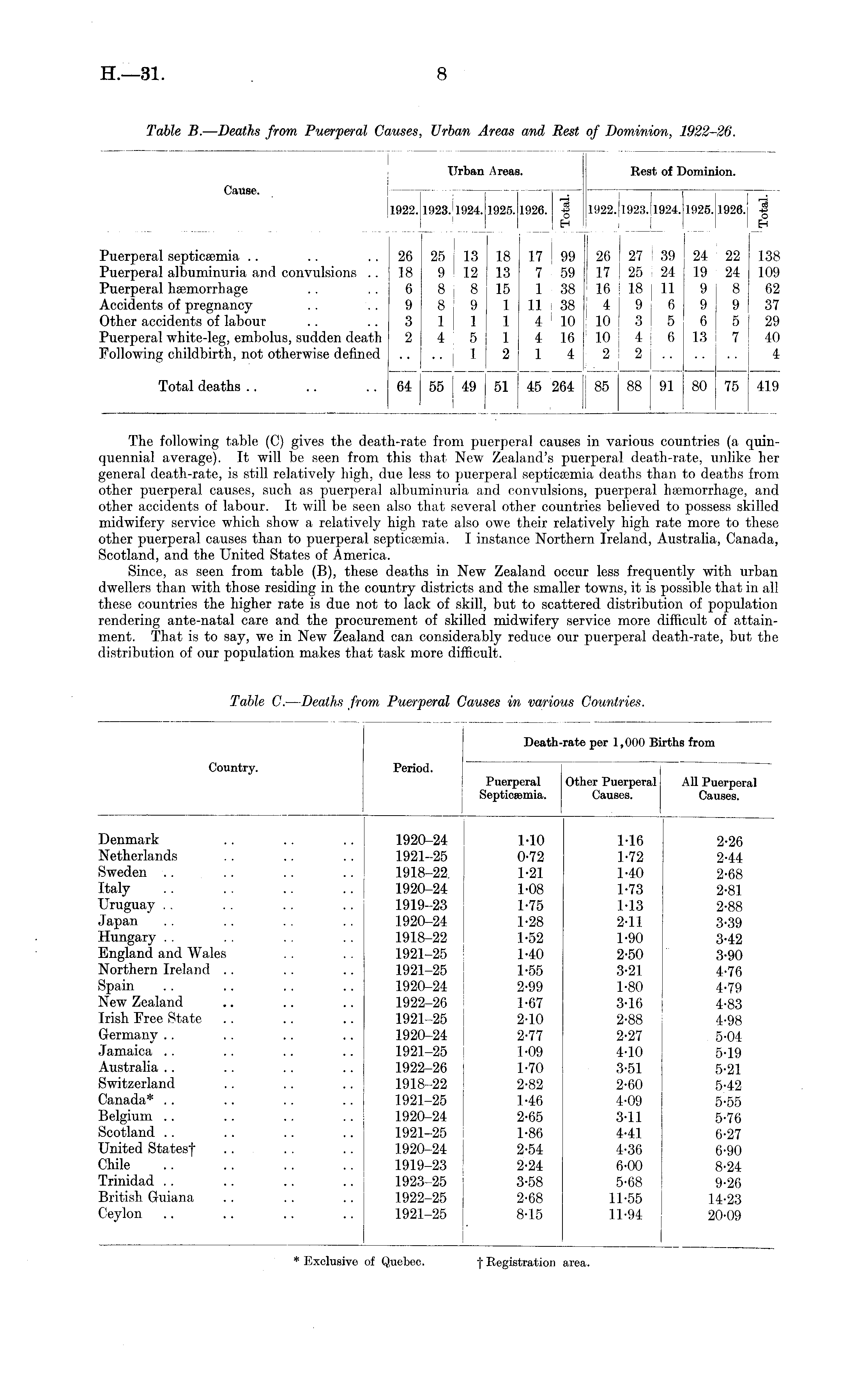 Table B.—Deaths from Puerperal Causes, Urban Areas and Rest of Dominion, 1922-26.