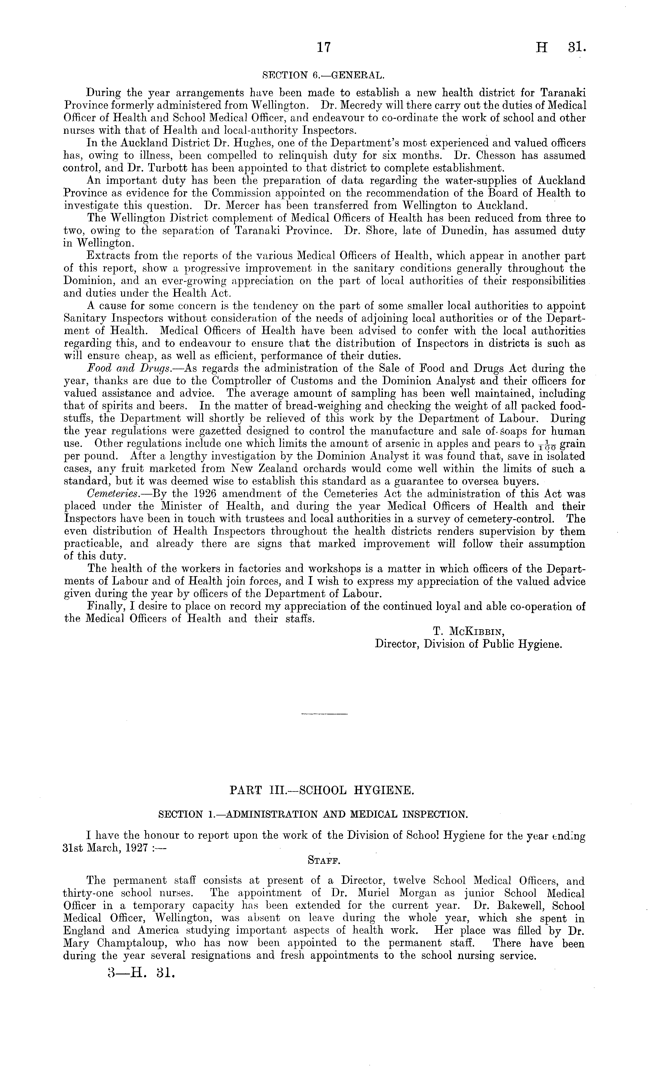 SECTION 6.—GENERAL. During the year arrangements have been made to establish a new health district for Taranaki Province formerly administered from Wellington. Dr. Mecredy will there carry out the duties of Medical Officer of Health and School Medical Officer, and endeavour to co-ordinate the work of school and other nurses with that of Health and local-authority Inspectors. In the Auckland District Dr. Hughes, one of the Department's most experienced and valued officers has, owing to illness, been compelled to relinquish duty for six months. Dr. Chesson has assumed control, and Dr. Turbott has been appointed to that district to complete establishment. An important duty has been the preparation of data regarding the water-supplies of Auckland Province as evidence for the Commission appointed on the recommendation of the Board of Health to investigate this question. Dr. Mercer has been transferred from Wellington to Auckland. The Wellington District complement of Medical Officers of Health has been reduced from three to two, owing to the separation of Taranaki Province. Dr. Shore, late of Dunedin, has assumed duty in Wellington. Extracts from the reports of the various Medical Officers of Health, which appear in another part of this report, show a progressive improvement in the sanitary conditions generally throughout the Dominion, and an ever-growing appreciation on the part of local authorities of their responsibilities and duties under the Health Act. A cause for some concern is the tendency on the part of some smaller local authorities to appoint Sanitary Inspectors without consideration of the needs of adjoining local authorities or of the Department of Health. Medical Officers of Health have been advised to confer with the local authorities regarding this, and to endeavour to ensure that the distribution of Inspectors in districts is such as will ensure cheap, as well as efficient, performance of their duties. Food and Drugs.—As regards the administration of the Sale of Eood and Drugs Act during the year, thanks are due to the Comptroller of Customs and the Dominion Analyst and their officers for valued assistance and advice. The average amount of sampling has been well maintained, including that of spirits and beers. In the matter of bread-weighing and checking the weight of all packed foodstuffs, the Department will shortly be relieved of this work by the Department of Labour. During the year regulations were gazetted designed to control the manufacture and sale of- soaps for human use. Other regulations include one which limits the amount of arsenic in apples and pears to grain per pound. After a lengthy investigation by the Dominion Analyst it was found that, save in isolated cases, any fruit marketed from New Zealand orchards would come well within the limits of such a standard, but it was deemed wise to establish this standard as a guarantee to oversea buyers. Cemeteries. —By the 1926 amendment of the Cemeteries Act the administration of this Act was placed under the Minister of Health, and during the year Medical Officers of Health and their Inspectors have been in touch with trustees and local authorities in a survey of cemetery-control. The even distribution of Health Inspectors throughout the health districts renders supervision by them practicable, and already there are signs that marked improvement will follow their assumption of this duty. The health of the workers in factories and workshops is a matter in which officers of the Departments of Labour and of Health join forces, and I wish to express my appreciation of the valued advice given during the year by officers of the Department of Labour. Finally, I desire to place on record my appreciation of the continued loyal and able co-operation of the Medical Officers of Health and their staffs. T. McKibbin, Director, Division of Public Hygiene.