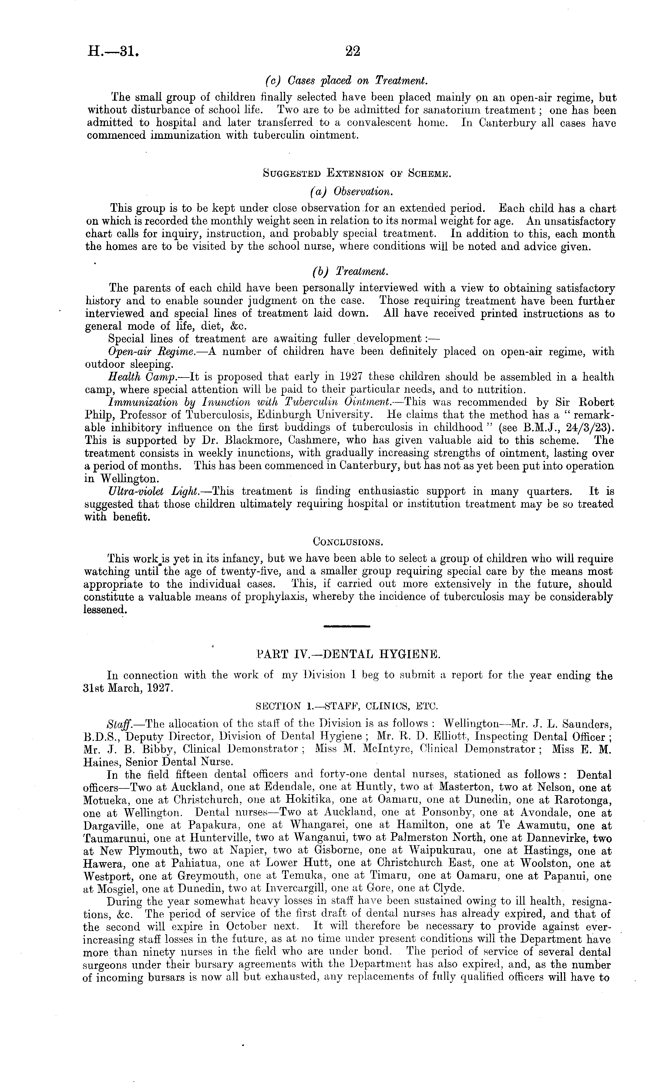 (o) Gases placed on Treatment. The small group of children finally selected have been placed mainly on an open-air regime, but without disturbance of school life. Two are to be admitted for sanatorium treatment; one has been admitted to hospital and later transferred to a convalescent home. In Canterbury all cases have commenced immunization with tuberculin ointment. Suggested Extension of Scheme. (a) Observation. This group is to be kept under close observation for an extended period. Each child has a chart on which is recorded the monthly weight seen in relation to its normal weight for age. An unsatisfactory chart calls for inquiry, instruction, and probably special treatment. In addition to this, each month the homes are to be visited by the school nurse, where conditions will be noted and advice given. (b) Treatment. The parents of each child have been personally interviewed with a view to obtaining satisfactory history and to enable sounder judgment on the case. Those requiring treatment have been further interviewed and special lines of treatment laid down. All have received printed instructions as to general mode of life, diet, &c. Special lines of treatment are awaiting fuller development:— Open-air Regime. —A number of children have been definitely placed on open-air regime, with outdoor sleeping. Health Camp.—Lt is proposed that early in 1927 these children should be assembled in a health camp, where special attention will be paid to their particular needs, and to nutrition. Immunization by Inunction with Tuberculin Ointment.—This was recommended by Sir Robert Philp, Professor of Tuberculosis, Edinburgh University. He claims that the method has a " remarkable inhibitory influence on the first buddings of tuberculosis in childhood " (see 8.M.J., 24/3/23). This is supported by Dr. Blackmore, Cashmere, who has given valuable aid to this scheme. The treatment consists in weekly inunctions, with gradually increasing strengths of ointment, lasting over a period of months. This has been commenced in Canterbury, but has not as yet been put into operation in Wellington. Ultra-violet Light. —This treatment is finding enthusiastic support in many quarters. It is suggested that those children ultimately requiring hospital or institution treatment may be so treated with benefit. Conclusions. This work_is yet in its infancy, but we have been able to select a group of children who will require watching until the age of twenty-five, and a smaller group requiring special care by the means most appropriate to the individual cases. This, if carried out more extensively in the future, should constitute a valuable means of prophylaxis, whereby the incidence of tuberculosis may be considerably lessened. PART IV.—DENTAL HYGIENE. In connection with the work of my Division I beg to submit a report for the year ending the 31st March, 1927. SECTION I.—STAFF, CLINICS, ETC. Staff. —The allocation of the staff of the Division is as follows : Wellington—Mr. J. L. Saunders, 8.D.5., Deputy Director, Division of Dental Hygiene ; Mr. R. D. Elliott, Inspecting Dental Officer ; Mr. J. B. Bibby, Clinical Demonstrator ; Miss M. Mclntyre, Clinical Demonstrator ; Miss E. M. Haines, Senior Dental Nurse. In the field fifteen dental officers and forty-one dental nurses, stationed as follows : Dental officers —Two at Auckland, one at Edendale, one at Huntly, two at Masterton, two at Nelson, one at Motueka, one at Christchurch, one at Hokitika, one at Oamaru, one at Dunedin, one at Rarotonga, one at Wellington. Dental nurses —Two at Auckland, one at Ponsonby, one at Avondale, one at Dargaville, one at Papakura, one at Whangarei, one at Hamilton, one at Te Awamutu, one at Taumarunui, one at Hunterville, two at Wanganui, two at Palmerston North, one at Dannevirke, two at New Plymouth, two at Napier, two at Gisborne, one at Waipukurau, one at Hastings, one at Hawera, one at Pakiatua, one at Lower Hutt, one at Christchurch East, one at Woolston, one at Westport, one at Greymouth, one at Temuka, one at Timaru, one at Oamaru, one at Papanui, one at Mosgiel, one at Dunedin, two at Invercargill, one at Gore, one at Clyde. During the year somewhat heavy losses in staff have been sustained owing to ill health, resignations, &c. The period of service of the first draft of dental nurses has already expired, and that of the second will expire in October next. It will therefore be necessary to provide against everincreasing staff losses in the future, as at no time under present conditions will the Department have more than ninety nurses in the field who are under bond. The period of service of several dental surgeons under their bursary agreements with the Department has also expired, and, as the number of incoming bursars is now all but exhausted, any replacements of fully qualified officers will, have to