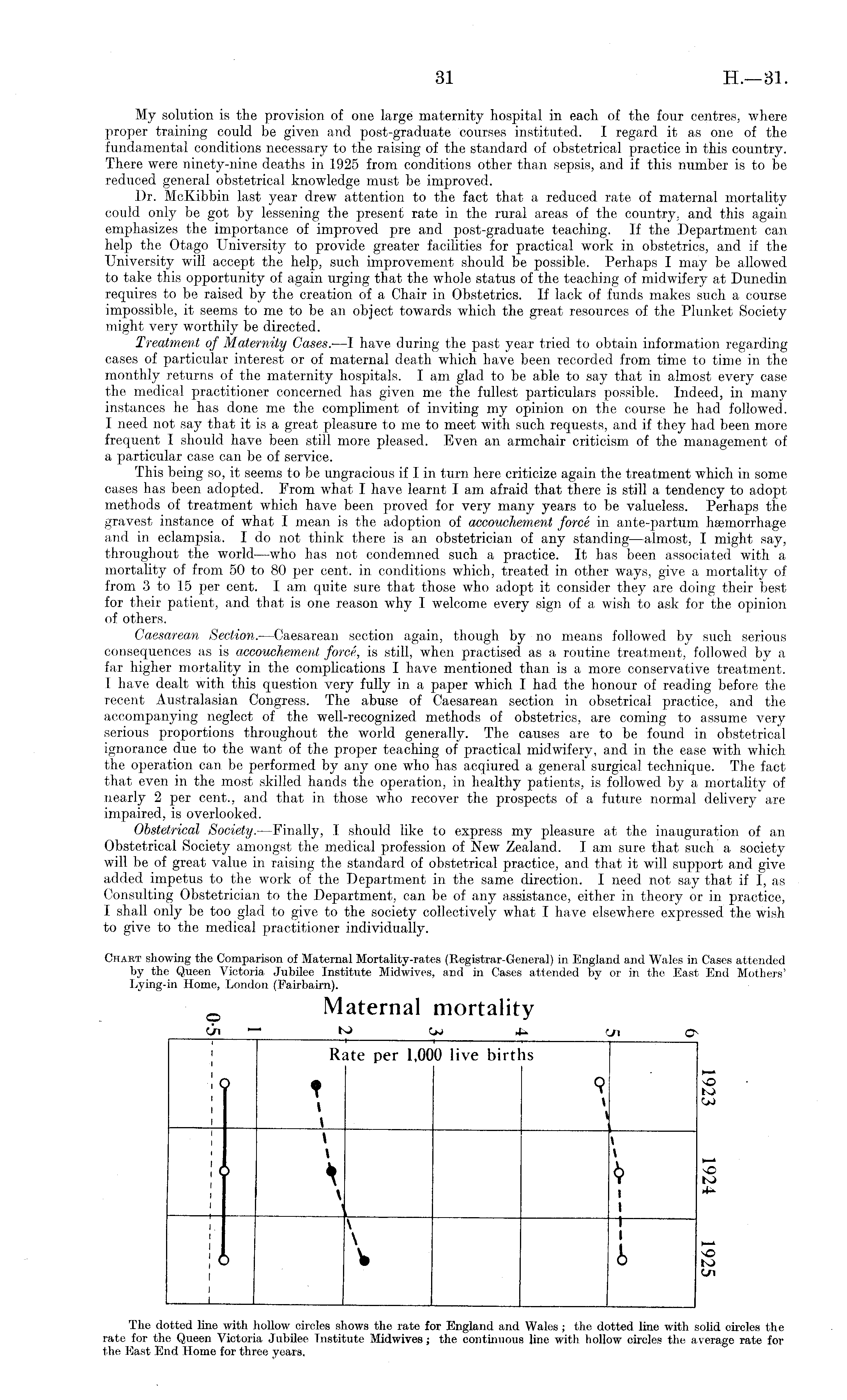 My solution is the provision of one large maternity hospital in each of the four centres, where proper training could be given and post-graduate courses instituted. I regard it as one of the fundamental conditions necessary to the raising of the standard of obstetrical practice in this country. There were ninety-nine deaths in 1925 from conditions other than sepsis, and if this number is to be reduced general obstetrical knowledge must be improved. Dr. McKibbin last year drew attention to the fact that a reduced rate of maternal mortality could only be got by lessening the present rate in the rural areas of the country, and this again emphasizes the importance of improved pre and post-graduate teaching. If the Department can help the Otago University to provide greater facilities for practical work in obstetrics, and if the University will accept the help, such improvement should be possible. Perhaps I may be allowed to take this opportunity of again urging that the whole status of the teaching of midwifery at Dunedin requires to be raised by the creation of a Chair in Obstetrics. If lack of funds makes such a course impossible, it seems to me to be an object towards which the great resources of the Plunket Society might very worthily be directed. Treatment of Maternity Cases.-—I have during the past year tried to obtain information regarding cases of particular interest or of maternal death which have been recorded from time to time in the monthly returns of the maternity hospitals. lam glad to be able to say that in almost every case the medical practitioner concerned has given me the fullest particulars possible. Indeed, in many instances he has done me the compliment of inviting my opinion on the course he had followed. I need not say that it is a great pleasure to me to meet with such requests, and if they had been more frequent I should have been still more pleased. Even an armchair criticism of the management of a particular case can be of service. This being so, it seems to be ungracious if I in turn here criticize again the treatment which in some cases has been adopted. From what I have learnt lam afraid that there is still a tendency to adopt methods of treatment which have been proved for very many years to be valueless. Perhaps the gravest instance of what I mean is the adoption of accouchement force in ante-partum haemorrhage and in eclampsia. I do not think there is an obstetrician of any standing—almost, I might say, throughout the world—who has not condemned such a practice. It has been associated with a mortality of from 50 to 80 per cent, in conditions which, treated in other ways, give a mortality of from 3to 15 per cent. lam quite sure that those who adopt it consider they are doing their best for their patient, and that is one reason why I welcome every sign of a wish to ask for the opinion of others. Caesarean Section.-—Caesarean section again, though by no means followed by such serious consequences as is accouchement force, is still, when practised as a routine treatment, followed by a far higher mortality in the complications I have mentioned than is a more conservative treatment. I have dealt with this question very fully in a paper which I had the honour of reading before the recent Australasian Congress. The abuse of Caesarean section in obsetrical practice, and the accompanying neglect of the well-recognized methods of obstetrics, are coming to assume very serious proportions throughout the world generally. The causes are to be found in obstetrical ignorance due to the want of the proper teaching of practical midwifery, and in the ease with which the operation can be performed by any one who has acqiured a general surgical technique. The fact that even in the most skilled hands the operation, in healthy patients, is followed by a mortality of nearly 2 per cent., and that in those who recover the prospects of a future normal delivery are impaired, is overlooked. Obstetrical Society.—Finally, I should like to express my pleasure at the inauguration of an Obstetrical Society amongst the medical profession of New Zealand. lam sure that such a society will be of great value in raising the standard of obstetrical practice, and that it will support and give added impetus to the work of the Department in the same direction. I need not say that if I, as Consulting Obstetrician to the Department, can be of any assistance, either in theory or in practice, I shall only be too glad to give to the society collectively what I have elsewhere expressed the wish to give to the medical practitioner individually. Chabt showing the Comparison of Maternal Mortality-rates (Registrar-General) in England and Wales in Cases attended by the Queen Victoria Jubilee Institute Midwives, and in Cases attended by or in the East End Mothers' Lying-in Home, London (Eairbairn).
