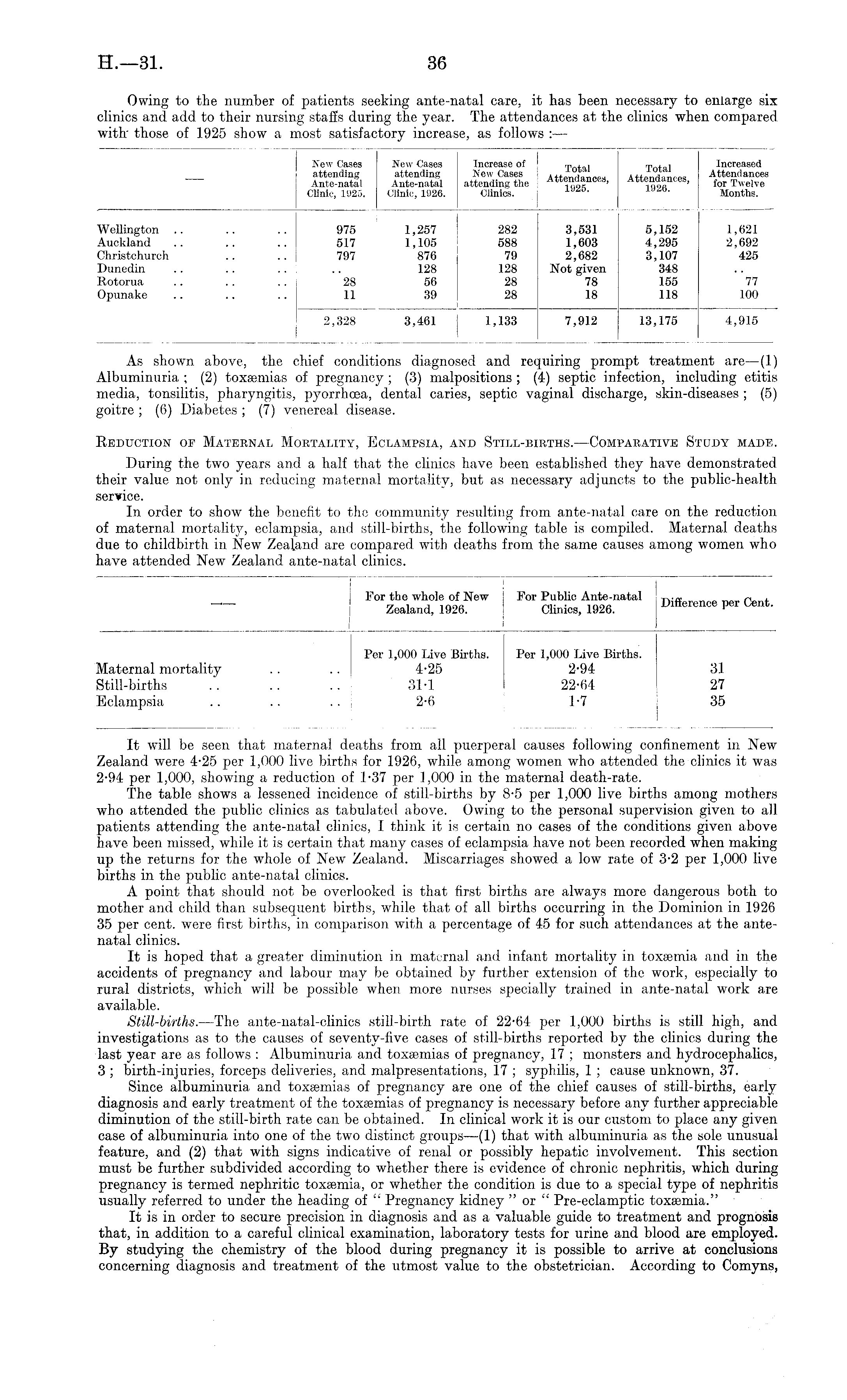 It will be seen that maternal deaths from all puerperal causes following confinement in New Zealand were 4-25 per 1,000 live births for 1926, while among women who attended the clinics it was 2-94 per 1,000, showing a reduction of 1-37 per 1,000 in the maternal death-rate. The table shows a lessened incidence of still-births by 8-5 per 1,000 live births among mothers who attended the public clinics as tabulated above. Owing to the personal supervision given to all patients attending the ante-natal clinics, I think it is certain no cases of the conditions given above have been missed, while it is certain that many cases of eclampsia have not been recorded when making up the returns for the whole of New Zealand. Miscarriages showed a low rate of 3-2 per 1,000 live births in the public ante-natal clinics. A point that should not be overlooked is that first births are always more dangerous both to mother and child than subsequent births, while that of all births occurring in the Dominion in 1926 35 per cent, were first births, in comparison with a percentage of 45 for such attendances at the antenatal clinics. It is hoped that a greater diminution in maternal and infant mortality in toxaemia and in the accidents of pregnancy and labour may be obtained by further extension of the work, especially to rural districts, which will be possible when more nurses specially trained in ante-natal work are available. Still-births.—The ante-natal-clinics still-birth rate of 22-64 per 1,000 births is still high, and investigations as to the causes of seventy-five cases of still-births reported by the clinics during the last year are as follows : Albuminuria and toxaemias of pregnancy, 17 ; monsters and hydrocephalics, 3 ; birth-injuries, forceps deliveries, and malpresentations, 17 ; syphilis, 1 ; cause unknown, 37. Since albuminuria and toxaemias of pregnancy are one of the chief causes of still-births, early diagnosis and early treatment of the toxasmias of pregnancy is necessary before any further appreciable diminution of the still-birth rate can be obtained. In clinical work it is our custom to place any given case of albuminuria into one of the two distinct groups —(1) that with albuminuria as the sole unusual feature, and (2) that with signs indicative of renal or possibly hepatic involvement. This section must be further subdivided according to whether there is evidence of chronic nephritis, which during pregnancy is termed nephritic toxaemia, or whether the condition is due to a special type of nephritis usually referred to under the heading of " Pregnancy kidney " or " Pre-eclamptic toxaemia." It is in order to secure precision in diagnosis and as a valuable guide to treatment and prognosis that, in addition to a careful clinical examination, laboratory tests for urine and blood are employed. By studying the chemistry of the blood during pregnancy it is possible to arrive at conclusions concerning diagnosis and treatment of the utmost value to the obstetrician. According to Comyns,