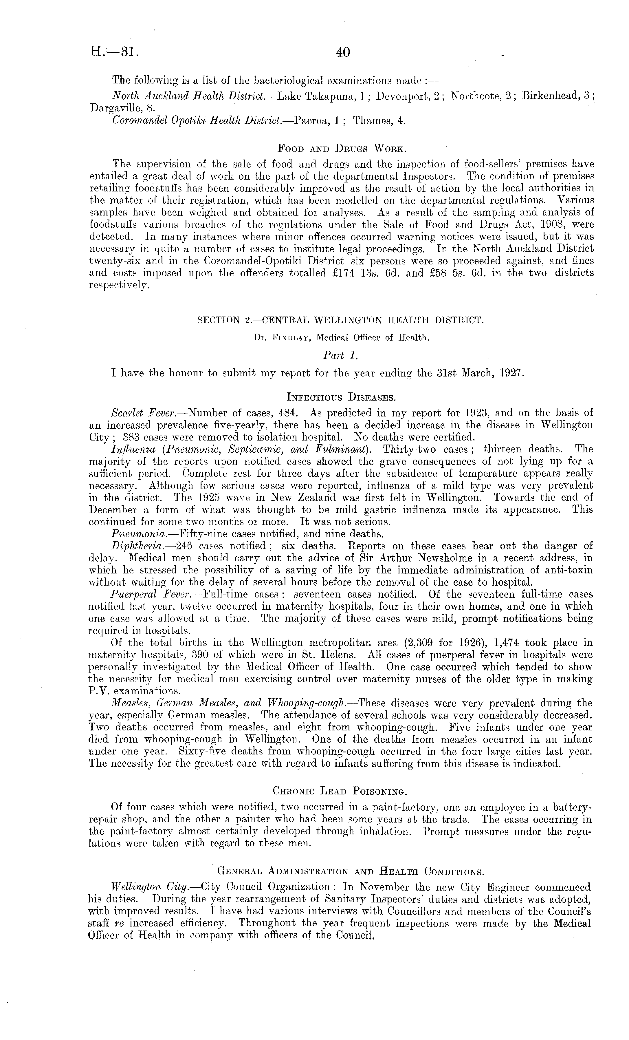 The following is a list of the bacteriological examinations made : — North Auckland Health District.—Lake Takapuna, 1 ; Devonport, 2 ; Northcote, 2; Birkenhead, 3 ; Dargaville, 8. Coromandel-Opotiki Health District.—Paeroa, 1 ; Thames, 4. Food and Drugs Work. The supervision of the sale of food and drugs and the inspection of food-sellers' premises have entailed a great deal of work on the part of the departmental Inspectors. The condition of premises retailing foodstuffs has been considerably improved as the result of action by the local authorities in the matter of their registration, which has been modelled on the departmental regulations. Various samples have been weighed and obtained for analyses. As a result of the sampling and analysis of foodstuffs various breaches of the regulations under the Sale of Food and Drugs Act, 1908, were detected. In many instances where minor offences occurred warning notices were issued, but it was necessary in quite a number of cases to institute legal proceedings. In the North Auckland District twenty-six and in the Coromandel-Opotiki District six persons were so proceeded against, and fines and costs imposed upon the offenders totalled £174 13s. 6d. and £58 ss. 6d. in the two districts respectively. SECTION 2.—CENTRAL WELLINGTON HEALTH DISTRICT. Dr. Findlay, Medical Officer of Health. Part 1. I have the honour to submit my report for the year ending the 31st March, 1927. Infectious Diseases. Scarlet Fever. —Number of cases, 484. As predicted in my report for 1923, and on the basis of an increased prevalence five-yearly, there has been a decided increase in the disease in Wellington City ; 383 cases were removed to isolation hospital. No deaths were certified. Influenza (Pneumonic, Septicemic, and Fulminant). —Thirty-two cases ; thirteen deaths. The majority of the reports upon notified cases showed the grave consequences of not lying up for a sufficient period. Complete rest for three days after the subsidence of temperature appears really necessary. Although few serious cases were reported, influenza of a mild type was very prevalent in the district. The 1925 wave in New Zealand was first felt in Wellington. Towards the end of December a form of what was thought to be mild gastric influenza made its appearance. This continued for some two months or more. It was not serious. Pneumonia. —Fifty-nine cases notified, and nine deaths. Diphtheria.—246 cases notified ; six deaths. Reports on these cases bear out the danger of delay. Medical men should carry out the advice of Sir Arthur Newsholme in a recent address, in which he stressed the possibility of a saving of life by the immediate administration of anti-toxin without waiting for the delay of several hours before the removal of the case to hospital. Puerperal Fever. —Full-time cases : seventeen cases notified. Of the seventeen full-time cases notified last year, twelve occurred in maternity hospitals, four in their own homes, and one in which one case was allowed at a time. The majority of these cases were mild, prompt notifications being required in hospitals. Of the total births in the Wellington metropolitan area (2,309 for 1926), 1,474 took place in maternity hospitals, 390 of which were in St. Helens. All cases of puerperal fever in hospitals were personally investigated by the Medical Officer of Health. One case occurred which tended to show the necessity for medical men exercising control over maternity nurses of the older type in making P.V. examinations. Measles, German Measles, and Whooping-cough.—These diseases were very prevalent during the year, especially German measles. The attendance of several schools was very considerably decreased. Two deaths occurred from measles, and eight from whooping-cough. Five infants under one year died from whooping-cough in Wellington. One of the deaths from measles occurred in an infant under one year. Sixty-five deaths from whooping-cough occurred in the four large cities last year. The necessity for the greatest care with regard to infants suffering from this disease is indicated. Chronic Lead Poisoning. Of four cases which were notified, two occurred in a paint-factory, one an employee in a batteryrepair shop, and the other a painter who had been some years at the trade. The cases occurring in the paint-factory almost certainly developed through inhalation. Prompt measures under the regulations were taken with regard to these men. General Administration and Health Conditions. Wellington City. —City Council Organization : In November the new City Engineer commenced his duties. During the year rearrangement of Sanitary Inspectors' duties and districts was adopted, with improved results. I have had various interviews with Councillors and members of the Council's staff re increased efficiency. Throughout the year frequent inspections were made by the Medical Officer of Health in company with officers of the Council.