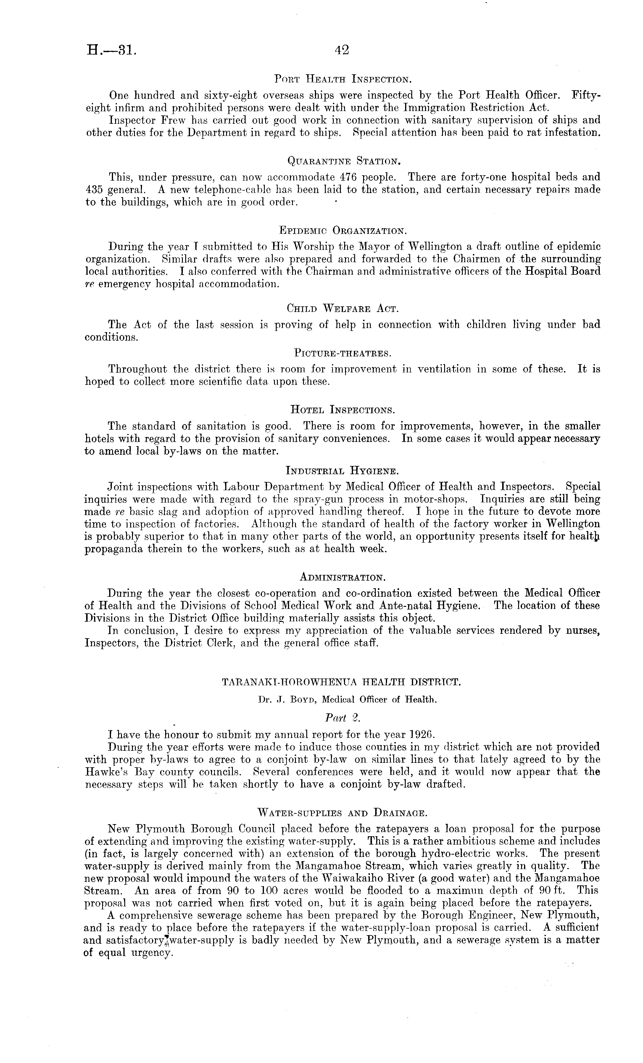 Port Health Inspection. One hundred and sixty-eight overseas ships were inspected by the Port Health Officer. Fiftyeight infirm and prohibited persons were dealt with under the Immigration Restriction Act. Inspector Frew has carried out good work in connection with sanitary supervision of ships and other duties for the Department in regard to ships. Special attention has been paid to rat infestation. Quarantine Station. This, under pressure, can now accommodate 476 people. There are forty-one hospital beds and 435 general. A new telephone-cable has been laid to the station, and certain necessary repairs made to the buildings, which are in good order. Epidemic Organization. During the year I submitted to His Worship the Mayor of Wellington a draft outline of epidemic organization. Similar drafts were also prepared and forwarded to the Chairmen of the surrounding local authorities. I also conferred with the Chairman and administrative officers of the Hospital Board re, emergency hospital accommodation. Child Welfare Act. The Act of the last session is proving of help in connection with children living under bad conditions. Picture-theatres. Throughout the district there is room for improvement in ventilation in some of these. It is hoped to collect more scientific data upon these. Hotel Inspections. The standard of sanitation is good. There is room for improvements, however, in the smaller hotels with regard to the provision of sanitary conveniences. In some cases it would appear necessary to amend local by-laws on the matter. Industrial Hygiene. Joint inspections with Labour Department by Medical Officer of Health and Inspectors. Special inquiries were made with regard to the spray-gun process in motor-shops. Inquiries are still being made re basic slag and adoption of approved handling thereof. I hope in the future to devote more time to inspection of factories. Although the standard of health of the factory worker in Wellington is probably superior to that in many other parts of the world, an opportunity presents itself for healtjj propaganda therein to the workers, such as at health week. Administration. During the year the closest co-operation and co-ordination existed between the Medical Officer of Health and the Divisions of School Medical Work and Ante-natal Hygiene. The location of these Divisions in the District Office building materially assists this object. In conclusion, I desire to express my appreciation of the valuable services rendered by nurses, Inspectors, the District Clerk, and the general office staff. TARANAKI-HOROWHENUA HEALTH DISTRICT. Dr. J. Boyd, Medical Officer of Health. Part 2. I have the honour to submit my annual report for the year ]926. During the year efforts were made to induce those counties in my district which are not provided with proper by-laws to agree to a conjoint by-law on similar lines to that lately agreed to by the Hawke's Bay county councils. Several conferences were held, and it would now appear that the necessary steps will be taken shortly to have a conjoint by-law drafted. Water-supplies and Drainage. New Plymouth Borough Council placed before the ratepayers a loan proposal for the purpose of extending and improving the existing water-supply. This is a rather ambitious scheme and includes (in fact, is largely concerned with) an. extension of the borough hydro-electric works. The present water-supply is derived mainly from the Mangamahoe Stream, which varies greatly in quality. The new proposal would impound the waters of the Waiwakaiho River (a good water) and the Mangamahoe Stream. An area of from 90 to 100 acres would be flooded to a maximun depth of 90 ft. This proposal was not carried when first voted on, but it is again being placed before the ratepayers. A comprehensive sewerage scheme has been prepared by the Borough Engineer, New Plymouth, and is ready to place before the ratepayers if the water-supply-loan proposal is carried. A sufficient and satisfactory|water-supply is badly needed by New Plymouth, and a sewerage system is a matter of equal urgency.