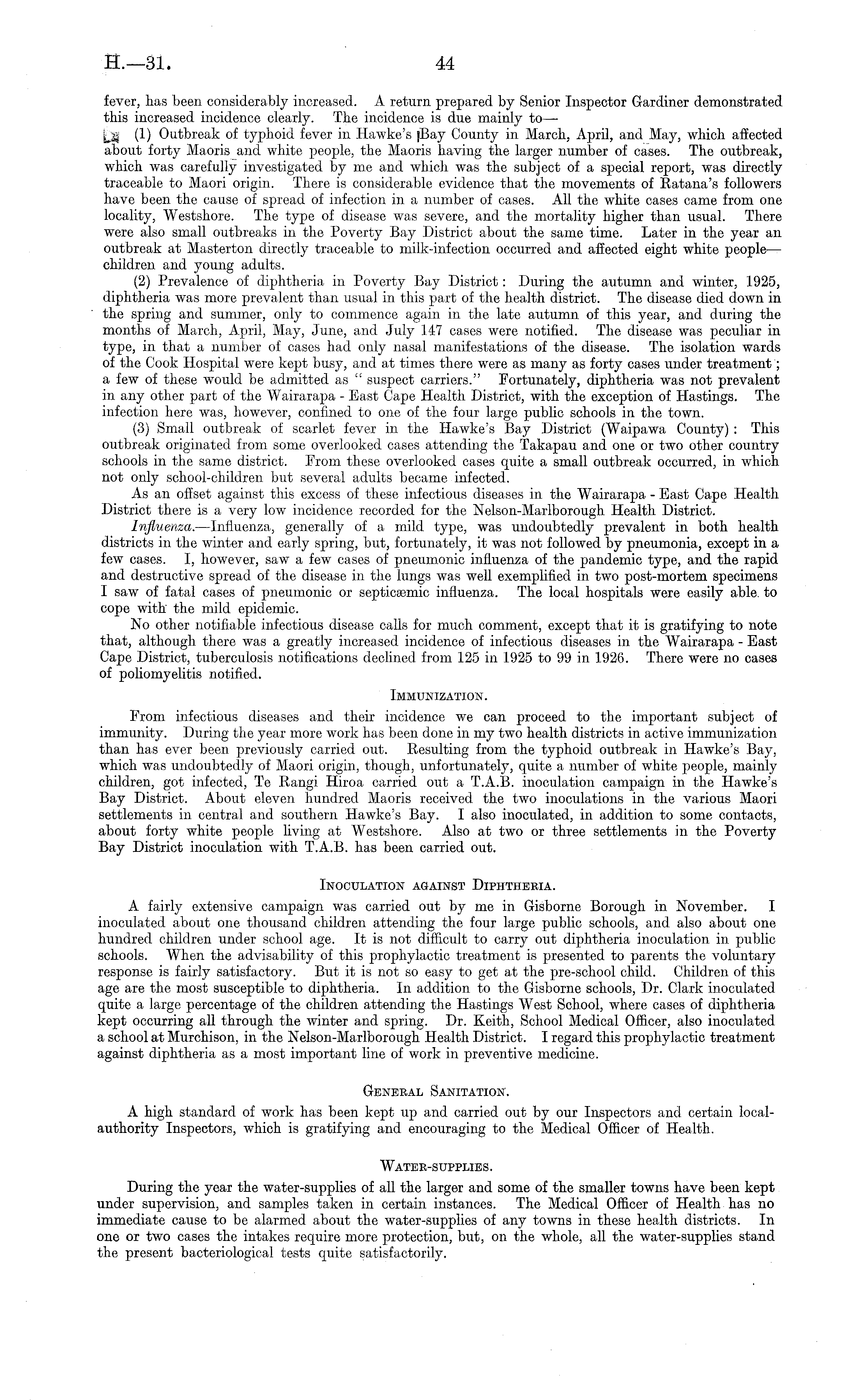 fever, has been considerably increased. A return prepared by Senior Inspector Gardiner demonstrated this increased incidence clearly. The incidence is due mainly to — pj (1) Outbreak of typhoid fever in Hawke's (Bay County in March, April, and May, which affected about forty Maoris and white people, the Maoris having the larger number of cases. The outbreak, which was carefully investigated by me and which was the subject of a special report, was directly traceable to Maori origin. There is considerable evidence that the movements of Ratana's followers have been the cause of spread of infection in a number of cases. All the white cases came from one locality, Westshore. The type of disease was severe, and the mortality higher than usual. There were also small outbreaks in the Poverty Bay District about the same time. Later in the year an outbreak at Masterton directly traceable to milk-infection occurred and affected eight white people— children and young adults. (2) Prevalence of diphtheria in Poverty Bay District: During the autumn and winter, 1925, diphtheria was more prevalent than usual in this part of the health district. The disease died down in the spring and summer, only to commence again in the late autumn of this year, and during the months of March, April, May, June, and July 147 cases were notified. The disease was peculiar in type, in that a number of cases had only nasal manifestations of the disease. The isolation wards of the Cook Hospital were kept busy, and at times there were as many as forty cases under treatment; a few of these would be admitted as " suspect carriers." Fortunately, diphtheria was not prevalent in any other part of the Wairarapa - East Cape Health District, with the exception of Hastings. The infection here was, however, confined to one of the four large public schools in the town. (3) Small outbreak of scarlet fever in the Hawke's Bay District (Waipawa County) : This outbreak originated from some overlooked cases attending the Takapau and one or two other country schools in the same district. From these overlooked cases quite a small outbreak occurred, in which not only school-children but several adults became infected. As an offset against this excess of these infectious diseases in the Wairarapa - East Cape Health District there is a very low incidence recorded for the Nelson-Marlborough Health District. Influenza. —Influenza, generally of a mild type, was undoubtedly prevalent in both health districts in the winter and early spring, but, fortunately, it was not followed by pneumonia, except in a few cases. I, however, saw a few cases of pneumonic influenza of the pandemic type, and the rapid and destructive spread of the disease in the lungs was well exemplified in two post-mortem specimens I saw of fatal cases of pneumonic or septicsemic influenza. The local hospitals were easily able, to cope with the mild epidemic. No other notifiable infectious disease calls for much comment, except that it is gratifying to note that, although there was a greatly increased incidence of infectious diseases in the Wairarapa - East Cape District, tuberculosis notifications declined from 125 in 1925 to 99 in 1926. There were no cases of poliomyelitis notified. Immunization. From infectious diseases and their incidence we can proceed to the important subject of immunity. During the year more work has been done in my two health districts in active immunization than has ever been previously carried out. Resulting from the typhoid outbreak in Hawke's Bay, which was undoubtedly of Maori origin, though, unfortunately, quite a number of white people, mainly children, got infected, Te Rangi Hiroa carried out a T.A.B. inoculation campaign in the Hawke's Bay District. About eleven hundred Maoris received the two inoculations in the various Maori settlements in central and southern Hawke's Bay. I also inoculated, in addition to some contacts, about forty white people living at Westshore. Also at two or three settlements in the Poverty Bay District inoculation with T.A.B. has been carried out. Inoculation against Diphtheria. A fairly extensive campaign was carried out by me in Gisborne Borough in November. I inoculated about one thousand children attending the four large public schools, and also about one hundred children under school age. It is not difficult to carry out diphtheria inoculation in public schools. When the advisability of this prophylactic treatment is presented to parents the voluntary response is fairly satisfactory. But it is not so easy to get at the pre-school child. Children of this age are the most susceptible to diphtheria. In addition to the Gisborne schools, Dr. Clark inoculated quite a large percentage of the children attending the Hastings West School, where cases of diphtheria kept occurring all through the winter and spring. Dr. Keith, School Medical Officer, also inoculated a school at Murchison, in the Nelson-Marlborough Health District. I regard this prophylactic treatment against diphtheria as a most important line of work in preventive medicine. General Sanitation. A high standard of work has been kept up and carried out by our Inspectors and certain localauthority Inspectors, which is gratifying and encouraging to the Medical Officer of Health. Water-supplies . During the year the water-supplies of all the larger and some of the smaller towns have been kept under supervision, and samples taken in certain instances. The Medical Officer of Health has no immediate cause to be alarmed about the water-supplies of any towns in these health districts. In one or two cases the intakes require more protection, but, on the whole, all the water-supplies stand the present bacteriological tests quite satisfactorily.