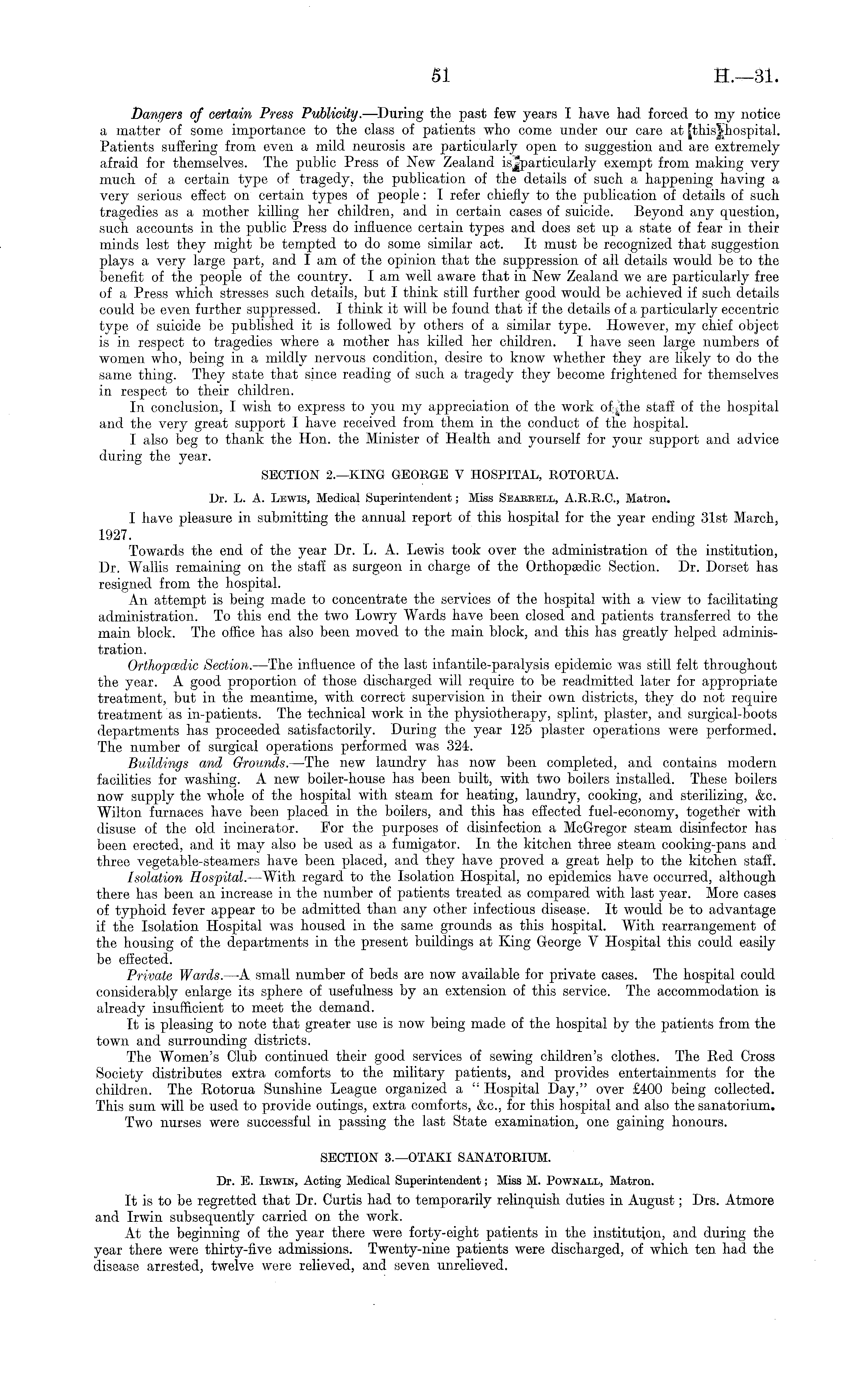 Dangers of certain Press Publicity. —During the past few years I have had forced to my notice a matter of some importance to the class of patients who come under our care at [thisjhospital. Patients suffering from even a mild neurosis are particularly open to suggestion and are extremely afraid for themselves. The public Press of New Zealand isjparticularly exempt from making very much of a certain type of tragedy, the publication of the details of such a happening having a very serious effect on certain types of people: I refer chiefly to the publication of details of such tragedies as a mother killing her children, and in certain cases of suicide. Beyond any question, such accounts in the public Press do influence certain types and does set up a state of fear in their minds lest they might be tempted to do some similar act. It must be recognized that suggestion plays a very large part, and I am of the opinion that the suppression of all details would be to the benefit of the people of the country. lam well aware that in New Zealand we are particularly free of a Press which stresses such details, but I think still further good would be achieved if such details could be even further suppressed. I think it will be found that if the details of a particularly eccentric type of suicide be published it is followed by others of a similar type. However, my chief object is in respect to tragedies where a mother has killed her children. I have seen large numbers of women who, being in a mildly nervous condition, desire to know whether they are likely to do the same thing. They state that since reading of such a tragedy they become frightened for themselves in respect to their children. In conclusion, I wish to express to you my appreciation of the work ofjthe staff of the hospital and the very great support I have received from them in the conduct of the hospital. I also beg to thank the Hon. the Minister of Health and yourself for your support and advice during the year. SECTION 2.—KING GEORGE V HOSPITAL, ROTORUA. Dr. L. A. Lewis, Medical Superintendent; Miss Searkell, A.R.R.C., Matron. I have pleasure in submitting the annual report of this hospital for the year ending 31st March, 1.927. Towards the end of the year Dr. L. A. Lewis took over the administration of the institution, Dr. Wallis remaining on the staff as surgeon in charge of the Orthopaedic Section. Dr. Dorset has resigned from the hospital. An attempt is being made to concentrate the services of the hospital with a view to facilitating administration. To this end the two Lowry Wards have been closed and patients transferred to the main block. The office has also been moved to the main block, and this has greatly helped administration. Orthopcedic Section. —The influence of the last infantile-paralysis epidemic was still felt throughout the year. A good proportion of those discharged will require to be readmitted later for appropriate treatment, but in the meantime, with correct supervision in their own districts, they do not require treatment as in-patients. The technical work in the physiotherapy, splint, plaster, and surgical-boots departments has proceeded satisfactorily. During the year 125 plaster operations were performed. The number of surgical operations performed was 324-. Buildings and Grounds. —The new laundry has now been completed, and contains modern facilities for washing. A new boiler-house has been built, with two boilers installed. These boilers now supply the whole of the hospital with steam for heating, laundry, cooking, and sterilizing, &c. Wilton furnaces have been placed in the boilers, and this has effected fuel-economy, together with disuse of the old incinerator. For the purposes of disinfection a McGregor steam disinfector has been erected, and it may also be used as a fumigator. In the kitchen three steam cooking-pans and three vegetable-steamers have been placed, and they have proved a great help to the kitchen staff. Isolation Hospital.—With regard to the Isolation Hospital, no epidemics have occurred, although there has been an increase in the number of patients treated as compared with last year. More cases of typhoid fever appear to be admitted than any other infectious disease. It would be to advantage if the Isolation Hospital was housed in the same grounds as this hospital. With rearrangement of the housing of the departments in the present buildings at King George V Hospital this could easily be effected. Private Wards. —A small number of beds are now available for private cases. The hospital could considerably enlarge its sphere of usefulness by an extension of this service. The accommodation is already insufficient to meet the demand. It is pleasing to note that greater use is now being made of the hospital by the patients from the town and surrounding districts. The Women's Club continued their good services of sewing children's clothes. The Red Cross Society distributes extra comforts to the military patients, and provides entertainments for the children. The Rotorua Sunshine League organized a " Hospital Day," over £400 being collected. This sum will be used to provide outings, extra comforts, &c., for this hospital and also the sanatorium. Two nurses were successful in passing the last State examination, one gaining honours. SECTION 3.—OTAKI SANATORIUM. Dr. E. Ikwin, Acting Medical Superintendent; Miss M. Pownall, Matron. It is to be regretted that Dr. Curtis had to temporarily relinquish duties in August; Drs. Atmore and Irwin subsequently carried on the work. At the beginning of the year there were forty-eight patients in the institution, and during the year there were thirty-five admissions. Twenty-nine patients were discharged, of which ten had the disease arrested, twelve were relieved, and seven unrelieved.