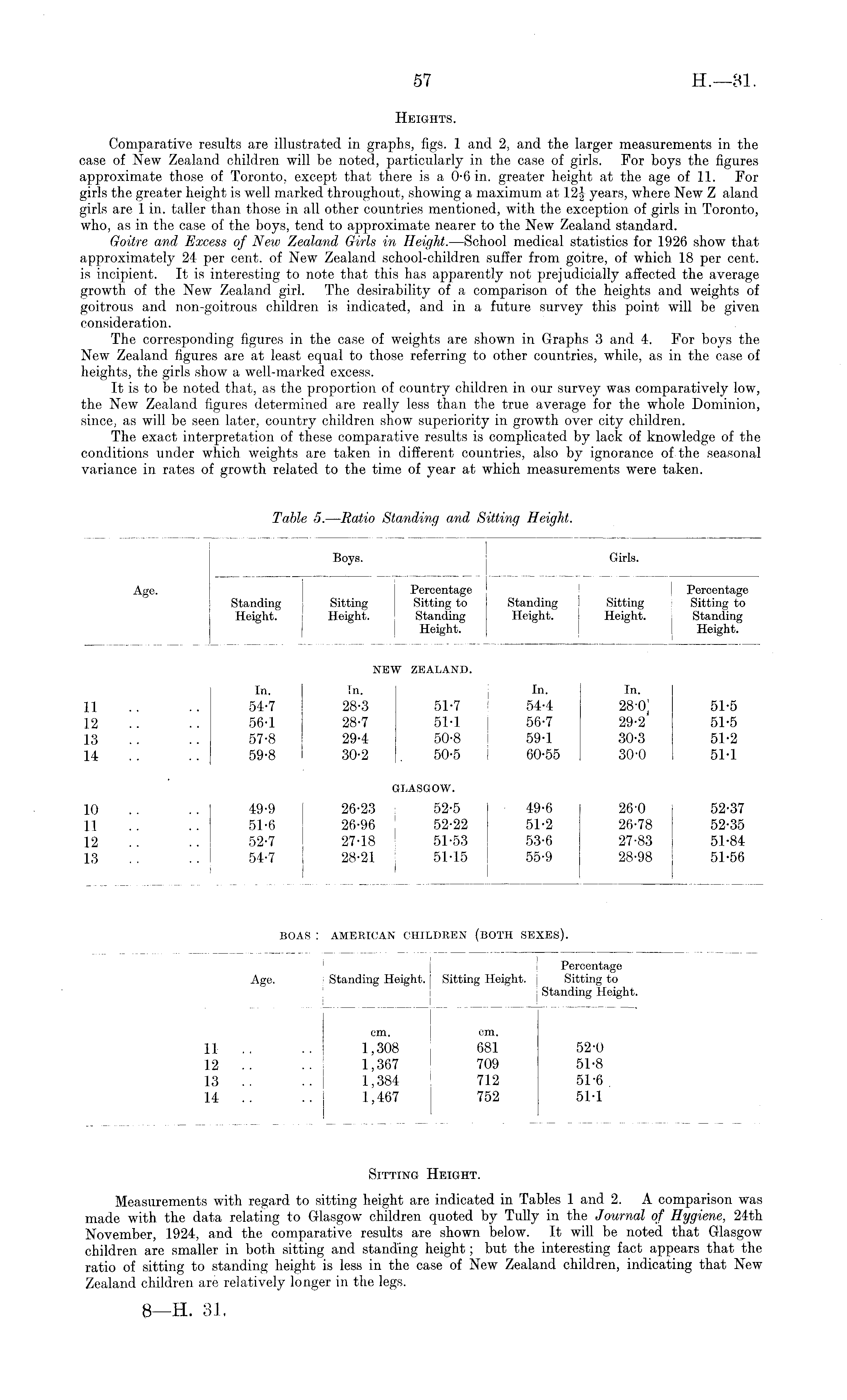 Sitting Height. Measurements with regard to sitting height are indicated in Tables 1 and 2. A comparison was made with the data relating to Glasgow children quoted by Tully in the Journal of Hygiene, 24th November, 1924, and the comparative results are shown below. It will be noted that Glasgow children are smaller in both sitting and standing height; but the interesting fact appears that the ratio of sitting to standing height is less in the case of New Zealand children, indicating that New Zealand children are relatively longer in the legs.