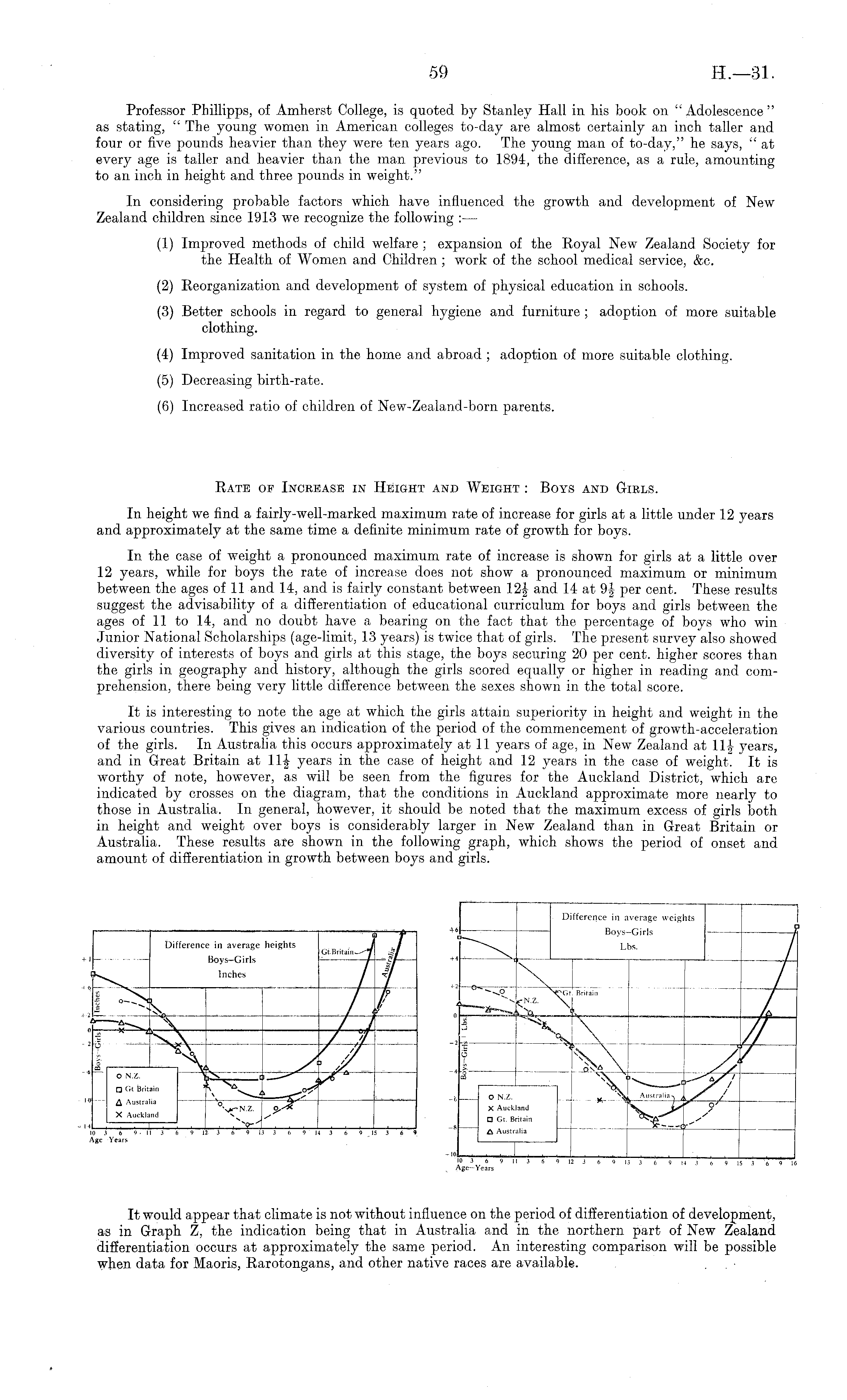 Professor Phillipps, of Amherst College, is quoted by Stanley Hall in his book on " Adolescence" as stating, " The young women in American colleges to-day are almost certainly an inch taller and four or five pounds heavier than they were ten years ago. The young man of to-day," he says, "at every age is taller and heavier than the man previous to 1894, the difference, as a rule, amounting to an inch in height and three pounds in weight." In considering probable factors which have influenced the growth and development of New Zealand children since 1913 we recognize the following : — (1) Improved methods of child welfare ; expansion of the Royal New Zealand Society for the Health of Women and Children ; work of the school medical service, &c. (2) Reorganization and development of system of physical education in schools. (3) Better schools in regard to general hygiene and furniture ; adoption of more suitable clothing. (4) Improved sanitation in the home and abroad ; adoption of more suitable clothing. (5) Decreasing birth-rate. (6) Increased ratio of children of New-Zealand-born parents. Rate of Increase in Height and Weight : Boys and Girls. In height we find a fairly-well-marked maximum rate of increase for girls at a little under 12 years and approximately at the same time a definite minimum rate of growth for boys. In the case of weight a pronounced maximum rate of increase is shown for girls at a little over 12 years, while for boys the rate of increase does not show a pronounced maximum or minimum between the ages of 11 and 14, and is fairly constant between 12| and 14 at 9f per cent. These results suggest the advisability of a differentiation of educational curriculum for boys and girls between the ages of 11 to 14, and no doubt have a bearing on the fact that the percentage of boys who win Junior National Scholarships (age-limit, 13 years) is twice that of girls. The present survey also showed diversity of interests of boys and girls at this stage, the boys securing 20 per cent, higher scores than the girls in geography and history, although the girls scored equally or higher in reading and comprehension, there being very little difference between the sexes shown in the total score. It is interesting to note the age at which the girls attain superiority in height and weight in the various countries. This gives an indication of the period of the commencement of growth-acceleration of the girls. In Australia this occurs approximately at 11 years of age, in New Zealand at llf years, and in Great Britain at 11-|- years in the case of height and 12 years in the case of weight. It is worthy of note, however, as will be seen from the figures for the Auckland District, which are indicated by crosses on the diagram, that the conditions in Auckland approximate more nearly to those in Australia. In general, however, it should be noted that the maximum excess of girls both in height and weight over boys is considerably larger in New Zealand than in Great Britain or Australia. These results are shown in the following graph, which shows the period of onset and amount of differentiation in growth between boys and girls.