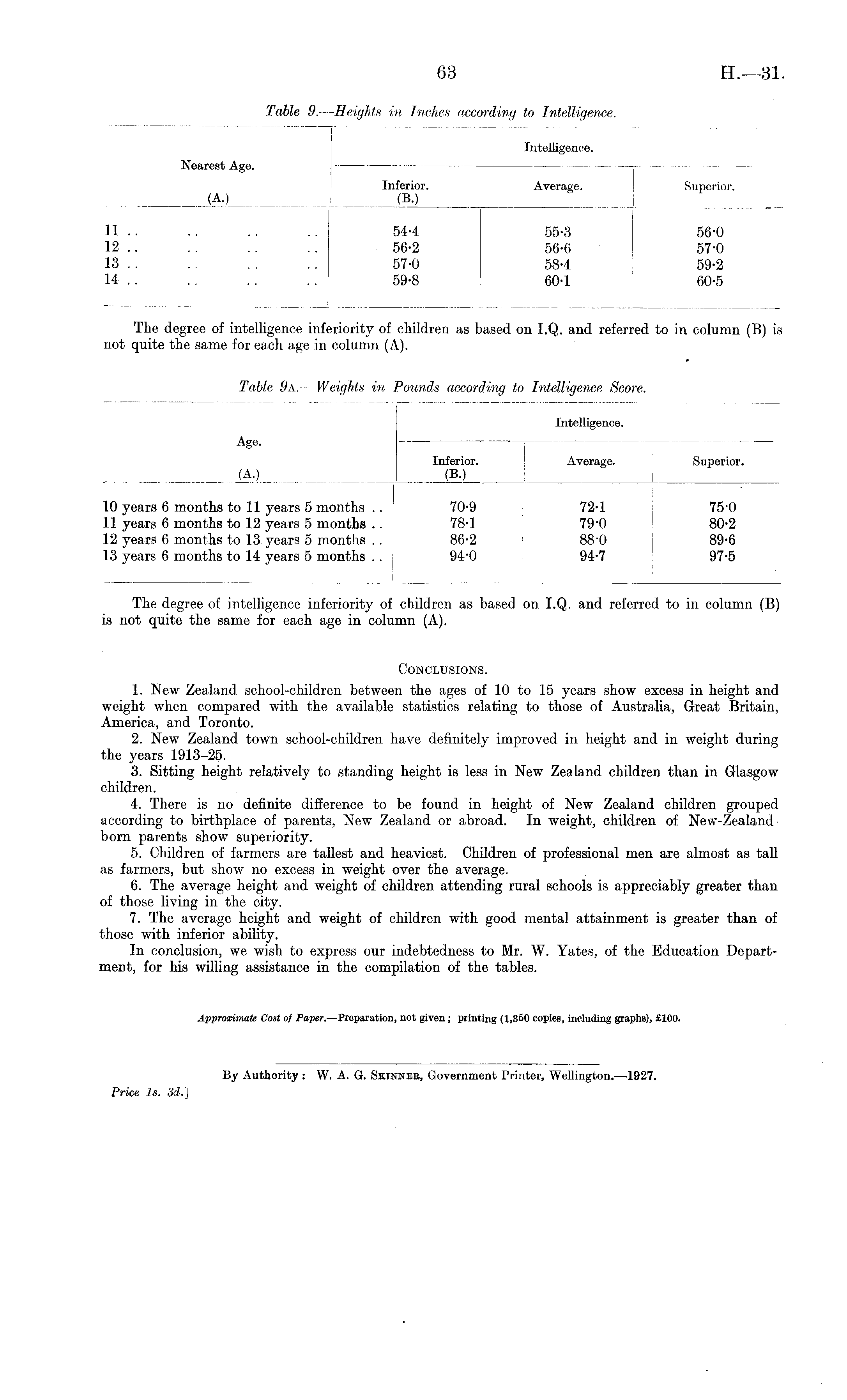 The degree of intelligence inferiority of children as based on I.Q. and referred to in column (B) is not quite the same for each age in column (A). Conclusions. 1. New Zealand school-children between the ages of 10 to 15 years show excess in height and weight when compared with the available statistics relating to those of Australia, Great Britain, America, and Toronto. 2. New Zealand town school-children have definitely improved in height and in weight during the years 1913-25. 3. Sitting height relatively to standing height is less in New Zealand children than in Glasgow children. 4. There is no definite difference to be found in height of New Zealand children grouped according to birthplace of parents, New Zealand or abroad. In weight, children of New-Zealand-born parents show superiority. 5. Children of farmers are tallest and heaviest. Children of professional men are almost as tall as farmers, but show no excess in weight over the average. 6. The average height and weight of children attending rural schools is appreciably greater than of those living in the city. 7. The average height and weight of children with good mental attainment is greater than of those with inferior ability. In conclusion, we wish to express our indebtedness to Mr. W. Yates, of the Education Department, for his willing assistance in the compilation of the tables.