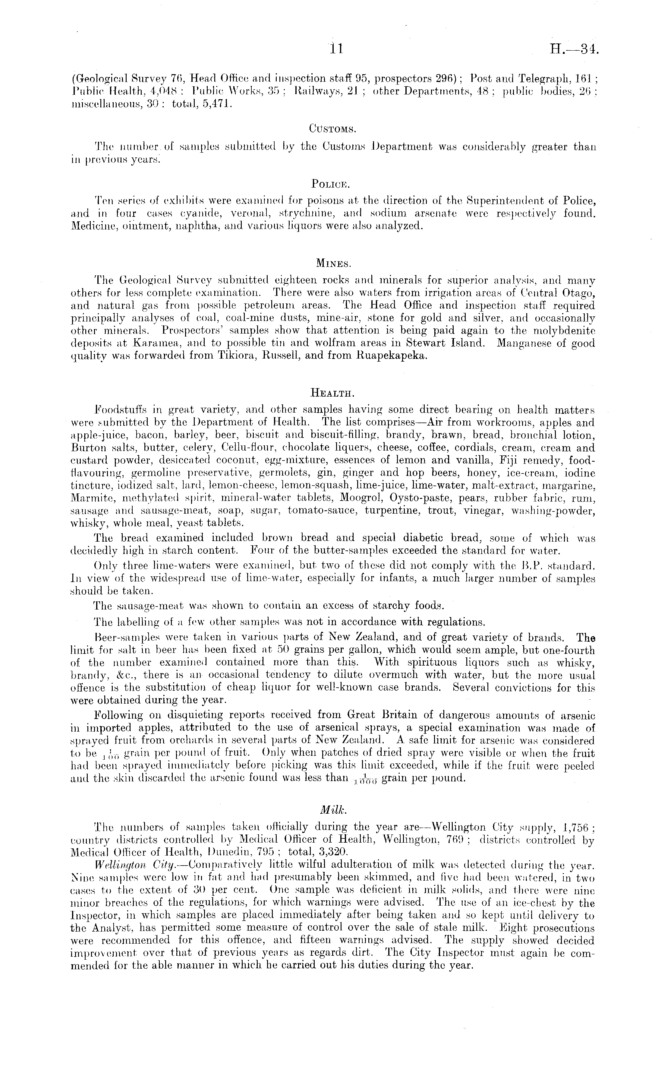 (Geological Survey 7(5, Head Office and inspection staff 95, prospectors 296); Post and Telegraph, 161; Public Health, 4,048 ; Public Works, 35 ; Railways, 21 ; other Departments, 48 ; public bodies, 26 ; miscellaneous, 30 : total, 5,471. Customs. The number , of samples submitted by the Customs Department was considerably greater than in previous years! Police. Ten series of exhibits were examined for poisons at the direction of the Superintendent of Police, and in four cases cyanide, veronal, strychnine, and sodium arsenate were respectively found. Medicine, ointment, naphtha, and various liquors were also analyzed. Mines. The Geological Survey submitted eighteen rocks and minerals for superior analysis, and many others for less complete examination. There were also waters from irrigation areas of Central Otago, and natural gas from possible petroleum areas. The Head Office and inspection staff required principally analyses of coal, coal-mine dusts, mine-air, stone for gold and silver, and occasionally other minerals. Prospectors' samples show that attention is being paid again to the molybdenite deposits at Karamea, and to possible tin and wolfram areas in Stewart Island. Manganese of good quality was forwarded from Tikiora, Russell, and from Ruapekapeka. Health. Foodstuffs in great variety, and other samples having some direct bearing on health matters were submitted by the Department of Health. The list comprises—Air from workrooms, apples and apple-juice, bacon, barley, beer, biscuit and biscuit-filling, brandy, brawn, bread, bronchial lotion, Burton salts, butter, celery, Cellu-flour, chocolate liquers, cheese, coffee, cordials, cream, cream and custard powder, desiccated coconut, egg-mixture, essences of lemon and vanilla, Fiji remedy, foodflavouring, germoline preservative, germolets, gin, ginger and hop beers, honey, ice-cream, iodine tincture, iodized salt, lard, lemon-cheese, lemon-squash, lime-juice, lime-water, malt-extract, margarine, Marmite, methylated spirit, mineral-water tablets, Moogrol, Oysto-paste, pears, rubber fabric, rum, sausage and sausage-meat, soap, sugar, tomato-sauce, turpentine, trout, vinegar, washing-powder, whisky, whole meal, yeast tablets. The bread examined included brown bread and special diabetic bread, some of which was decidedly high in starch content. Four of the butter-samples exceeded the standard for water. Only three lime-waters were examined, but two of these did not comply with the B.P. standard. In view of the widespread use of lime-water, especially for infants, a much larger number of samples should be taken. The sausage-meat was shown to contain an excess of starchy foods. The labelling of a few other samples was not in accordance with regulations. Beer-samples were taken in various parts of New Zealand, and of great variety of brands. The limit for salt in beer has been fixed at 50 grains per gallon, which would seem ample, but one-fourth of the number examined contained more than this. With spirituous liquors such as whiskv, brandy, &c., there is an occasional tendency to dilute overmuch with water, but the more usual offence is the substitution of cheap liquor for well-known case brands. Several convictions for this were obtained during the year. Following on disquieting reports received from Great Britain of dangerous amounts of arsenic in imported apples, attributed to the use of arsenical sprays, a special examination was made of sprayed fruit from orchards in several parts of New Zealand. A safe limit for arsenic was considered to be Y l )T) grain per pound of fruit. Only when patches of dried spray were visible or when the fruit had been sprayed immediately before picking was this limit exceeded, while if the fruit were peeled and the skin discarded the arsenic found was iess than grain per pound. Milk. The numbers of samples taken officially during the year are —Wellington City supply, 1,756 ; country districts controlled by Medical Officer of Health, Wellington, 769 ; districts controlled by Medical Officer of Health, Dunedin, 795 ; total, 3,320. Wellington City. —Comparatively little wilful adulteration of milk was detected during the year. Nine samples were low in fat and had presumably been skimmed, and five had been watered, in two cases to the extent of 30 per cent. One sample was deficient in milk solids, and there were nine minor breaches of the regulations, for which warnings were advised. The use of an ice-chest by the Inspector, in which samples are placed immediately after being taken and so kept until delivery to the Analyst, has permitted some measure of control over the sale of stale milk. Eight prosecutions were recommended for this offence, and fifteen warnings advised. The supply showed decided improvement over that of previous years as regards dirt. The City Inspector must again be commended for the able manner in which he carried out his duties during the year.