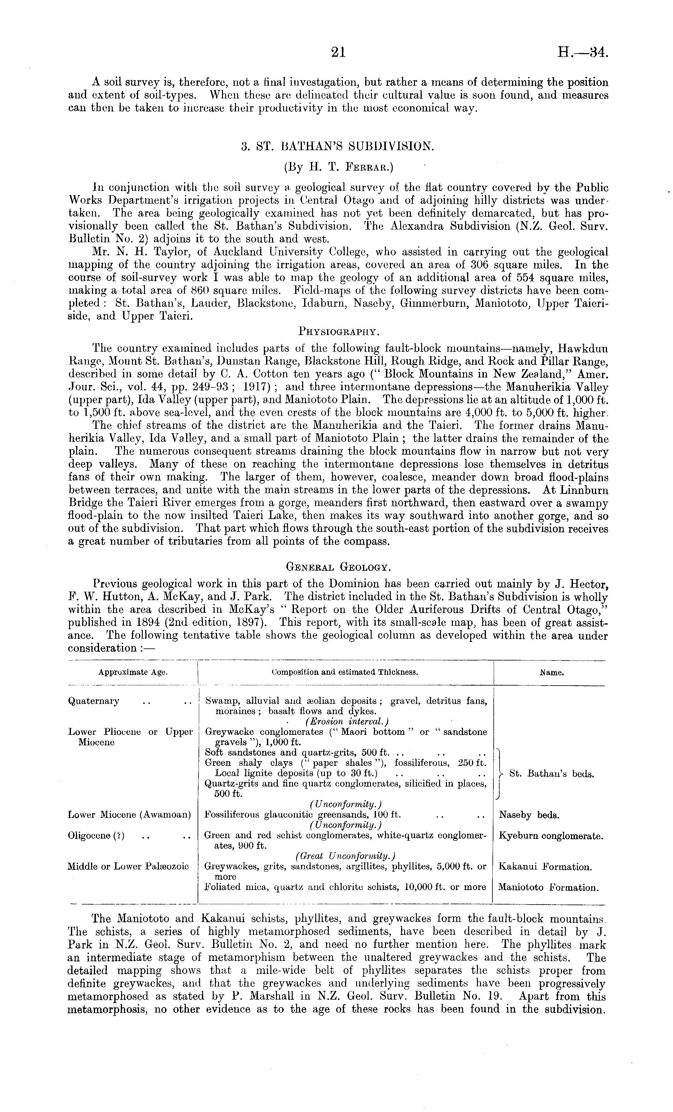 A soil survey is, therefore, not a final investigation, but rather a means of determining the position and extent of soil-types. When these are delineated their cultural value is soon found, and measures can then be taken to increase their productivity in the most economical way. 3. ST. BATHAN'S SUBDIVISION. (By H. T. Ferrar.) In conjunction with the soil survey a geological survey of the flat country covered by the Public Works Department's irrigation projects in Central Otago and of adjoining hilly districts was undertaken. The area being geologically examined has not yet been definitely demarcated, but has provisionally been called the St. Bathan's Subdivision. The Alexandra Subdivision (N.Z. Geol. Surv. Bulletin No. 2) adjoins it to the south and west. Mr. N. H. Taylor, of Auckland University College, who assisted in carrying out the geological mapping of the country adjoining the irrigation areas, covered an area of 306 square miles. In the course of soil-survey work I was able to map the geology of an additional area of 554 square miles, making a total area of 860 square miles. Field-maps of the following survey districts have been completed : St. Bathan's, Lauder, Blackstone, Idaburn, Naseby, Gimmerburn, Maniototo, Upper Taicriside, and Upper Taieri. Physiography. The country examined includes parts of the following fault-block mountains—namely, Hawkdxm Range, Mount St. Bathan's, Dunstan Range, Blackstone Hill, Rough Ridge, and Rock and Pillar Range, described in some detail by C. A. Cotton ten years ago (" Block Mountains in New Zealand," Amer. Jour. Sci., vol. 44, pp. 249-93 ; 1917) ; and three intermontane depressions —the Manuherikia Valley (upper part), Ida Valley (upper part), and Maniototo Plain. The depressions lie at an altitude of 1,000 ft. to 1,500 ft. a,bove sea-level, and the even crests of the block mountains are 4,000 ft. to 5,000 ft. higher. The chief streams of the district are the Manuherikia and the Taieri. The former drains Manuherikia Valley, Ida Valley, and a small part of Maniototo Plain ; the latter drains the remainder of the plain. The numerous consequent streams draining the block mountains flow in narrow but not very deep valleys. Many of these on reaching the intermontane depressions lose themselves in detritus fans of their own making. The larger of them, however, coalesce, meander down broad flood-plains between terraces, and unite with the main streams in the lower parts of the depressions. At Linnburn Bridge the Taieri River emerges from a gorge, meanders first northward, then eastward over a swampy flood-plain to the now insilted Taieri Lake, then makes its way southward into another gorge, and so out of the subdivision. That part which flows through the south-east portion of the subdivision receives a great number of tributaries from all points of the compass. General Geology. Previous geological work in this part of the Dominion has been carried out mainly by J. Hector, F. W. Hutton, A. McKay, and. J. Park. The district included in the St. Bathan's Subdivision is wholly within the area described in McKay's " Report on the Older Auriferous Drifts of Central Otago," published in 1894 (2nd edition, 1897). This report, with its small-scale map, has been of great assistance. The following tentative table shows the geological column as developed within the area under consideration: —