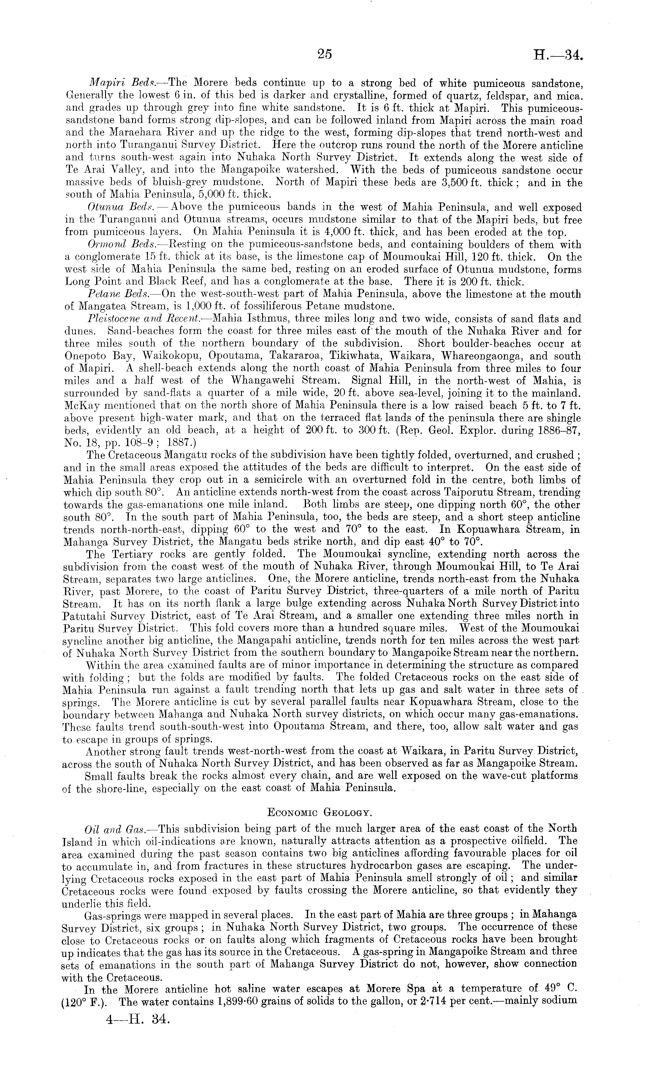 Mapiri Beds.—The Morere beds continue up to a strong bed of white pumiceous sandstone, Generally the lowest 6 in. of this bed is darker and crystalline, formed of quartz, feldspar, and mica, and grades up through grey into fine white sandstone. It is 6 ft. thick at Mapiri. This pumiceoussandstone band forms strong dip-slopes, and can be followed inland from Mapiri across the main road and the Maraehara River and up the ridge to the west, forming dip-slopes that trend north-west and north into Turanganui Survey District. Here the outcrop runs round the north of the Morere anticline and turns south-west again into Nuhaka North Survey District. It extends along the west side of Te Arai Valley, and into the Mangapoike watershed. With the beds of pumiceous sandstone occur massive beds of bluish-grev mudstone. North of Mapiri these beds are 3,500 ft. thick ; and in the south of Mahia Peninsula, 5,000 ft. thick. Otunua Bed*. —Above the pumiceous bands in the west of Mahia Peninsula, and well exposed in the Turanganui and Otunua streams, occurs mudstone similar to that of the Mapiri beds, but free from pumiceous layers. On Mahia Peninsula it is 4,000 ft. thick, and has been eroded at the top. Ormond Beds. —Resting on the pumiceous-sandstone beds, and containing boulders of them with a conglomerate 15 ft. thick at its base, is the limestone cap of Moumoukai Hill, 120 ft. thick. On the west side of Mahia Peninsula the same bed, resting on an eroded surface of Otunua mudstone, forms Long Point and Black Reef, and has a conglomerate at the base. There it is 200 ft. thick. Petane Beds. —On the west-south-west part of Mahia Peninsula, above the limestone at the mouth of Mangatea Stream, is 1,000 ft. of fossiliferous Petane mudstone. Pleistocene and Recent. —Mahia Isthmus, three miles long and two wide, consists of sand flats and dunes. Sand-beaches form the coast for three miles east of the mouth of the Nuhaka River and for three miles south of the northern boundary of the subdivision. Short boulder-beaches occur at Onepoto Bay, Waikokopu, Opoutama, Takararoa, Tikiwhata, Waikara, Whareongaonga, and south of Mapiri. A shell-beach extends along the north coast of Mahia Peninsula from three miles to four miles and a half west of the Whangawehi Stream. Signal Hill, in the north-west of Mahia, is surrounded by sand-flats a quarter of a mile wide, 20 ft. above sea-level, joining it to the mainland. McKay mentioned that on the north shore of Mahia Peninsula there is a low raised beach 5 ft. to 7 ft. above present high-water mark, and that on the terraced flat lands of the peninsula there are shingle beds, evident.lv an old beach, at a height of 200 ft. to 300 ft. (Rep. Geol. Explor. during 1886-87, No. 18, pp. 108-9 ; 1887.) The Cretaceous Mangatu rocks of the subdivision have been tightly folded, overturned, and crushed ; and in the small areas exposed the attitudes of the beds are difficult to interpret. On the east side of Mahia Peninsula they crop out in a semicircle with an overturned fold in the centre, both limbs of which dip south 80°. An anticline extends north-west from the coast across Taiporutu Stream, trending towards the gas-emanations one mile inland. Both limbs are steep, one dipping north 60°, the other south 80°. In the south part of Mahia Peninsula, too, the beds are steep, and a short steep anticline trends north-north-east, dipping 60° to the west and 70° to the east. In Kopuawhara Stream, in Mahanga Survey District, the Mangatu beds strike north, and dip east 40° to 70°. The Tertiary rocks are gently folded. The Moumoukai syncline, extending north across the subdivision from the coast west of the mouth of Nuhaka River, through Moumoukai Hill, to Te Arai Stream, separates two large anticlines. One, the Morere anticline, trends north-east from the Nuhaka River, past Morere, to the coast of Paritu Survey District, three-quarters of a mile north of Paritu Stream. It has on its north flank a large bulge extending across Nuhaka North Survey District into Patutahi Survey District, east of Te Arai Stream, and a smaller one extending three miles north in Pajitu Survey District. This fold covers more than a hundred square miles. West of the Moumoukai syncline another big anticline, the Mangapahi anticline, trends north for ten miles across the west part of Nuhaka North Survey District from the southern boundary to Mangapoike Stream near the northern. Within the area examined faults are of minor importance in determining the structure as compared with folding ; but the folds are modified by faults. The folded Cretaceous rocks on the east side of Mahia Peninsula run against a fault trending north that lets up gas and salt water in three sets of . springs. The Morere anticline is cut by several parallel faults near Kopuawhara Stream, close to the boundary between Mahanga and Nuhaka North survey districts, on which occur many gas-emanations. These faults trend south-south-west into Opoutama Stream, and there, too, allow salt water and gas to escape in groups of springs. Another strong fault trends west-north-west from the coast at Waikara, in Paritu Survey District, across the south of Nuhaka North Survey District, and has been observed as far as Mangapoike Stream. Small faults break the rocks almost every chain, and are well exposed on the wave-cut platforms of the shore-line, especially on the east coast of Mahia Peninsula. Economic Geology. Oil and Gas. —This subdivision being part of the much larger area of the east coast of the North Island in which oil-indications are known, naturally attracts attention as a prospective oilfield. The area examined during the past season contains two big anticlines affording favourable places for oil to accumulate in, and from fractures in these structures hydrocarbon gases are escaping. The underlying Cretaceous rocks exposed in the east part of Mahia Peninsula smell strongly of oil; and similar Cretaceous rocks were found exposed by faults c