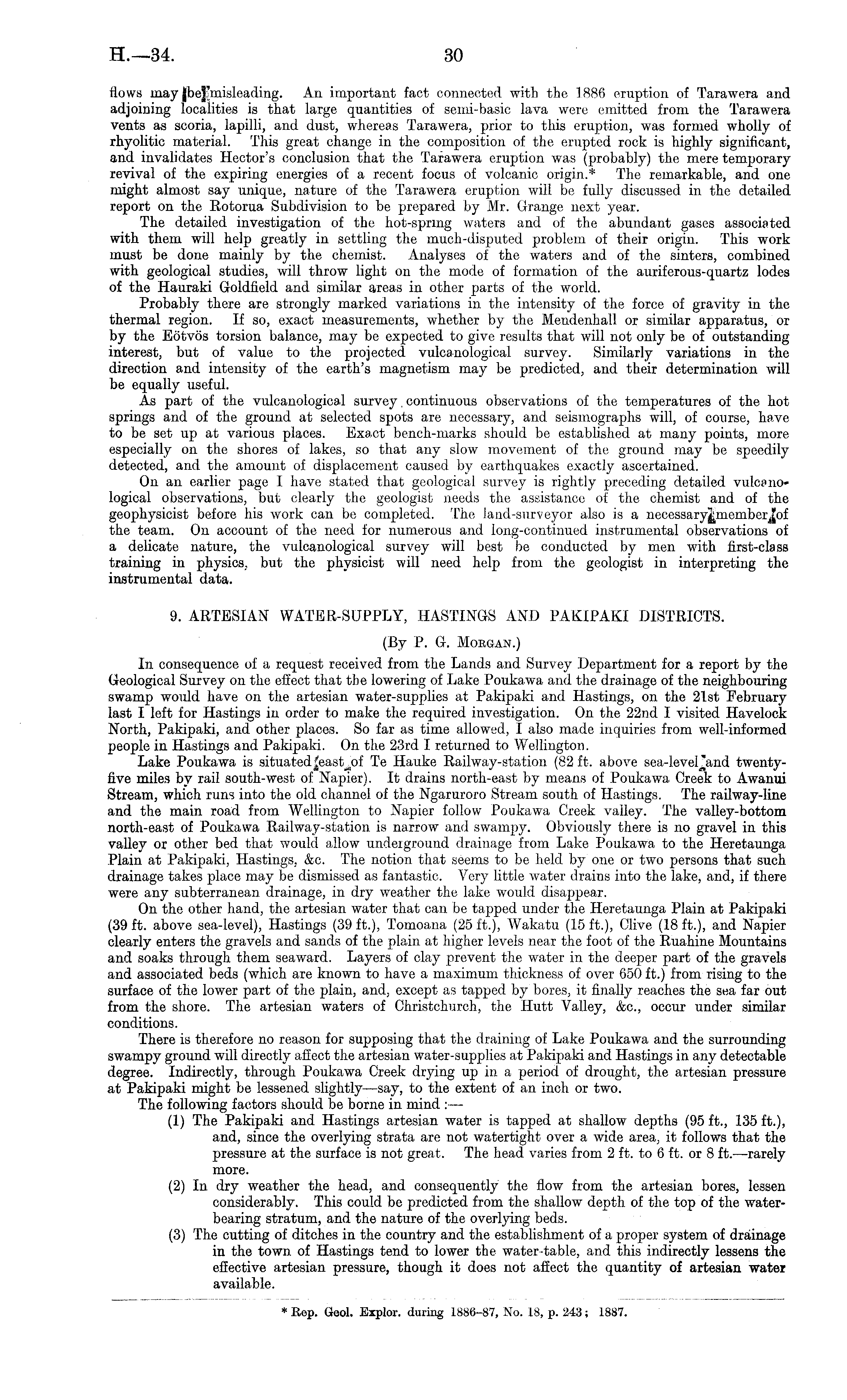 flows may |bejmisleading. An important fact connected with the 1886 eruption of Tarawera and adjoining localities is that large quantities of semi-basic lava were emitted from the Tarawera vents as scoria, lapilli, and dust, whereas Tarawera, prior to this eruption, was formed wholly of rhyolitic material. This great change in the composition of the erupted rock is highly significant, and invalidates Hector's conclusion that the Tarawera eruption was (probably) the mere temporary revival of the expiring energies of a recent focus of volcanic origin.* The remarkable, and one might almost say unique, nature of the Tarawera eruption will be fully discussed in the detailed report on the Rotorua Subdivision to be prepared by Mr. Grange next year. The detailed investigation of the hot-spring waters and of the abundant gases associated with them will help greatly in settling the much-disputed problem of their origin. This work must be done mainly by the chemist. Analyses of the waters and of the sinters, combined with geological studies, will throw light on the mode of formation of the auriferous-quartz lodes of the Hauraki Goldfield and similar areas in other parts of the world. Probably there are strongly marked variations in the intensity of the force of gravity in the thermal region. If so, exact measurements, whether by the Mendenhall or similar apparatus, or by the Eotvos torsion balance, may be expected to give results that will not only be of outstanding interest, but of value to the projected vulcanological survey. Similarly variations in the direction and intensity of the earth's magnetism may be predicted, and their determination will be equally useful. As part of the vulcanological survey, continuous observations of the temperatures of the hot springs and of the ground at selected spots are necessary, and seismographs will, of course, have to be set up at various places. Exact bench-marks should be established at many points, more especially on the shores of lakes, so that any slow movement of the ground may be speedily detected, and the amount of displacement caused by earthquakes exactly ascertained. On an earlier page I have stated that geological survey is rightly preceding detailed vulcanological observations, but clearly the geologist needs the assistance of the chemist and of the geophysicist before his work can be completed. The land-surveyor also is a the team. On account of the need for numerous and long-continued instrumental observations of a delicate nature, the vulcanological survey will best be conducted by men with first-class training in physics, but the physicist will need help from the geologist in interpreting the instrumental data. 9. ARTESIAN WATER-SUPPLY, HASTINGS AND PAKIPAKI DISTRICTS. (By P. G. Morgan.) In consequence of a request received from the Lands and Survey Department for a report by the Geological Survey on the effect that the lowering of Lake Poukawa and the drainage of the neighbouring swamp would have on the artesian water-supplies at Pakipaki and Hastings, on the 21st February last I left for Hastings in order to make the required investigation. On the 22nd I visited Havelock North, Pakipaki, and other places. So far as time allowed, I also made inquiries from well-informed people in Hastings and Pakipaki. On the 23rd I returned to Wellington. Lake Poukawa is Te Hauke Railway-station (82 ft. above sea-leveljand twentyfive miles by rail south-west of Napier). It drains north-east by means of Poukawa Creek to Awanui Stream, which runs into the old channel of the Ngaruroro Stream south of Hastings. The railway-line and the main road from Wellington to Napier follow Poukawa Creek valley. The valley-bottom north-east of Poukawa Railway-station is narrow and swampy. Obviously there is no gravel in this valley or other bed that would allow underground drainage from Lake Poukawa to the Heretaunga Plain at Pakipaki, Hastings, &c. The notion that seems to be held by one or two persons that such drainage takes place may be dismissed as fantastic. Very little water drains into the lake, and, if there were any subterranean drainage, in dry weather the lake would disappear. On the other hand, the artesian water that can be tapped under the Heretaunga Plain at Pakipaki (39 ft. above sea-level), Hastings (39 ft.), Tomoana (25 ft.), Wakatu (15 ft.), Clive (18 ft.), and Napier clearly enters the gravels and sands of the plain at higher levels near the foot of the Ruahine Mountains and soaks through them seaward. Layers of clay prevent the water in the deeper part of the gravels and associated beds (which are known to have a maximum thickness of over 650 ft.) from rising to the surface of the lower part of the plain, and, except as tapped by bores, it finally reaches the sea far out from the shore. The artesian waters of Christchurch, the Hutt Valley, &c., occur under similar conditions. There is therefore no reason for supposing that the draining of Lake Poukawa and the surrounding swampy ground will directly affect the artesian water-supplies at Pakipaki and Hastings in any detectable degree. Indirectly, through Poukawa Creek drying up in a period of drought, the artesian pressure at Pakipaki might be lessened slightly—say, to the extent of an inch or two. The following factors should be borne in mind : — (1) The Pakipaki and Hastings artesian water is tapped at shallow depths (95 ft., 135 ft.), and, since the overlying strata are not watertight over a wide area, it follows that the pressure at the surface is not great. The head varies from 2 ft. to 6 ft. or 8 ft.—rarely more. (2) In dry weather the head, and consequently the flow from the artesian bores, lessen considerably. This could be predicted from the shallow depth of the top of the waterbearing stratum, and the nature of the overlying beds. (3) The cutting of ditches in the country and the establishment of a proper system of drainage in the town of Hastings tend to lower the water-table, and this 