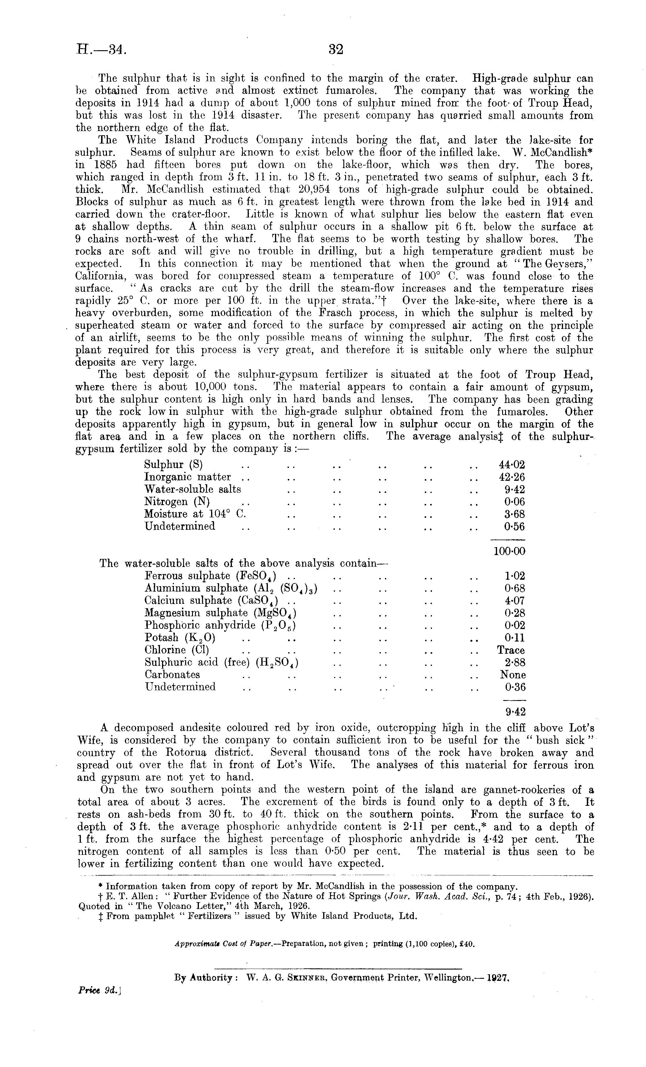 * Information taken from copy of report by Mr. McCandlish in the possession of the company. fE. T. Allen: " Further Evidence of the Nature of Hot Springs (Jour. Wash. Acad. Sci., p. 74; 4th Feb., 1926). Quoted in " The Volcano Letter," 4th March, 1926. J From pamphlet " Fertilizers " issued by White Island Products, Ltd.