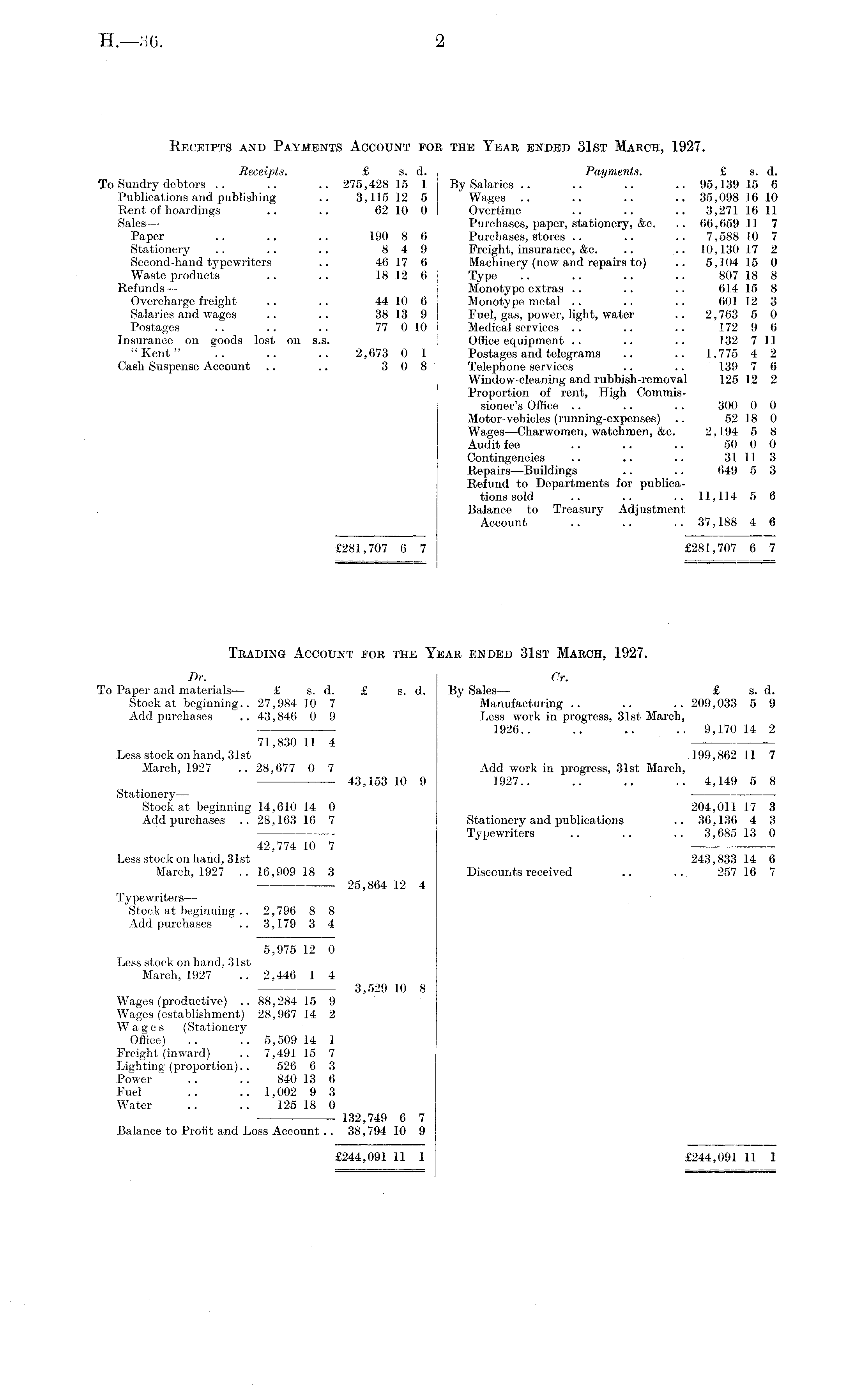 Receipts and Payments Account fob the Year ended 31st March, 1927. Receipts. £ s. d. Payments. £ s. d. To Sundry debtors .. .. .. 275,428 15 1 By Salaries .. .. .. .. 95,139 15 6 Publications and publishing .. 3,115 12 5 Wages .. .. .. .. 35,098 16 10 Rent of hoardings .. .. 62 10 0 Overtime .. .. .. 3,271 16 11 Sales — Purchases, paper, stationery, &c. .. 66,659 11 7 Paper .. .. .. 190 8 6 Purchases, stores .. .. .. 7,588 10 7 Stationery .. .. .. 8 4 9 Freight, insurance, &c. .. .. 10,130 17 2 Second-hand typewriters .. 46 17 6 Machinery (new and repairs to) .. 5,104 15 0 Waste products .. .. 18 12 6 Type .. .. .. .. 807 18 8 Refunds— Monotype extras .. .. .. 614 15 8 Overcharge freight .. .. 44 10 6 Monotype metal .. .. .. 601 12 3 Salaries and wages .. .. 38 13 9 Fuel, gas, power, light, water .. 2,763 5 0 Postages .. .. .. 77 0 10 Medical services .. .. .. 172 9 6 Insurance on goods lost on s.s. Office equipment .. .. .. 132 7 11 "Kent" .. .. .. 2,673 0 1 Postages and telegrams .. .. 1,775 4 2 Cash Suspense Account .. .. 3 0 8 Telephone services .. .. 139 7 6 Window-cleaning and rubbish-removal 125 12 2 Proportion of rent, High Commissioner's Office .. .. .. 300 0 0 Motor-vehicles (running-expenses) .. 52 18 0 Wages—Charwomen, watchmen, &c. 2,194 5 8 Audit fee .. .. .. 50 0 0 Contingencies .. .. .. 31 11 3 Repairs—Buildings .. .. 649 5 3 Refund to Departments for publications sold .. .. .. 11,114 5 6 Balance to Treasury Adjustment Account .. .. .. 37,188 4 6 f281,707 6 7 £281,707 6 7 Trading Account for the Year ended 31st March, 1927. Dr. Or. To Paper and materials— £ s. d. £ s. d. By Sales— £ s. d. Stock at beginning.. 27,984 10 7 Manufacturing .. .. .. 209,033 5 9 Add purchases .. 43,846 0 9 Less work in progress, 31st March, 1926.. .. .. .. 9,170 14 2 71,830 11 4 Less stock on hand, 31st 199,862 11 7 March, 1927 .. 28,677 0 7 Add work in progress, 31st March, 43,153 10 9 1927.. .. .. .. 4,149 5 8 Stationery— Stock at beginning 14,610 14 0 204,011 17 3 Add purchases .. 28,163 16 7 Stationery and publications .. 36,136 4 3 Typewriters .. .. .. 3,685 13 0 42,774 10 7 Less stock on hand, 31st 243,833 14 6 March, 1927 .. 16,909 18 3 Discounts received .. .. 257 16 7 25,864 12 4 Typewriters— Stock at beginning .. 2,796 8 8 Add purchases .. 3,179 3 4 5,975 12 0 Less stock on hand. 31st March, 1927 .. 2,446 1 4 3,529 10 8 Wages (productive) .. 88,284 15 9 Wages (establishment) 28,967 14 2 Wages (Stationery Office) .. .. 5,509 14 1 Freight (inward) .. 7,491 15 7 Lighting (proportion).. 526 6 3 Power .. .. 840 .13 6 Fuel .. .. 1,002 9 3 Water .. .. 125 18 0 132,749 6 7 Balance to Profit and Loss Account .. 38,794 10 9 £244,091 11 1 £244,091 11 1