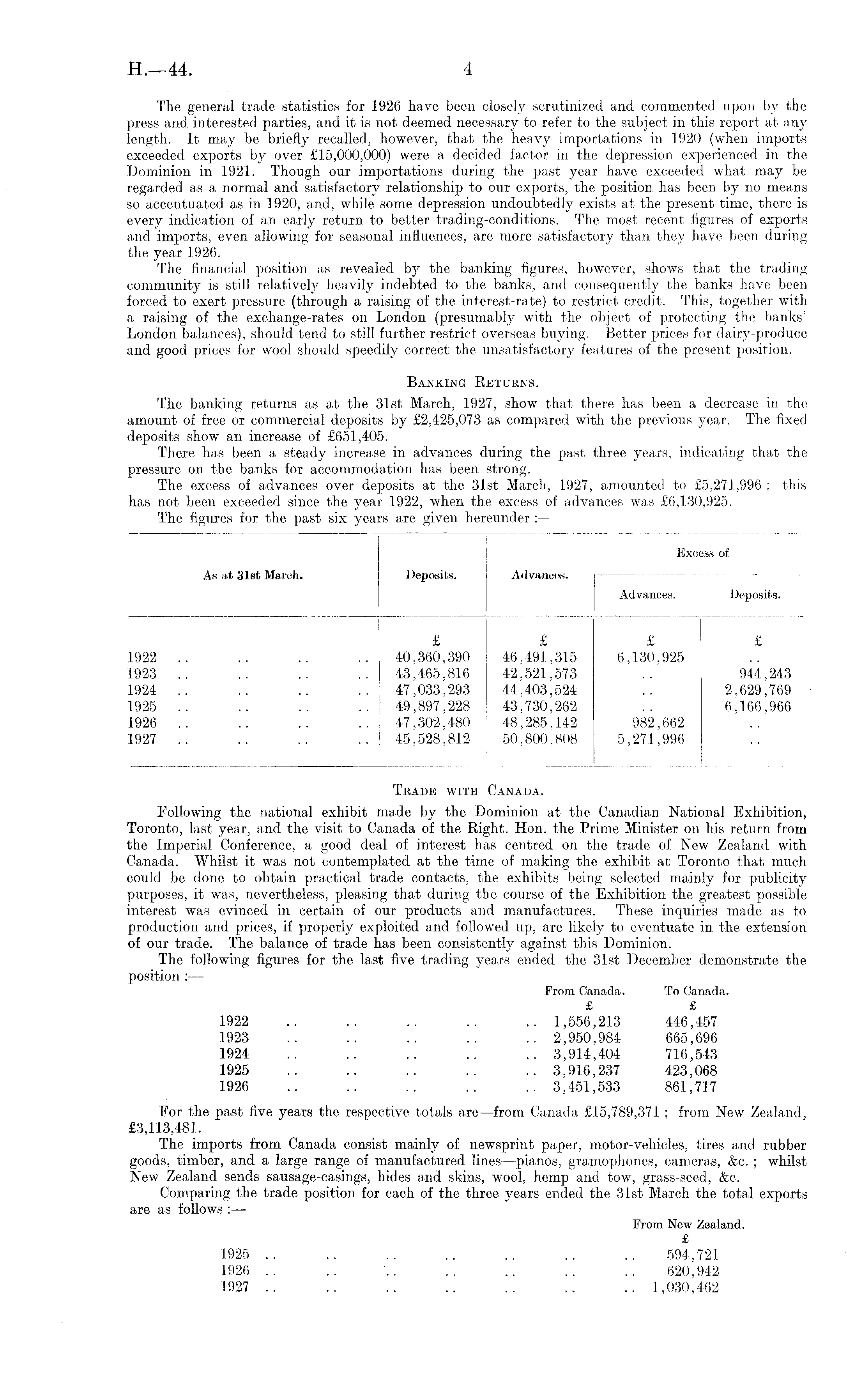 The general trade statistics for 1926 have been closely scrutinized and commented upon by the press and interested parties, and it is not deemed necessary to refer to the subject in this report at any length. It may be briefly recalled, however, that the heavy importations in 1920 (when imports exceeded exports by over £15,000,000) were a decided factor in the depression experienced in the Dominion in 1921. Though our importations during the past year have exceeded what may be regarded as a normal and satisfactory relationship to our exports, the position has been by no means so accentuated as in 1920, and, while some depression undoubtedly exists at the present time, there is every indication of an early return to better trading-conditions. The most recent figures of exports and imports, even allowing for seasonal influences, are more satisfactory than they have been during the year 1926. The financial position as revealed by the banking figures, however, shows that the trading community is still relatively heavily indebted to the banks, and consequently the banks have been forced to exert pressure (through a raising of the interest-rate) to restrict credit. This, together with a raising of the exchange-rates on London (presumably with the object of protecting the banks' London balances), should tend to still further restrict overseas buying. Better prices for dairy-produce and good prices for wool should speedily correct the unsatisfactory features of the present position. Banking Returns. The banking returns as at the 31st March, 1927, show that there has been a decrease in the amount of free or commercial deposits by £2,425,073 as compared with the previous year. The fixed deposits show an increase of £651,405. There has been a steady increase in advances during the past three years, indicating that the pressure on the banks for accommodation has been strong. The excess of advances over deposits at the 31st March, 1927, amounted to £5,271,996 ; this has not been exceeded since the year 1922, when the excess of advances was £6,130,925. The figures for the past six years are given hereunder : —