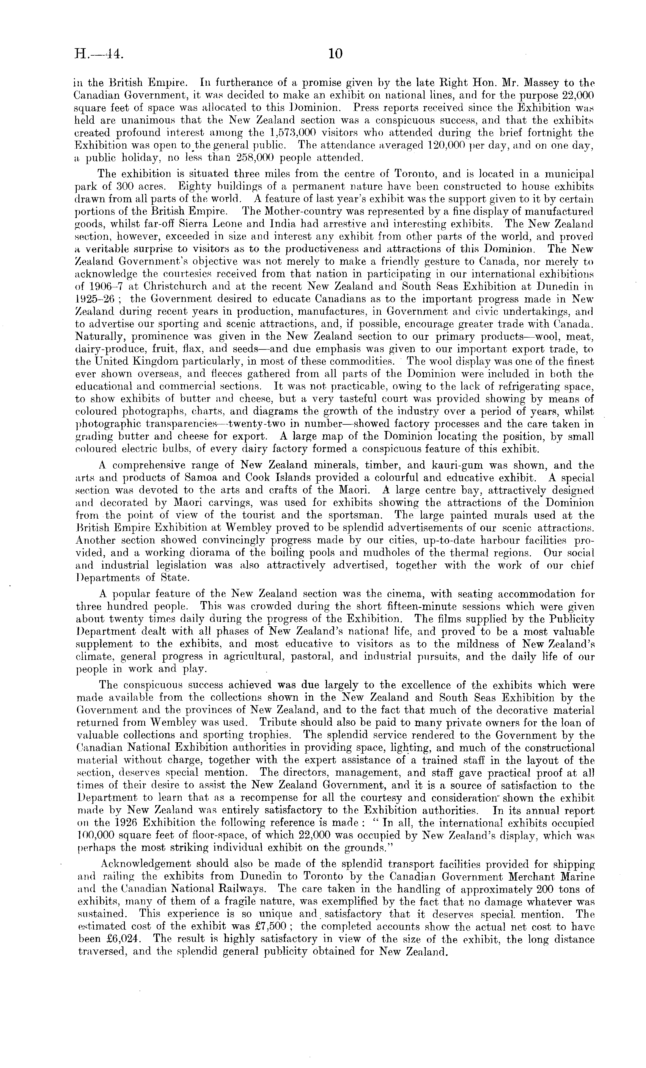 in the British Empire. In furtherance of a promise given by the late Right Hon. Mr. Massey to the Canadian Government, it was decided to make an exhibit on national lines, and for the purpose 22,000 square feet of space was allocated to this Dominion. Press reports received since the Exhibition was held are unanimous that the New Zealand section was a conspicuous success, and that the exhibits created profound interest among the 1,573,000 visitors who attended during the brief fortnight the Exhibition was open to_the general public. The attendance averaged 120,000 per day, and on one day, a public holiday, no less than 258,000 people attended. The exhibition is situated three miles from the centre of Toronto, and is located in a municipal park of 300 acres. Eighty buildings of a permanent nature have been constructed to house exhibits drawn from all parts of the world. A feature of last year's exhibit was the support given to it by certain portions of the British Empire. The Mother-country was represented by a fine display of manufactured goods, whilst far-off Sierra Leone and India had arrestive and interesting exhibits. The New Zealand section, however, exceeded in size and interest any exhibit from other parts of the world, and proved a veritable surprise to visitors as to the productiveness and attractions of this Dominion. The New Zealand Government's objective was not merely to make a friendly gesture to Canada, nor merely to acknowledge the courtesies received from that nation in participating in our international exhibitions of 1906-7 at Christchurch and at the recent New Zealand and South Seas Exhibition at Dunedin in 1925-26 ; the Government desired to educate Canadians as to the important progress made in New Zealand during recent years in production, manufactures, in Government and civic undertakings, and to advertise our sporting and scenic attractions, and, if possible, encourage greater trade with Canada. Naturally, prominence was given in the New Zealand section to our primary products—wool, meat, dairy-produce, fruit, flax, and seeds —and due emphasis was given to our important export trade, to the United Kingdom particularly, in most of these commodities. The wool display was one of the finest ever shown overseas, and fleeces gathered from all parts of the Dominion were included in both the educational and commercial sections. It was not practicable, owing to the lack of refrigerating space, to show exhibits of butter and cheese, but a very tasteful court was provided showing by means of coloured photographs, charts, and diagrams the growth of the industry over a period of years, whilst photographic transparencies—twenty-two in number —showed factory processes and the care taken in grading butter and cheese for export. A large map of the Dominion locating the position, by small coloured electric bulbs, of every dairy factory formed a conspicuous feature of this exhibit. A comprehensive range of New Zealand minerals, timber, and kauri-gum was shown, and the arts and products of Samoa and Cook Islands provided a colourful and educative exhibit. A special section was devoted to the arts and crafts of the Maori. A large centre bay, attractively designed and decorated by Maori carvings, was used for exhibits showing the attractions of the Dominion from the point of view of the tourist and the sportsman. The large painted murals used at the British Empire Exhibition at Wembley proved to be splendid advertisements of our scenic attractions. Another section showed convincingly progress made by our cities, up-to-date harbour facilities provided, and a working diorama of the boiling pools and mudholes of the thermal regions. Our social and industrial legislation was also attractively advertised, together with the work of our chief Departments of State. A popular feature of the New Zealand section was the cinema, with seating accommodation for three hundred people. This was crowded during the short fifteen-minute sessions which were given about twenty times daily during the progress of the Exhibition. The films supplied by the Publicity Department dealt with all phases of New Zealand's national life, and proved to be a most valuable supplement to the exhibits, and most educative to visitors as to the mildness of New Zealand's climate, general progress in agricultural, pastoral, and industrial pursuits, and the daily life of our people in work and play. The conspicuous success achieved was due largely to the excellence of the exhibits which were made available from the collections shown in the New Zealand and South Seas Exhibition by the Government and the provinces of New Zealand, and to the fact that much of the decorative material returned from Wembley was used. Tribute should also be paid to many private owners for the loan of valuable collections and sporting trophies. The splendid service rendered to the Government by the Canadian National Exhibition authorities in providing space, lighting, and much of the constructional material without charge, together with the expert assistance of a trained staff in the layout of the section, deserves special mention. The directors, management, and staff gave practical proof at all times of their desire to assist the New Zealand Government, and it is a source of satisfaction to the Department to learn that as a recompense for all the courtesy and consideration* shown the exhibit made by New Zealand was entirely satisfactory to the Exhibition authorities. In its annual report on the 1926 Exhibition the following reference is made : "In all, the international exhibits occupied 100,000 square feet of floor-space, of which 22,000 was occupied by New Zealand's display, which was perhaps the most striking individual exhibit on the grounds." Acknowledgement should also be made of the splendid transport facilities provided for shipping and railing the exhibits from Dunedin to Toronto by the Canadian Government Merchant Marine and the Cana
