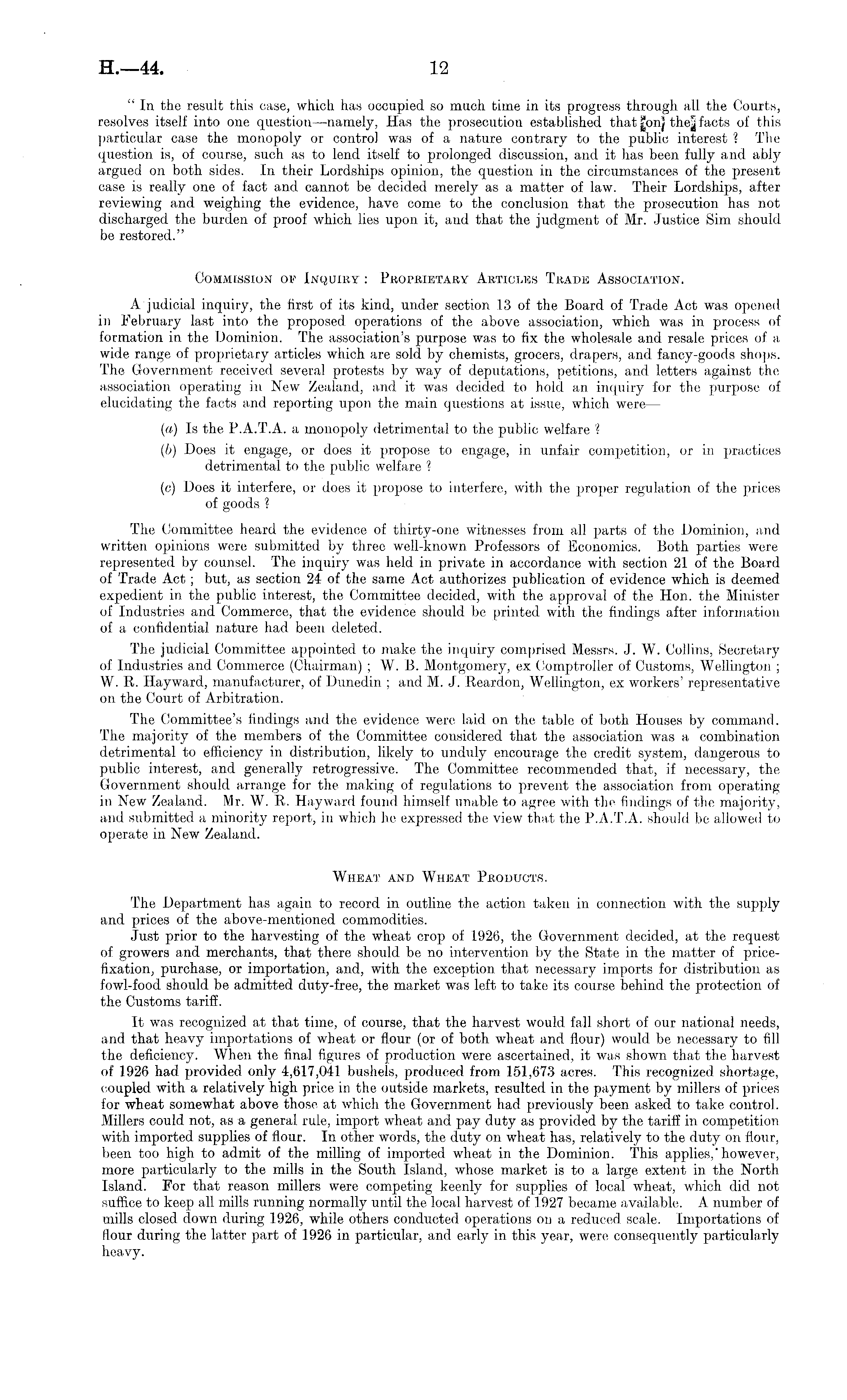 " In the result this case, which has occupied so much time in its progress through all the Courts, resolves itself into one question—namely, Has the prosecution established that |on) the| facts of this particular case the monopoly or control was of a nature contrary to the public interest % The question is, of course, such as to lend itself to prolonged discussion, and it has been fully and ably argued on both sides. In their Lordships opinion, the question in the circumstances of the present case is really one of fact and cannot be decided merely as a matter of law. Their Lordships, after reviewing and weighing the evidence, have come to the conclusion that the prosecution has not discharged the burden of proof which lies upon it, and that the judgment of Mr. Justice Sim should be restored." Commission of Inquiry : Proprietary Articles Trade Association. A judicial inquiry, the first of its kind, under section 13 of the Board of Trade Act was opened in February last into the proposed operations of the above association, which was in process of formation in the Dominion. The association's purpose was to fix the wholesale and resale prices of a wide range of proprietary articles which are sold by chemists, grocers, drapers, and fancy-goods shops. The Government received several protests by way of deputations, petitions, and letters against the association operating in New Zealand, and it was decided to hold an inquiry for the purpose of elucidating the facts and reporting upon the main questions at issue, which were — (а) Is the P.A.T.A. a monopoly detrimental to the public welfare ? (б) Does it engage, or does it propose to engage, in unfair competition, or in practices detrimental to the public welfare ? (c) Does it interfere, or does it propose to interfere, with the proper regulation of the prices of goods 1 The Committee heard the evidence of thirty-one witnesses from all parts of the Dominion, and written opinions were submitted by three well-known Professors of Economics. Both parties were represented by counsel. The inquiry was held in private in accordance with section 21 of the Board of Trade Act; but, as section 24 of the same Act authorizes publication of evidence which is deemed expedient in the public interest, the Committee decided, with the approval of the Hon. the Minister of Industries and Commerce, that the evidence should be printed with the findings after information of a confidential nature had been deleted. The judicial Committee appointed to make the inquiry comprised Messrs. J. W. Collins, Secretary of Industries and Commerce (Chairman) ; W. B. Montgomery, ex Comptroller of Customs, Wellington ; W. it. Hayward, manufacturer, of Dunedin ; and M. J. Reardon, Wellington, ex workers' representative on the Court of Arbitration. The Committee's findings and the evidence were laid on the table of both Houses by command. The majority of the members of the Committee considered that the association was a combination detrimental to efficiency in distribution, likely to unduly encourage the credit system, dangerous to public interest, and generally retrogressive. The Committee recommended that, if necessary, the Government should arrange for the making of regulations to prevent the association from operating in New Zealand. Mr. W. R. Hayward found himself unable to agree with the findings of the majority, and submitted a minority report, in which he expressed the view that the P.A.T.A. should be allowed to operate in New Zealand. Wheat and Wheat Products. The Department has again to record in outline the action taken in connection with the supply and prices of the above-mentioned commodities. Just prior to the harvesting of the wheat crop of 1926, the Government decided, at the request of growers and merchants, that there should be no intervention by the State in the matter of pricefixation, purchase, or importation, and, with the exception that necessary imports for distribution as fowl-food should be admitted duty-free, the market was left to take its course behind the protection of the Customs tarifl. It was recognized at that time, of course, that the harvest would fall short of our national needs, and that heavy importations of wheat or flour (or of both wheat and flour) would be necessary to fill the deficiency. When the final figures of production were ascertained, it was shown that the harvest of 1926 had provided only 4,617,041 bushels, produced from 151,673 acres. This recognized shortage, coupled with a relatively high price in the outside markets, resulted in the payment by millers of prices for wheat somewhat above those at which the Government had previously been asked to take control. Millers could not, as a general rule, import wheat and pay duty as provided by the tariff in competition with imported supplies of flour. In other words, the duty on wheat has, relatively to the duty on flour, been too high to admit of the milling of imported wheat in the Dominion. This applies,'however, more particularly to the mills in the South Island, whose market is to a large extent in the North Island. For that reason millers were competing keenly for supplies of local wheat, which did not suffice to keep all mills running normally until the local harvest of 1927 became available. A number of mills closed down during 1926, while others conducted operations on a reduced scale. Importations of flour during the latter part of 1926 in particular, and early in this year, were consequently particularly heavy.