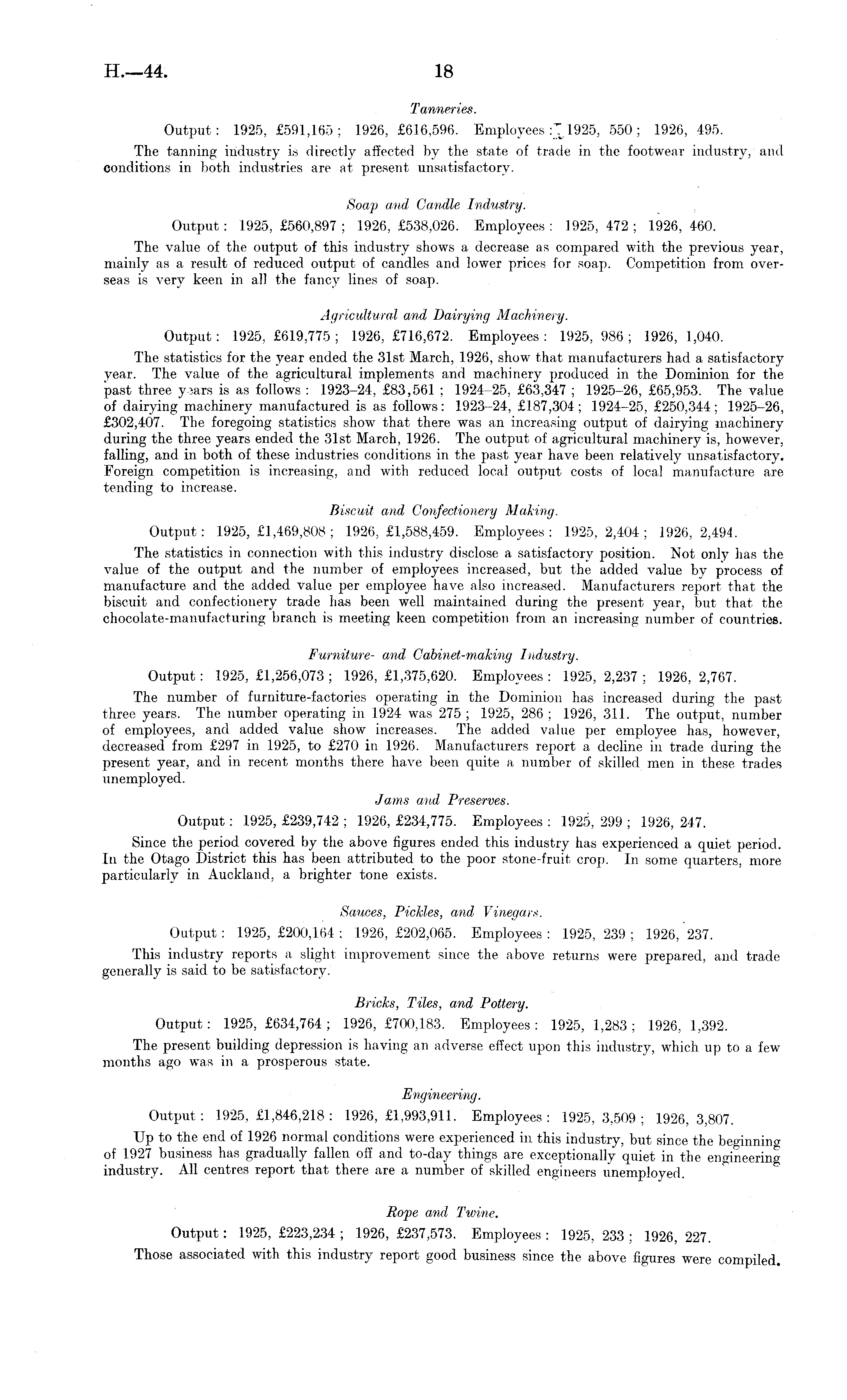 Tanneries. Output: 1925, £591,165; 1926, £616,596. Employees :T 1925, 550; 1926, 495. The tanning industry is directly affected by the state of trade in the footwear industry, and conditions in both industries are at present unsatisfactory. Soap and Candle Industry. Output: 1925, £560,897; 1926, £538,026. Employees: 1925,472; 1926,460. The value of the output of this industry shows a decrease as compared with the previous year, mainly as a result of reduced output of candles and lower prices for soap. Competition from overseas is very keen in all the fancy lines of soap. Agricultural and Dairying Machinery. Output: 1925, £619,775; 1926, £716,672. Employees: 1925,986; 1926,1,040. The statistics for the year ended the 31st March, 1926, show that manufacturers had a satisfactory year. The value of the agricultural implements and machinery produced in the Dominion for the past three y;ars is as follows: 1923-24, £83,561 : 1924-25, £63,347 ; 1925-26, £65,953. The value of dairying machinery manufactured is as follows: 1923-24, £187,304; 1924-25, £250,344; 1925-26, £302,407. The foregoing statistics show that there was an increasing output of dairying machinery during the three years ended the 31st March, 1926. The output of agricultural machinery is, however, falling, and in both of these industries conditions in the past year have been relatively unsatisfactory. Foreign competition is increasing, and with reduced local output costs of local manufacture are tending to increase. Biscuit and Confectionery Making. Output: 1925, £1,469,808; 1926, £1,588,459. Employees: 1925, 2,404; 1926, 2,494. The statistics in connection with this industry disclose a satisfactory position. Not only has the value of the output and the number of employees increased, but the added value by process of manufacture and the added value per employee have also increased. Manufacturers report that the biscuit and confectionery trade has been well maintained during the present year, but that the chocolate-manufacturing branch is meeting keen competition from an increasing number of countries. Furniture- and Cabinet-making Industry. Output : 1925, £1,256,073 ; 1926, £1,375,620. Employees : 1925, 2,2-37 ; 1926, 2,767. The number of furniture-factories operating in the Dominion has increased during the past three years. The number operating in 1924 was 275 ; 1925, 286 ; 1926, 311. The output, number of employees, and added value show increases. The added value per employee has, however, decreased from £297 in 1925, to £270 in 1926. Manufacturers report a decline in trade during the present year, and in recent months there have been quite a number of skilled men in these trades unemployed. Jams and Preserves. Output: 1925, £239,742 ; 1926, £234,775. Employees : 1925, 299 ; 1926, 247. Since the period covered by the above figures ended this industry has experienced a quiet period. In the Otago District this has been attributed to the poor stone-fruit crop. In some quarters, more particularly in Auckland, a brighter tone exists. Sauces, Pickles, and Vinegars. Output: 1925, £200,164 ; 1926, £202,065. Employees : 1925, 239 ; 1926, 237. This industry reports a slight improvement since the above returns were prepared, and trade generally is said to be satisfactory. Bricks, Tiles, and Pottery. Output: 1925, £634,764; 1926, £700,183. Employees: 1925, 1,283 ; 1926, 1,392. The present building depression is having an adverse effect upon this industry, which up to a few months ago was in a prosperous state. Engineering. Output: 1925, £1,846,218 : 1926, £1,993,911. Employees : 1925, 3,509 ; 1926, 3,807. Up to the end of 1926 normal conditions were experienced in this industry, but since the beginning of 1927 business has gradually fallen off and to-day things are exceptionally quiet in the engineering industry. All centres report that there are a number of skilled engineers unemployed. Rope and Twine. Output: 1925, £223,234; 1926, £237,573. Employees: 1925,233; 1926,227. Those associated with this industry report good business since the above figures were compiled.