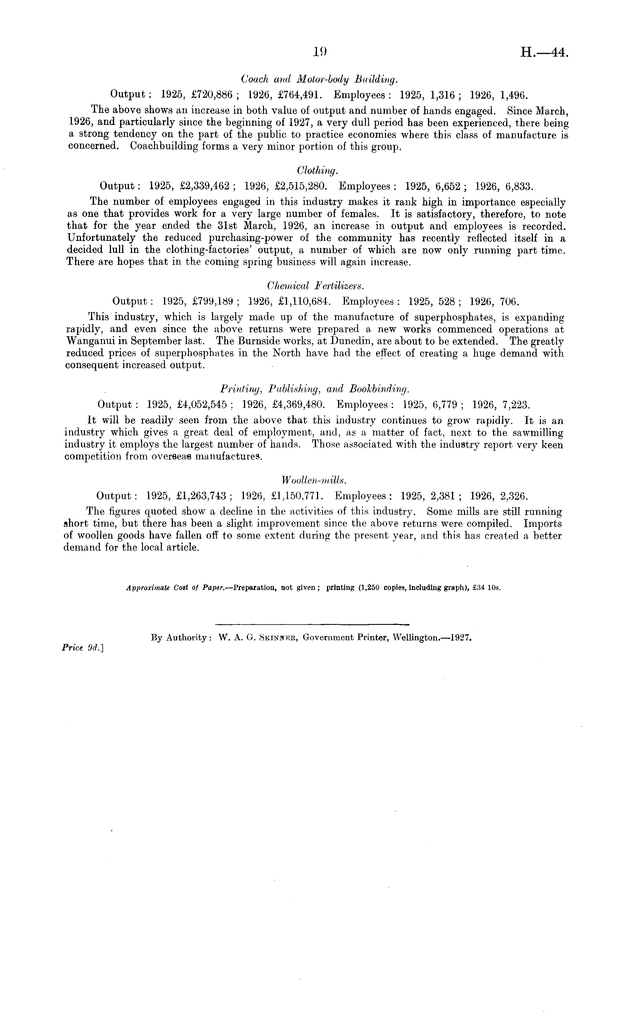 Coach and Motor-body Building. Output: 1925, £720,886 ; 1926, £764,491. Employees : 1925, 1,316 ; 1926, 1,496. The above shows an increase in both value of output and number of hands engaged. Since March, 1926, and particularly since the beginning of 1927, a very dull period has been experienced, there being a strong tendency on the part of the public to practice economies where this class of manufacture is concerned. Coachbuilding forms a very minor portion of this group. Clothing. Output: 1925, £2,339,462 ; 1926, £2,515,280. Employees : 1925, 6,652 ; 1926, 6,833. The number of employees engaged in this industry makes it rank high in importance especially as one that provides work for a very large number of females. It is satisfactory, therefore, to note that for the year ended the 31st March, 1926, an increase in output and employees is recorded. Unfortunately the reduced purchasing-power of the community has recently reflected itself in a decided lull in the clothing-factories' output, a number of which are now only running part time. There are hopes that in the coming spring business will again increase. Chemical Fertilizers. Output: 1925, £799,189 ; 1926, £1,110,684. Employees : 1925, 528 ; 1926, 706. This industry, which is largely made up of the manufacture of superphosphates, is expanding rapidly, and even since the above returns were prepared a new works commenced operations at Wanganui in September last. The Burnside works, at Dunedin, are about to be extended. The greatly reduced prices of superphosphates in the North have had the effect of creating a huge demand with consequent increased output. Printing, Publishing, and Bookbinding. Output: 1925, £4,052,545 : 1926, £4,369,480. Employees : 1925, 6,779 ; 1926, 7,223. It will be readily seen from the above that this industry continues to grow rapidly. It is an industry which gives a great deal of employment, and, as a matter of fact, next to the sawmilling industry it employs the largest number of hands. Those associated with the industry report very keen competition from oversea® manufactures. Woollen-mills. Output: 1925, £1,263,743; 1926, £1,150,771. Employees: 1925,2,381; 1926,2,326. The figures quoted show a decline in the activities of this industry. Some mills are still running short time, but there has been a slight improvement since the above returns were compiled. Imports of woollen goods have fallen off to some extent during the present year, and this has created a better demand for the local article.