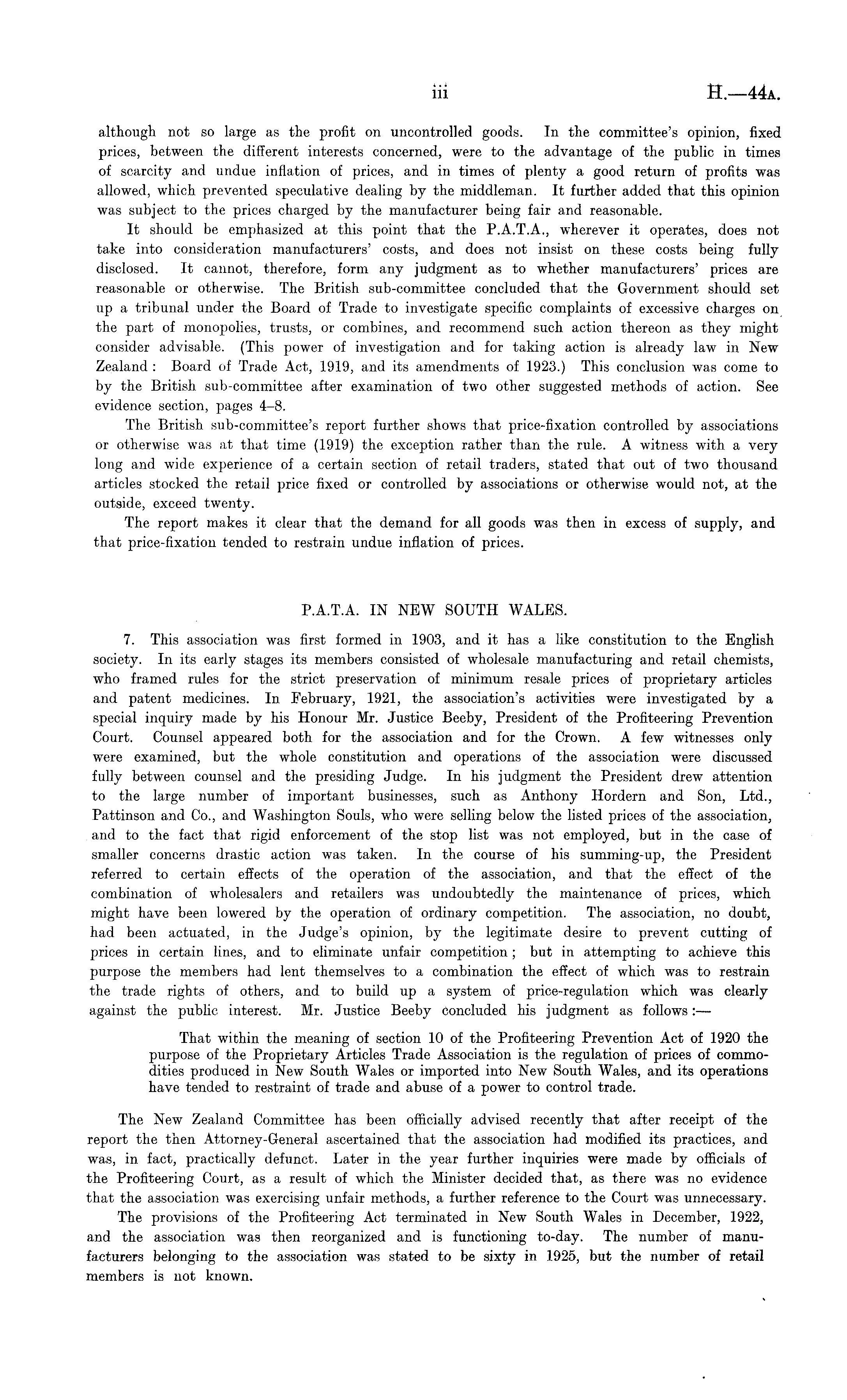 although not so large as the profit on uncontrolled goods. In the committee's opinion, fixed prices, between the different interests concerned, were to the advantage of the public in times of scarcity and undue inflation of prices, and in times of plenty a good return of profits was allowed, which prevented speculative dealing by the middleman. It further added that this opinion was subject to the prices charged by the manufacturer being fair and reasonable. It should be emphasized at this point that the P.A.T.A., wherever it operates, does not take into consideration manufacturers' costs, and does not insist on these costs being fully disclosed. It cannot, therefore, form any judgment as to whether manufacturers' prices are reasonable or otherwise. The British sub-committee concluded that the Government should set up a tribunal under the Board of Trade to investigate specific complaints of excessive charges on the part of monopolies, trusts, or combines, and recommend such action thereon as they might consider advisable. (This power of investigation and for taking action is already law in New Zealand : Board of Trade Act, 1919, and its amendments of 1923.) This conclusion was come to by the British sub-committee after examination of two other suggested methods of action. See evidence section, pages 4-8. The British sub-committee's report further shows that price-fixation controlled by associations or otherwise was at that time (1919) the exception rather than the rule. A witness with a very long and wide experience of a certain section of retail traders, stated that out of two thousand articles stocked the retail price fixed or controlled by associations or otherwise would not, at the outside, exceed twenty. The report makes it clear that the demand for all goods was then in excess of supply, and that price-fixation tended to restrain undue inflation of prices. P.A.T.A. IN NEW SOUTH WALES. 7. This association was first formed in 1903, and it has a like constitution to the English society. In its early stages its members consisted of wholesale manufacturing and retail chemists, who framed rules for the strict preservation of minimum resale prices of proprietary articles and patent medicines. In February, 1921, the association's activities were investigated by a special inquiry made by his Honour Mr. Justice Beeby, President of the Profiteering Prevention Court. Counsel appeared both for the association and for the Crown. A few witnesses only were examined, but the whole constitution and operations of the association were discussed fully between counsel and the presiding Judge. In his judgment the President drew attention to the large number of important businesses, such as Anthony Hordern and Son, Ltd., Pattinson and Co., and Washington Souls, who were selling below the listed prices of the association, and to the fact that rigid enforcement of the stop list was not employed, but in the case of smaller concerns drastic action was taken. In the course of his summing-up, the President referred to certain effects of the operation of the association, and that the effect of the combination of wholesalers and retailers was undoubtedly the maintenance of prices, which might have been lowered by the operation of ordinary competition. The association, no doubt, had been actuated, in the Judge's opinion, by the legitimate desire to prevent cutting of prices in certain lines, and to eliminate unfair competition; but in attempting to achieve this purpose the members had lent themselves to a combination the effect of which was to restrain the trade rights of others, and to build up a system of price-regulation which was clearly against the public interest. Mr. Justice Beeby concluded his judgment as follows:— That within the meaning of section 10 of the Profiteering Prevention Act of 1920 the purpose of the Proprietary Articles Trade Association is the regulation of prices of commodities produced in New South Wales or imported into New South Wales, and its operations have tended to restraint of trade and abuse of a power to control trade. The New Zealand Committee has been officially advised recently that after receipt of the report the then Attorney-General ascertained that the association had modified its practices, and was, in fact, practically defunct. Later in the year further inquiries were made by officials of the Profiteering Court, as a result of which the Minister decided that, as there was no evidence that the association was exercising unfair methods, a further reference to the Court was unnecessary. The provisions of the Profiteering Act terminated in New South Wales in December, 1922, and the association was then reorganized and is functioning to-day. The number of manufacturers belonging to the association was stated to be sixty in 1925, but the number of retail members is not known.