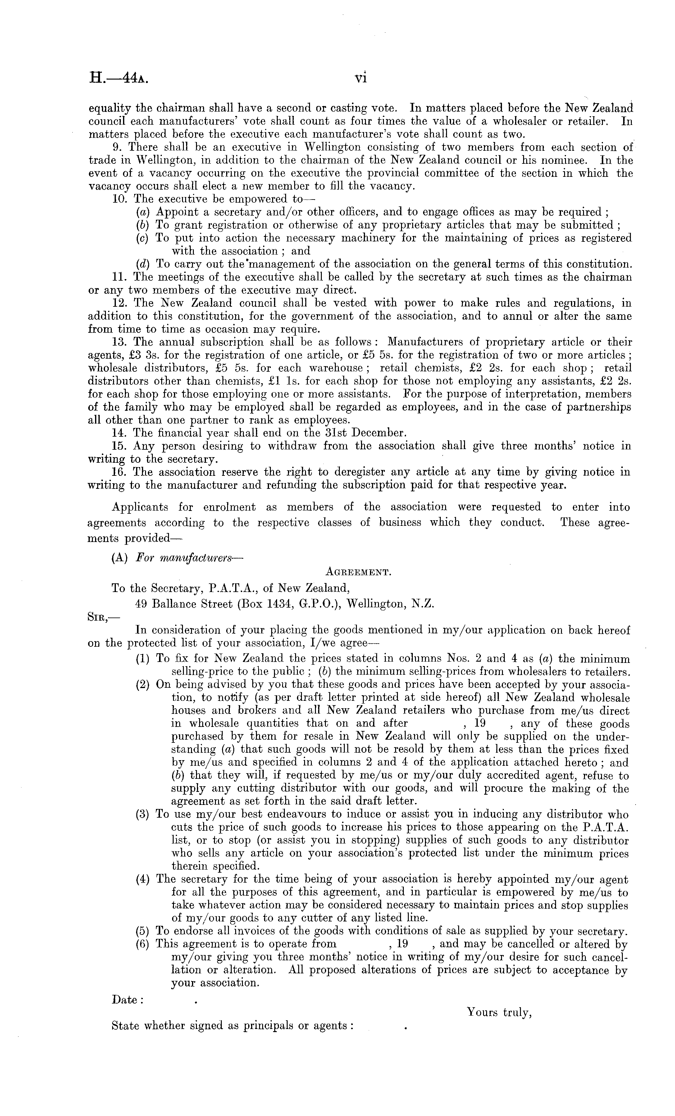 equality the chairman shall have a second or casting vote. In matters placed before the New Zealand council each manufacturers' vote shall count as four times the value of a wholesaler or retailer. In matters placed before the executive each manufacturer's vote shall count as two. 9. There shall be an executive in Wellington consisting of two members from each section of trade in Wellington, in addition to the chairman of the New Zealand council or his nominee. In the event of a vacancy occurring on the executive the provincial committee of the section in which the vacancy occurs shall elect a new member to fill the vacancy. 10. The executive be empowered to— (a) Appoint a secretary and/or other officers, and to engage offices as may be required ; (b) To grant registration or otherwise of any proprietary articles that may be submitted ; (c) To put into action the necessary machinery for the maintaining of prices as registered with the association ; and (d) To carry out the'management of the association on the general terms of this constitution. 11. The meetings of the executive shall be called by the secretary at such times as the chairman or any two members of the executive may direct. 12. The New Zealand council shall be vested with power to make rules and regulations, in addition to this constitution, for the government of the association, and to annul or alter the same from time to time as occasion may require. 13. The annual subscription shall be as follows : Manufacturers of proprietary article or their agents, £3 3s. for the registration of one article, or £5 ss. for the registration of two or more articles ; wholesale distributors, £5 ss. for each warehouse ; retail chemists, £2 2s. for each shop ; retail distributors other than chemists, £1 Is. for each shop for those not employing any assistants, £2 2s. for each shop for those employing one or more assistants. For the purpose of interpretation, members of the family who may be employed shall be regarded as employees, and in the case of partnerships all other than one partner to rank as employees. 14. The financial year shall end on the 31st December. 15. Any person desiring to withdraw from the association shall give three months' notice in writing to the secretary. 16. The association reserve the right to deregister any article at any time by giving notice in writing to the manufacturer and refunding the subscription paid for that respective year. Applicants for enrolment as members of the association were requested to enter into agreements according to the respective classes of business which they conduct. These agreements provided— (A) For manufacturers —■ Agreement. To the Secretary, P.A.T.A., of New Zealand, 49 Ballance Street (Box 1434, G.P.0.), Wellington, N.Z. Sir,— In consideration of your placing the goods mentioned in my/our application on back hereof on the protected list of your association, I/we agree — (1) To fix for New Zealand the prices stated in columns Nos. 2 and 4 as (a) the minimum selling-price to the public ; (6) the minimum selling-prices from wholesalers to retailers. (2) On being advised by you that these goods and prices have been accepted by your association, to notify (as per draft letter printed at side hereof) all New Zealand wholesale houses and brokers and all New Zealand retailers who purchase from me/us direct in wholesale quantities that on and after ,19 , any of these goods purchased by them for resale in New Zealand will only be supplied on the understanding (a) that such goods will not be resold by them at less than the prices fixed by me/us and specified in columns 2 and 4 of the application attached hereto ; and (b) that they will, if requested by me/us or my/our duly accredited agent, refuse to supply any cutting distributor with our goods, and will procure the making of the agreement as set forth in the said draft letter. (3) To use my/our best endeavours to induce or assist you in inducing any distributor who cuts the price of such goods to increase his prices to those appearing on the P.A.T.A. list, or to stop (or assist you in stopping) supplies of such goods to any distributor who sells any article on your association's protected list under the minimum prices therein specified. (4) The secretary for the time being of your association is hereby appointed my/our agent for all the purposes of this agreement, and in particular is empowered by me/us to take whatever action may be considered necessary to maintain prices and stop supplies of my/our goods to any cutter of any listed line. (5) To endorse all invoices of the goods with conditions of sale as supplied by your secretary. (6) This agreement is to operate from ,19 , and may be cancelled or altered by my /our giving you three months' notice in writing of my/our desire for such cancellation or alteration. All proposed alterations of prices are subject to acceptance by your association. Date: Yours truly, State whether signed as principals or agents :