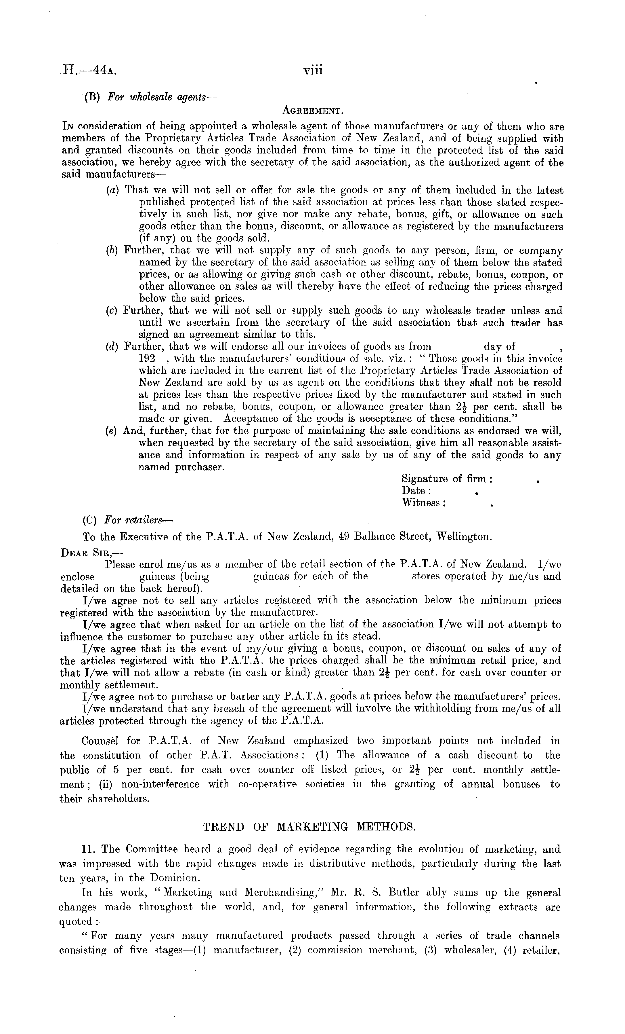 (B) For wholesale agents — Agreement. In consideration of being appointed a wholesale agent of those manufacturers or any of them who are members of the Proprietary Articles Trade Association of New Zealand, and of being supplied with and granted discounts on their goods included from time to time in the protected list of the said association, we hereby agree with the secretary of the said association, as the authorized agent of the said manufacturers— (a) That we will not sell or offer for sale the goods or any of them included in the latest published protected list of the said association at prices less than those stated respectively in such list, nor give nor make any rebate, bonus, gift, or allowance on such goods other than the bonus, discount, or allowance as registered by the manufacturers (if any) on the goods sold. (b) Further, that we will not supply any of such goods to any person, firm, or company named by the secretary of the said association as selling any of them below the stated prices, or as allowing or giving such cash or other discount, rebate, bonus, coupon, or other allowance on sales as will thereby have the effect of reducing the prices charged below the said prices. (c) Further, that we will not sell or supply such goods to any wholesale trader unless and until we ascertain from the secretary of the said association that such trader has signed an agreement similar to this. (d) Further, that we will endorse all our invoices of goods as from day of , 192 , with the manufacturers' conditions of sale, viz. : " Those goods in this invoice which are included in the current list of the Proprietary Articles Trade Association of New Zealand are sold by us as agent on the conditions that they shall not be resold at prices less than the respective prices fixed by the manufacturer and stated in such list, and no rebate, bonus, coupon, or allowance greater than 2J per cent, shall be made or given. Acceptance of the goods is acceptance of these conditions." (e) And, further, that for the purpose of maintaining the sale conditions as endorsed we will, when requested by the secretary of the said association, give him all reasonable assistance and information in respect of any sale by us of any of the said goods to any named purchaser. Signature of firm : Date : Witness: (C) For retailers— To the Executive of the P.A.T.A. of New Zealand, 49 Ballance Street, Wellington. Dear Sir, — Please enrol me/us as a member of the retail section of the P.A.T.A. of New Zealand. I/we enclose guineas (being guineas for each of the stores operated by me/us and detailed on the back hereof). I/we agree not to sell any articles registered with the association below the minimum prices registered with the association by the manufacturer. I/we agree that when asked for an article on the list of the association I/we will not attempt to influence the customer to purchase any other article in its stead. I/we agree that in the event of my/our giving a bonus, coupon, or discount on sales of any of the articles registered with the P.A.T.A. the prices charged shall be the minimum retail price, and that I/we will not allow a rebate (in cash or kind) greater than 2| per cent, for cash over counter or monthly settlement. I/we agree not to purchase or barter any P.A.T.A. goods at prices below the manufacturers' prices. I/we understand that any breach of the agreement will involve the withholding from me/us of all articles protected through the agency of the P.A.T.A. Counsel for P.A.T.A. of New Zealand emphasized two important points not included in the constitution of other P.A.T. Associations: (1) The allowance of a cash discount to the public of 5 per cent, for cash over counter off listed prices, or 2J per cent, monthly settlement ; (ii) non-interference with co-operative societies in the granting of annual bonuses to their shareholders. TREND OF MARKETING METHODS. 11. The Committee heard a good deal of evidence regarding the evolution of marketing, and was impressed with the rapid changes made in distributive methods, particularly during the last ten years, in the Dominion. In his work, " Marketing and Merchandising," Mr. R. S. Butler ably sums up the general changes made throughout the world, and, for general information, the following extracts are quoted :— " For many years many manufactured products passed through a series of trade channels consisting of five stages —(1) manufacturer, (2) commission merchant, (3) wholesaler, (4) retailer,
