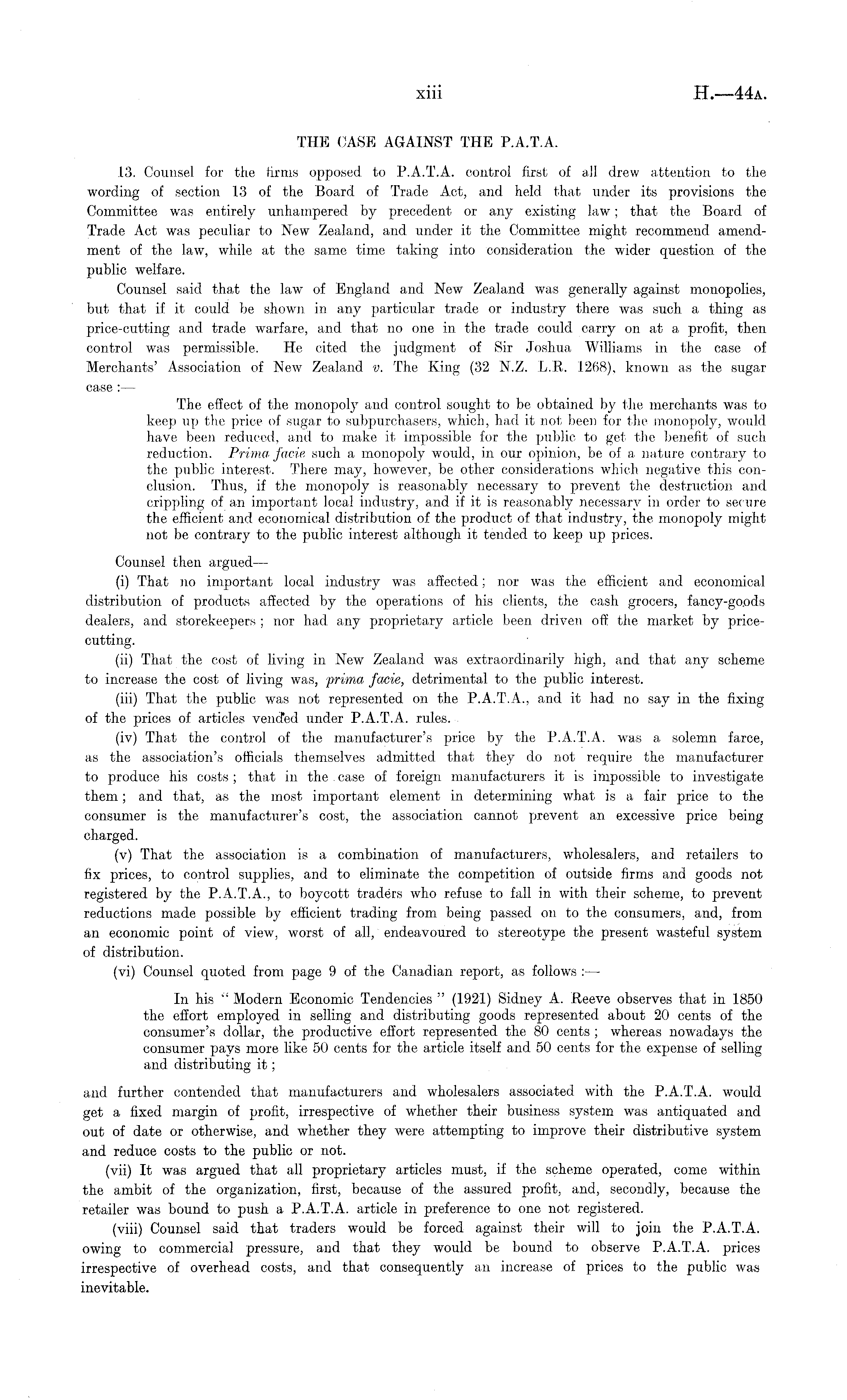 THE CASE AGAINST THE P.A.T.A. 13. Counsel for the firms opposed to P.A.T.A. control first of all drew attention to the wording of section 13 of the Board of Trade Act, and held that under its provisions the Committee was entirely unhampered by precedent or any existing law; that the Board of Trade Act was peculiar to New Zealand, and under it the Committee might recommend amendment of the law, while at the same time taking into consideration the wider question of the public welfare. Counsel said that the law of England and New Zealand was generally against monopolies, but that if it could be shown in any particular trade or industry there was such a thing as price-cutting and trade warfare, and that no one in the trade could carry on at a, profit, then control was permissible. He cited the judgment of Sir Joshua Williams in the case of Merchants' Association of New Zealand v. The King (32 N.Z. L.R. 1268), known as the sugar case : — The effect of the monopoly and control sought to be obtained by the merchants was to keep up the price of sugar to subpurchasers, which, had it not been for the monopoly, would have been reduced, and to make it impossible for the public to get the benefit of such reduction. Prima facie such a monopoly would, in our opinion, be of a nature contrary to the public interest. There may, however, be other considerations which negative this conclusion. Thus, if the monopoly is reasonably necessary to prevent the destruction and crippling of an important local industry, and if it is reasonably necessary in order to secure the efficient and economical distribution of the product of that industry, the monopoly might not be contrary to the public interest although it tended to keep up prices. Counsel then argued — (i) That no important local industry was affected; nor was the efficient and economical distribution of products affected by the operations of his clients, the cash grocers, fancy-go.ods dealers, and storekeepers ; nor had any proprietary article been driven off the market by pricecutting. (ii) That the cost of living in New Zealand was extraordinarily high, and that any scheme to increase the cost of living was, prima facie, detrimental to the public interest. (iii) That the public was not represented on the P.A.T.A., and it had no say in the fixing of the prices of articles vended under P.A.T.A. rules. (iv) That the control of the manufacturer's price by the P.A.T.A. was a solemn farce, as the association's officials themselves admitted that they do not require the manufacturer to produce his costs ; that in the . case of foreign manufacturers it is impossible to investigate them; and that, as the most important element in determining what is a fair price to the consumer is the manufacturer's cost, the association cannot prevent an excessive price being charged. (v) That the association is a combination of manufacturers, wholesalers, and retailers to fix prices, to control supplies, and to eliminate the competition of outside firms and goods not registered by the P.A.T.A., to boycott traders who refuse to fall in with their scheme, to prevent reductions made possible by efficient trading from being passed on to the consumers, and, from an economic point of view, worst of all, endeavoured to stereotype the present wasteful system of distribution. (vi) Counsel quoted from page 9 of the Canadian report, as follows : —• In his " Modern Economic Tendencies " (1921) Sidney A. Reeve observes that in 1850 the effort employed in selling and distributing goods represented about 20 cents of the consumer's dollar, the productive effort represented the 80 cents ; whereas nowadays the consumer pays more like 50 cents for the article itself and 50 cents for the expense of selling and distributing it; and further contended that manufacturers and wholesalers associated with the P.A.T.A. would get a fixed margin of profit, irrespective of whether their business system was antiquated and out of date or otherwise, and whether they were attempting to improve their distributive system and reduce costs to the public or not. (vii) It was argued that all proprietary articles must, if the scheme operated, come within the ambit of the organization, first, because of the assured profit, and, secondly, because the retailer was bound to push a P.A.T.A. article in preference to one not registered. (viii) Counsel said that traders would be forced against their will to join the P.A.T.A. owing to commercial pressure, and that they would be bound to observe P.A.T.A. prices irrespective of overhead costs, and that consequently an increase of prices to the public was inevitable.