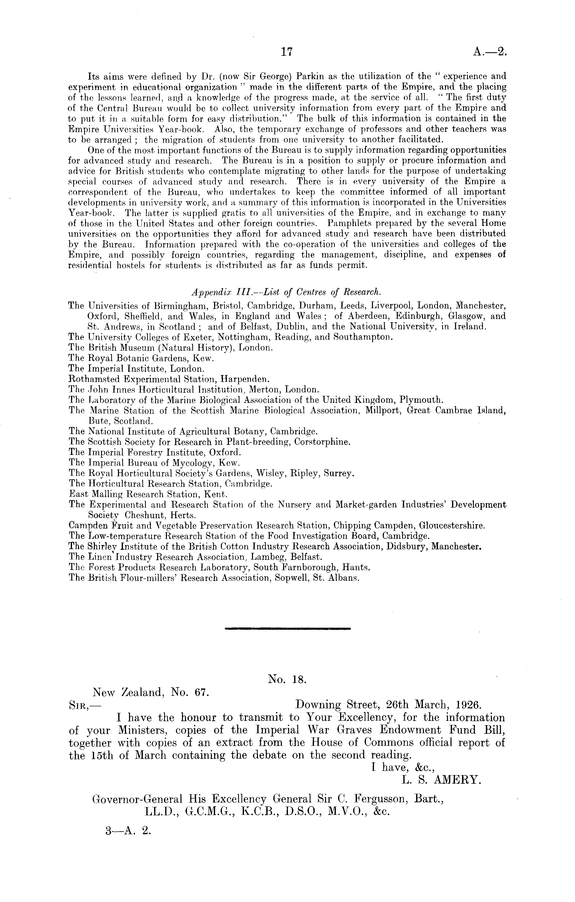 No. 18. New Zealand, No. 67. Sir, — Downing Street, 26th March, 1926. I have the honour to transmit to Your Excellency, for the information of your Ministers, copies of the Imperial War Graves Endowment Fund Bill, together with copies of an extract from the House of Commons official report of the 15th of March containing the debate on the second reading. I have, &c., L. S. AMERY. Governor-General His Excellency General Sir C. Fergusson, Bart., LL.D., G.C.M.G., K.C.8., D.5.0., M.V.0., &c.