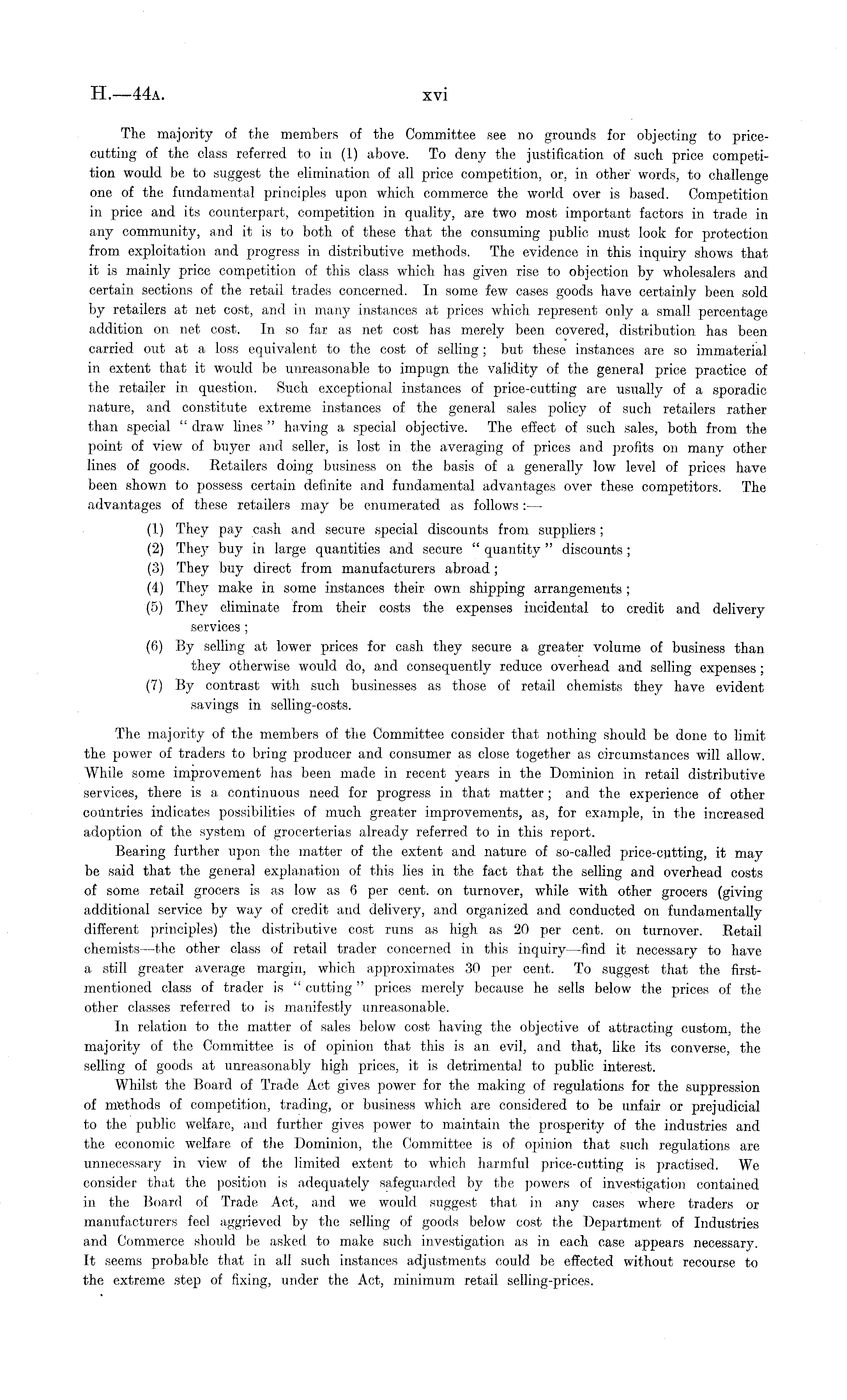 The majority of the members of the Committee see no grounds for objecting to pricecutting of the class referred to in (1) above. To deny the justification of such price competition would be to suggest the elimination of all price competition, or, in other words, to challenge one of the fundamental principles upon which commerce the world over is based. Competition in price and its counterpart, competition in quality, are two most important factors in trade in any community, and it is to both of these that the consuming public must look for protection from exploitation and progress in distributive methods. The evidence in this inquiry shows that it is mainly price competition of this class which has given rise to objection by wholesalers and certain sections of the retail trades concerned. In some few cases goods have certainly been sold by retailers at net cost, and in many instances at prices which represent only a small percentage addition on net cost. In so far as net cost has merely been covered, distribution has been carried out at a loss equivalent to the cost of selling; but these instances are so immaterial in extent that it would be unreasonable to impugn the validity of the general price practice of the retailer in question. Such exceptional instances of price-cutting are usually of a sporadic nature, and constitute extreme instances of the general sales policy of such retailers rather than special " draw lines " having a special objective. The effect of such sales, both from the point of view of buyer and seller, is lost in the averaging of prices and profits on many other lines of goods. Retailers doing business on the basis of a generally low level of prices have been shown to possess certain definite and fundamental advantages over these competitors. The advantages of these retailers . may be enumerated as follows : — (1) They pay cash and secure special discounts from suppliers; (2) They buy in large quantities and secure " quantity" discounts ; (3) They buy direct from manufacturers abroad; (4) They make in some instances their own shipping arrangements ; (5) They eliminate from their costs the expenses incidental to credit and delivery services ; (6) By selling at lower prices for cash they secure a greater volume of business than they otherwise would do, and consequently reduce overhead and selling expenses ; (7) By contrast with such businesses as those of retail chemists they have evident savings in selling-costs. The majority of the members of the Committee consider that nothing should be done to limit the power of traders to bring producer and consumer as close together as circumstances will allow. While some improvement has been made in recent years in the Dominion in retail distributive services, there is a continuous need for progress in that matter; and the experience of other countries indicates possibilities of much greater improvements, as, for example, in the increased adoption of the system of grocerterias already referred to in this report. Bearing further upon the matter of the extent and nature of so-called price-cutting, it may be said that the general explanation of this lies in the fact that the selling and overhead costs of some retail grocers is as low as 6 per cent, on turnover, while with other grocers (giving additional service by way of credit and delivery, and organized and conducted on fundamentally different principles) the distributive cost runs as high as 20 per cent, on turnover. Retail chemists —the other class of retail trader concerned in this inquiry—find it necessary to have a still greater average margin, which approximates 30 per cent. To suggest that the firstmentioned class of trader is " cutting" prices merely because he sells below the prices of the other classes referred to is manifestly unreasonable. In relation to the matter of sales below cost having the objective of attracting custom, the majority of the Committee is of opinion that this is an evil, and that, like its converse, the selling of goods at unreasonably high prices, it is detrimental to public interest. Whilst the Board of Trade Act gives power for the making of regulations for the suppression of mtethods of competition, trading, or business which are considered to be unfair or prejudicial to the public welfare, and further gives power to maintain the prosperity of the industries and the economic welfare of the Dominion, the Committee is of opinion that such regulations are unnecessary in view of the limited extent to which harmful price-cutting is practised. We consider that the position is adequately safeguarded by the powers of investigation contained in the Board of Trade Act, and we would suggest that in any cases where traders or manufacturers feel aggrieved by the selling of goods below cost the Department of Industries and Commerce should be askecl to make such investigation as in each case appears necessary. It seems probable that in all such instances adjustments could be effected without recourse to the extreme step of fixing, under the Act, minimum retail selling-prices.