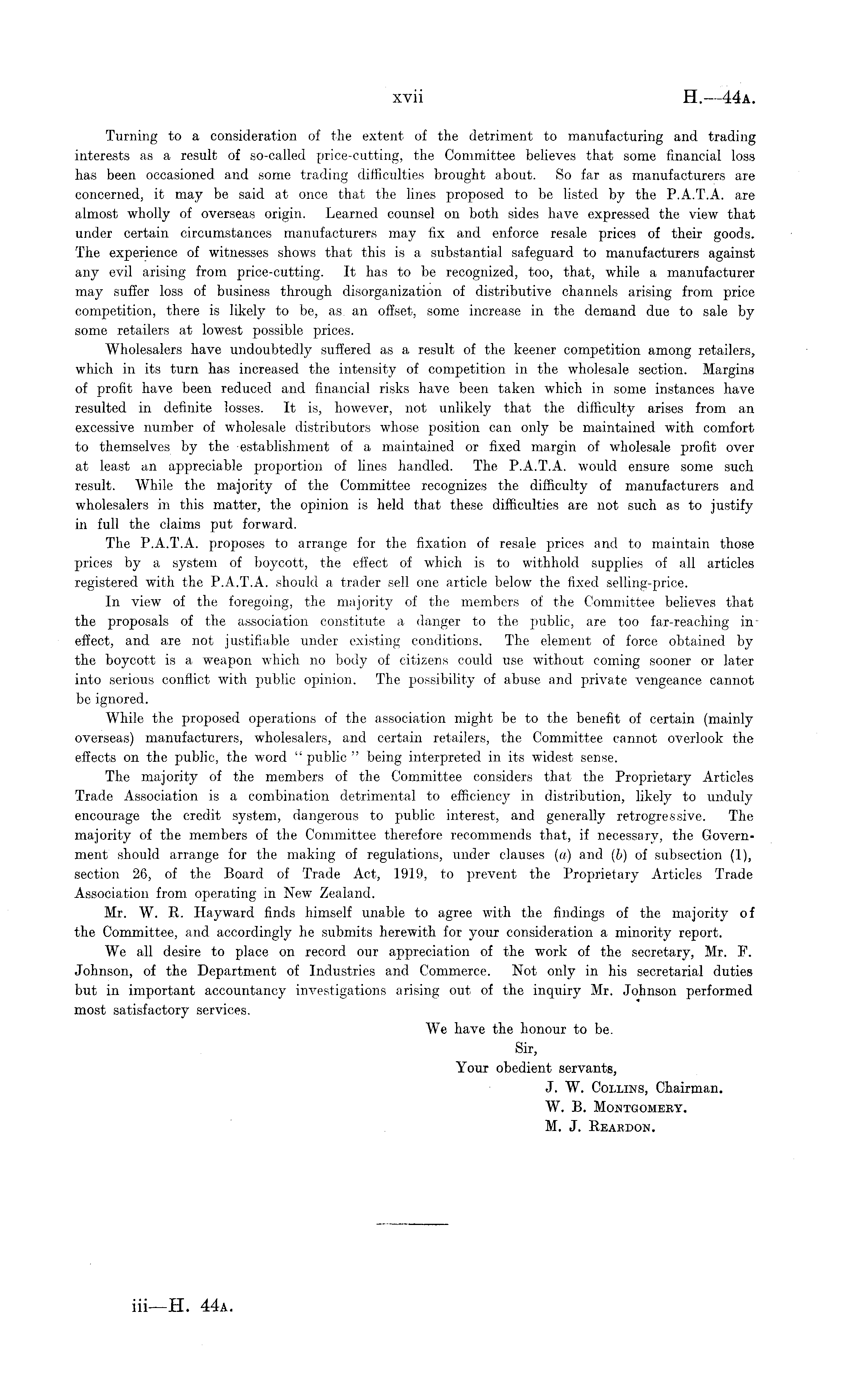 Turning to a consideration of the extent of the detriment to manufacturing and trading interests as a result of so-called price-cutting, the Committee believes that some financial loss has been occasioned and some trading difficulties brought about. So far as manufacturers are concerned, it may be said at once that the lines proposed to be listed by the P.A.T.A. are almost wholly of overseas origin. Learned counsel on both sides have expressed the view that under certain circumstances manufacturers may fix and enforce resale prices of their goods. The experience of witnesses shows that this is a substantial safeguard to manufacturers against any evil arising from price-cutting. It has to be recognized, too, that, while a manufacturer may suffer loss of business through disorganization of distributive channels arising from price competition, there is likely to be, as. an offset, some increase in the demand due to sale by some retailers at lowest possible prices. Wholesalers have undoubtedly suffered as a result of the keener competition among retailers, which in its turn has increased the intensity of competition in the wholesale section. Margins of profit have been reduced and financial risks have been taken which in some instances have resulted in definite losses. It is, however, not unlikely that the difficulty arises from an excessive number of wholesale distributors whose position can only be maintained with comfort to themselves by the establishment of a maintained or fixed margin of wholesale profit over at least an appreciable proportion of lines handled. The P.A.T.A. would ensure some such result. While the majority of the Committee recognizes the difficulty of manufacturers and wholesalers in this matter, the opinion is held that these difficulties are not such as to justify in full the claims put forward. The P.A.T.A. proposes to arrange for the fixation of resale prices and to maintain those prices by a system of boycott, the effect of which is to withhold supplies of all articles registered with the P.A.T.A. should a trader sell one article below the fixed selling-price. In view of the foregoing, the majority of the members of the Committee believes that the proposals of the association constitute a danger to the public, are too far-reaching in effect, and are not justifiable under existing conditions. The element of force obtained by the boycott is a weapon which no body of citizens could use without coming sooner or later into serious conflict with public opinion. The possibility of abuse and private vengeance cannot be ignored. While the proposed operations of the association might be to the benefit of certain (mainly overseas) manufacturers, wholesalers, and certain retailers, the Committee cannot overlook the effects on the public, the word " public " being interpreted in its widest sense. The majority of the members of the Committee considers that the Proprietary Articles Trade Association is a combination detrimental to efficiency in distribution, likely to unduly encourage the credit system, dangerous to public interest, and generally retrogressive. The majority of the members of the Committee therefore recommends that, if necessary, the Government should arrange for the making of regulations, under clauses (a) and (b) of subsection (1), section 26, of the Board of Trade Act, 1919, to prevent the Proprietary Articles Trade Association from operating in New Zealand. Mr. W. R. Hay ward finds himself unable to agree with the findings of the majority of the Committee, and accordingly he submits herewith for your consideration a minority report. We all desire to place on record our appreciation of the work of the secretary, Mr. F. Johnson, of the Department of Industries and Commerce. Not only in his secretarial duties but in important accountancy investigations arising out of the inquiry Mr. Johnson performed most satisfactory services. We have the honour to be, Sir, Your obedient servants, J. W. Collins, Chairman. W. B. Montgomery. M. J. Reardon.