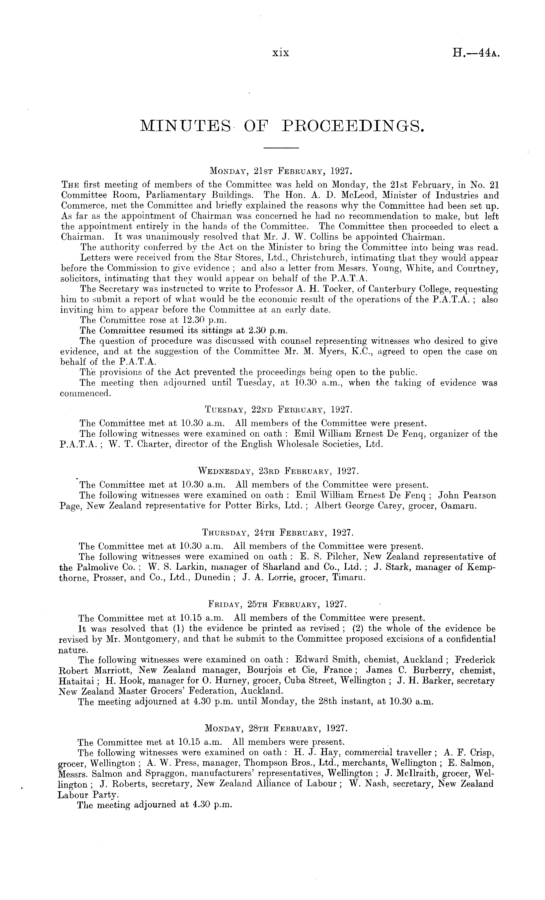 MINUTES OF PROCEEDINGS. Monday, 21st February, 1927. The first meeting of members of the Committee was held on Monday, the 21st February, in No. 21 Committee Room, Parliamentary Buildings. The Hon. A. D. McLeod, Minister of Industries and Commerce, met the Committee and briefly explained the reasons why the Committee had been set up. As far as the appointment of Chairman was concerned he had no recommendation to make, but left the appointment entirely in the hands of the Committee. The Committee then proceeded to elect a Chairman. It was unanimously resolved that Mr. J. W. Collins be appointed Chairman. The authority conferred by the Act on the Minister to bring the Committee into being was read. Letters were received from the Star Stores, Ltd., Christchurc.h, intimating that they would appear before the Commission to give evidence ; and also a letter from Messrs. Young, White, and Courtney, solicitors, intimating that they would appear on behalf of the P.A.T.A. The Secretary was instructed to write to Professor A. H. Tocker, of Canterbury College, requesting him to submit a report of what would be the economic result of the operations of the P.A.T.A. ; also inviting him to appear before the Committee at an early date. The Committee rose at 12.30 p.m. The Committee resumed its sittings at 2.30 p.m. The question of procedure was discussed with counsel representing witnesses who desired to give evidence, and at the suggestion of the Committee Mr. M. Myers, K.C., agreed to open the case on behalf of the P.A.T.A. The provisions of the Act prevented the proceedings being open to the public. The meeting then adjourned until Tuesday, at 10.30 a.m., when the taking of evidence was commenced. Tuesday, 22nd February, 1927. The Committee met at 10.30 a.m. All members of the Committee were present. The following witnesses were examined on oath : Emil William Ernest De Fenq, organizer of the P.A.T.A. ; W. T. Charter, director of the English Wholesale Societies, Ltd. Wednesday, 23rd February, 1927. The Committee met at 10.30 a.m. All members of the Committee were present. The following witnesses were examined on oath : Emil William Ernest De Fenq ; John Pearson Page, New Zealand representative for Potter Birks, Ltd. ; Albert George Carey, grocer, Oamaru. Thursday, 24th February, 1927. The Committee met at 10.30 a.m. All members of the Committee were present. The following witnesses were examined on oath : E. S. Pilcher, New Zealand representative of the Palmolive Co. ; W. S. Larkin, manager of Sharland and Co., Ltd. ; J. Stark, manager of Kempthorne, Prosser, and Co., Ltd., Dunedin ; J. A. Lorrie, grocer, Timaru. Friday, 25th February, 1927. The Committee met at 10.15 a.m. All members of the Committee were present. It was resolved that (1) the evidence be printed as revised ; (2) the whole of the evidence be revised by Mr. Montgomery, and that he submit to the Committee proposed excisions of a confidential nature. The following witnesses were examined on oath : Edward Smith, chemist, Auckland ; Frederick Robert Marriott, New Zealand manager, Bourjois et Cie, France; James C. Burberry, chemist, Hataitai; H. Hook, manager for 0. Hurney, grocer, Cuba Street, Wellington ; J. H. Barker, secretary New Zealand Master Grocers' Federation, Auckland. The meeting adjourned at 4.30 p.m. until Monday, the 28th instant, at 10.30 a.m. Monday, 28th February, 1927. The Committee met at 10.15 a.m. All members were present. The following witnesses were examined on oath : H. J. Hay, commercial traveller ; A. F. Crisp, grocer, Wellington ; A. W. Press, manager, Thompson Bros., Ltd., merchants, Wellington ; E. Salmon, Messrs. Salmon and Spraggon, manufacturers' representatives, Wellington ; J. Mcllraith, grocer, Wellington ; J. Roberts, secretary, New Zealand Alliance of Labour ; W. Nash, secretary, New Zealand Labour Party. The meeting adjourned at 4.30 p.m.