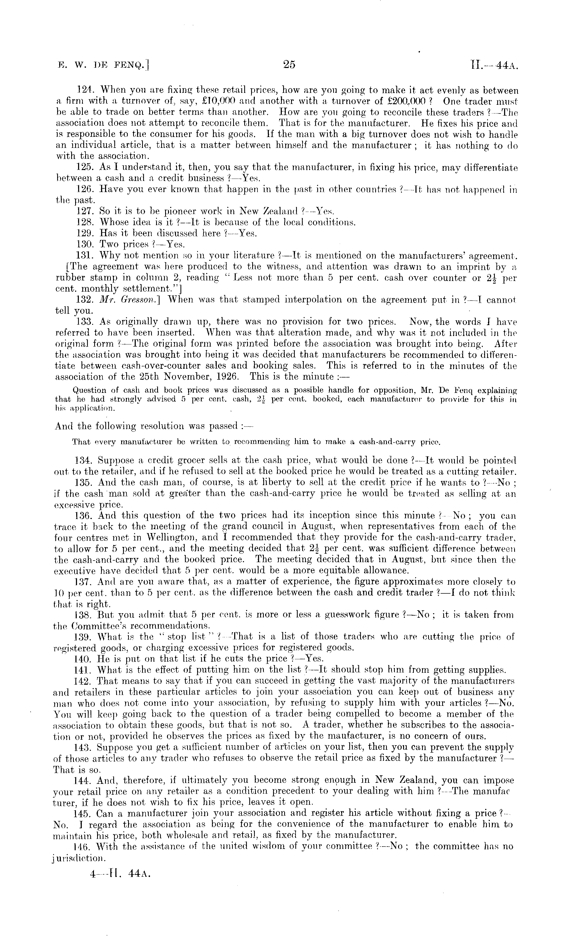 124. When you are fixing these retail prices, how are you going to make it act evenly as between a firm with a turnover of, say, £10,000 and another with a turnover of £200,000 ? One trader must be able to trade on better terms than another. How are you going to reconcile these traders ?—The association does not attempt to reconcile them. That is for the manufacturer. He fixes his price and is responsible to the consumer for his goods. If the man with a big turnover does not wish to handle an individual article, that is a matter between himself and the manufacturer ; it has nothing to do with the association. 125. As I understand it, then, you say that the manufacturer, in fixing his price, may differentiate between a cash and a credit business ? —Yes. 126. Have you ever known that happen in the past in other countries 1- It has not happened in the past. 127. So it is to be pioneer work in New Zealand I—Yes. 128. Whose idea is it ? —lt is because of the local conditions. 129. Has it been discussed here ? —Yes. 130. Two prices ? —Yes. 131. Why not mention so in your literature I—lt is mentioned on the manufacturers' agreement. [The agreement was here produced to the witness, and attention was drawn to an imprint by a rubber stamp in column 2, reading " Less not more than 5 per cent, cash over counter or 2f per cent, monthly settlement."] 132. Mr. Gresson.] When was that stamped interpolation on the agreement put in ?—I cannot tell you. 133. As originally drawn up, there was no provision for two prices. Now, the words I have referred to have been inserted. When was that alteration made, and why was it not included in the original form ?—The original form was printed before the association was brought into being. After the association was brought into being it was decided that manufacturers be recommended to differentiate between cash-over-counter sales and booking sales. This is referred to in the minutes of the association of the 25th November, 1926. This is the minute :— Question of cash and book prices was discussed as a possible handle for opposition, Mr. De Fenq explaining that he had strongly advised 5 per cent, cash, 2£ per cent, booked, each manufacturer to provide for this in his application. And the following resolution was passed : — That every manufacturer be written to recommending him to make, a cash-and-carry price. 134. Suppose a credit grocer sells at the cash price, what would be done ?- It would be pointed out to the retailer, and if he refused to sell at the booked price he would be treated as a cutting retailer. 135. And the cash man, of course, is at liberty to sell at the credit price if he wants to ? —No ; if the cash man sold at grea'ter than the cash-and-carry price he would be treated as selling at an excessive price. 136. And this question of the two prices had its inception since this minute ?—No ; you can trace it back to the meeting of the grand council in August, when representatives from each of the four centres met in Wellington, and. I recommended that they provide for the cash-and-carry trader, to allow for 5 per cent., and the meeting decided that 2\ per cent, was sufficient difference between the cash-and-carry and the booked price. The meeting decided that in August, but since then the executive have decided that 5 per cent, would be a more equitable allowance. 137. And are you aware that, as a matter of experience, the figure approximates more closely to 10 per cent, than to 5 per cent, as the difference between the cash and credit trader ? —I do not think that is right. 138. But you admit that 5 per cent, is more or less a guesswork figure ? —No ; it is taken from the Committee's recommendations. 139. What is the " stop list " ?—That is a list of those traders wlio are cutting the price of registered goods, or charging excessive prices for registered goods. 140. He is put on that list if he cuts the price ? —Yes. 141. What is the effect of putting him on the list ? —lt should stop him from getting supplies. 142. That means to say that if you can succeed in getting the vast majority of the manufacturers and retailers in these particular articles to join your association you can keep out of business any man who does not come into your association, by refusing to supply him with your articles ? —No. You will keep going back to the question of a trader being compelled to become a member of the association to obtain these goods, but that is not so. A trader, whether he subscribes to the association or not, provided he observes the prices as fixed by the maufacturer, is no concern of ours. 143. Suppose you get a sufficient number of articles on your list, then you can prevent the supply of those articles to any trader who refuses to observe the retail price as fixed by the manufacturer ? — That is so. 144. And, therefore, if ultimately you become strong enough in New Zealand, you can impose your retail price on any retailer as a condition precedent to your dealing with him ? —The manufac turer, if he does not wish to fix his price, leaves it open. 145. Can a manufacturer join your association and register his article without fixing a price ?— No. I regard the association as being for the convenience of the manufacturer to enable him to maintain his price, both wholesale and retail, as fixed by the manufacturer. 146. With the assistance of the united wisdom of your committee ? — No ; the committee has no jurisdiction.