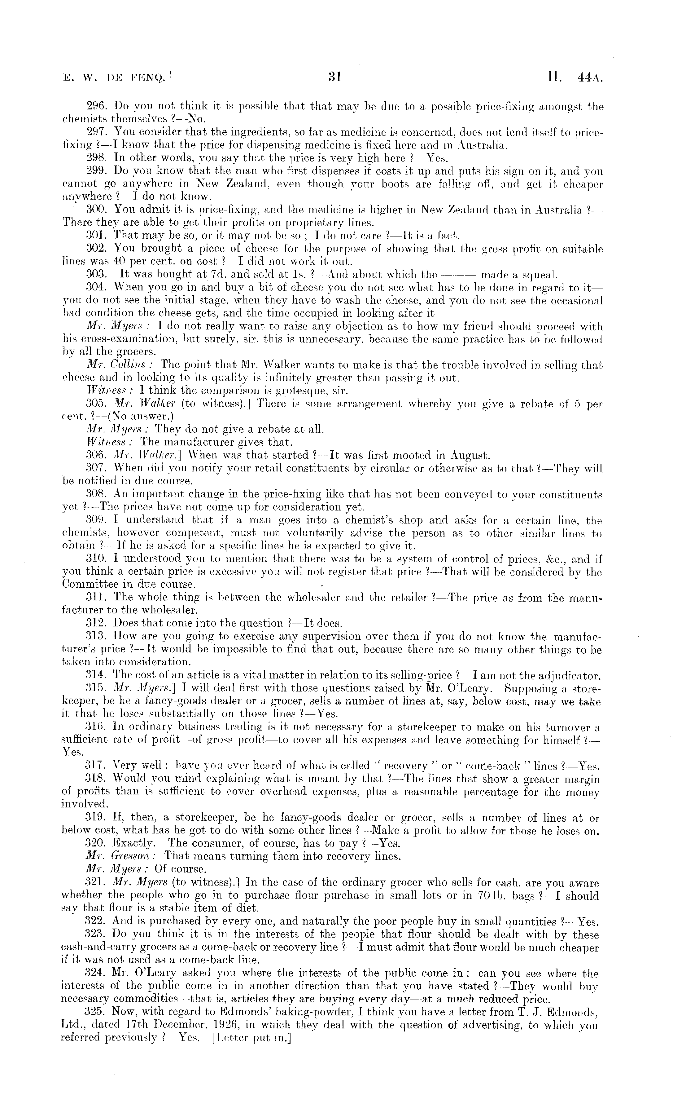 296. Do you not think it is possible that that may be due to a possible price-fixing amongst the chemists themselves ? —No. 297. You consider that the ingredients, so far as medicine is concerned, does not lend itself to pricefixing ? —I know that the price for dispensing medicine is fixed here and in Australia. 298. In other words, you say that the price is very high here ? —Yes. 299. Do you know that the man who first dispenses it costs it up and puts his sign on it, and you cannot go anywhere in New Zealand, even though your boots are falling off, and get it cheaper anywhere ? —I do not know. 300. You admit it is price-fixing, and the medicine is higher in New Zealand than in Australia ? — There they are able to get their profits on proprietary lines. 301. That may be so, or it may not be so ; Ido not care ? —lt is a fact. 302. You brought a piece of cheese for the purpose of showing that the gross profit on suitable lines was 40 per cent, on cost ?—I did not work it out. 303. It was bought at 7d. and sold at Is. ? —And about which the made a squeal. 304. Y/hen you go in and buy a bit of cheese you do not see what has to be done in regard to it — you do not see the initial stage, when they have to wash the cheese, and you do not see the occasional bad condition the cheese gets, and the time occupied in looking after it —— Mr. Myers : I do not really want to raise any objection as to how my friend should proceed with his cross-examination, but surely, sir, this is unnecessary, because the same practice has to be followed by all the grocers. Mr. Collins : The point that Mr. Walker wants to make is that the trouble involved in selling that cheese and in looking to its quality is infinitely greater than passing it out. Witness : I think the comparison is grotesque, sir. 305. Mr. Walker (to witness).] There is some arrangement whereby you give a rebate of 5 per cent. ? —(No answer.) Mr. Myers : They do not give a rebate at all. Witness : The manufacturer gives that. 306. Mr. Walter.] When was that started ?—lt was first mooted in August. 307. When did you notify your retail constituents by circular or otherwise as to that ? —They will be notified in due course. 308. An important change in the price-fixing like that has not been conveyed to your constituents yet ? —The prices have not come up for consideration yet. 309. I understand that if a man goes into a chemist's shop and asks for a certain line, the chemists, however competent, must not voluntarily advise the person as to other similar lines to obtain ? —lf he is asked for a specific lines he is expected to give it. 310. 1 understood you to mention that there was to be a system of control of prices, &c., and if you think a certain price is excessive you will not register that price ? —That will be considered by the Committee in due course. 311. The whole thing is between the wholesaler and the retailer ? —The price as from the manufacturer to the wholesaler. 312. Does that come into the question ?—lt does. 313. How are you going to exercise any supervision over them if you do not know the manufacturer's price ? —lt would be impossible to find that out, because there are so many other things to be taken into consideration. 314. The cost of an article is a vital matter in relation to its selling-price ?—I am not the adjudicator. 315. Mr. Myers.] I will deal first with those questions raised by Mr. O'Leary. Supposing a storekeeper, be he a fancy-goods dealer or a grocer, sells a number of lines at, say, below cost, may we take it that he loses substantially on those lines ?—Yes. 316. In ordinary business trading is it not necessary for a storekeeper to make on his turnover a sufficient rate of profit—of gross profit—to cover all his expenses and leave something for himself ? —- Yes. 317. Very well ; have you ever heard of what is called " recovery " or " come-back " lines ? —Yes. 318. Would you mind explaining what is meant by that ?—The lines that show a greater margin of profits than is sufficient to cover overhead expenses, plus a reasonable percentage for the money involved. 319. If, then, a storekeeper, be he fancy-goods dealer or grocer, sells a number of lines at or below cost, what has he got to do with some other lines ? —Make a profit to allow for those he loses on. 320. Exactly. The consumer, of course, has to pay ?—Yes. Mr. Gresson : That means turning them into recovery lines. Mr. Myers : Of course. 321. Mr. Myers (to witness).] In the case of the ordinary grocer who sells for cash, are you aware whether the people who go in to purchase flour purchase in small lots or in 70 lb. bags ? —I should say that flour is a stable item of diet. 322. And is purchased by every one, and naturally the poor people buy in small quantities ? —Yes. 323. Do you think it is in the interests of the people that flour should be dealt with by these cash-and-carry grocers as a come-back or recovery line ?—I must admit that flour would be much cheaper if it was not used as a come-back line. 324. Mr. O'Leary asked you where the interests of the public come in : can you see where the interests of the public come in in another direction than that you have stated ? —They would buy necessary commodities —that is, articles they are buying every day—at a much reduced price. 325. Now, with regard to Edmonds' baking-powder, I think you have a letter from T. J. Edmonds, Ltd., dated 17th December, 1926, in which they deal with the question of advertising, to which you referred previously ?—Yes. [ Letter put in.]