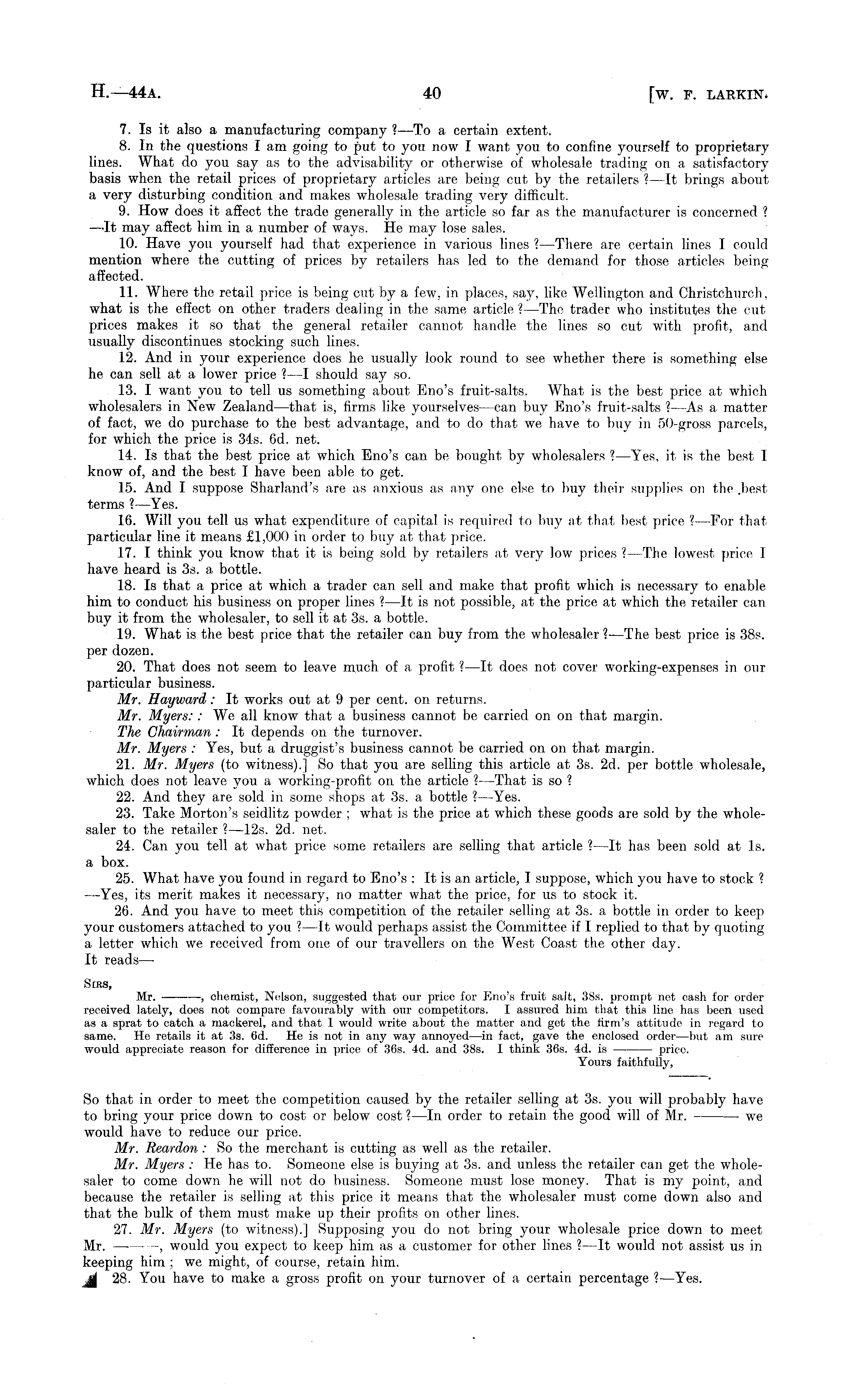 7. Is it also a manufacturing company ?—To a certain extent. 8. In the questions I am going to put to you now I want you to confine yourself to proprietary lines. What do you say as to the advisability or otherwise of wholesale trading on a satisfactory basis when the retail prices of proprietary articles are being cut by the retailers ? —lt brings about a very disturbing condition and makes wholesale trading very difficult. 9. How does it affect the trade generally in the article so far as the manufacturer is concerned ? —It may affect him in a number of ways. He may lose sales. 10. Have you yourself had that experience in various lines ? —There are certain lines I could mention where the cutting of prices by retailers has led to the demand for those articles being affected. 11. Where the retail price is being cut by a few, in places, say, like Wellington and Christchurch, what is the effect on other traders dealing in the same article ?—The trader who institutes the cut prices makes it so that the general retailer cannot handle the lines so cut with profit, and usually discontinues stocking such lines. 12. And in your experience does he usually look round to see whether there is something else he can sell at a lower price ?—I should say so. 13. I want you to tell us something about Bno's fruit-salts. What is the best price at which wholesalers in New Zealand —that is, firms like yourselves —can buy Eno's fruit-salts I—As1 —As a matter of fact, we do purchase to the best advantage, and to do that we have to buy in 50-gross parcels, for which the price is 345. 6d. net. 14. Is that the best price at which Eno's can be bought by wholesalers ? —Yes, it is the best I know of, and the best I have been able to get. 15. And I suppose Sharland's are as anxious as any one else to buy their supplies on the .best terms ?—Yes. 16. Will you tell us what expenditure of capital is required to buy at that best price ?—For that particular line it means £1,000 in order to buy at that price. 17. I think you know that it is being sold by retailers at very low prices ? —The lowest price I have heard is 3s. a bottle. 18. Is that a price at which a trader can sell and make that profit which is necessary to enable him to conduct his business on proper lines ?—lt is not possible, at the price at which the retailer can buy it from the wholesaler, to sell it at 3s. a bottle. 19. What is the best price that the retailer can buy from the wholesaler ?—The best price is 38s. per dozen. 20. That does not seem to leave much of a profit ? —lt does not cover working-expenses in our particular business. Mr. Hayward: It works out at 9 per cent, on returns. Mr. Myers:: We all know that a business cannot be carried on on that margin. The Chairman : It depends on the turnover. Mr. Myers : Yes, but a druggist's business cannot be carried on on that margin. 21. Mr. Myers (to witness).] So that you are selling this article at 3s. 2d. per bottle wholesale, which does not leave you a working-profit on the article ? —That is so ? 22. And they are sold in some shops at 3s. a bottle ? —Yes. 23. Take Morton's seidlitz powder ; what is the price at which these goods are sold by the wholesaler to the retailer ? —l2s. 2d. net. 24. Can you tell at what price some retailers are selling that article ? —lt has been sold at Is. a box. 25. What have you found in regard to Eno's : It is an article, I suppose, which you have to stock ? —Yes, its merit makes it necessary, no matter what the price, for us to stock it. 26. And you have to meet this competition of the retailer selling at 3s. a bottle in order to keep your customers attached to you ? —lt would perhaps assist the Committee if I replied to that by quoting a letter which we received from one of our travellers on the West Coast the other day. It reads— Sms, Mr. , chemist, Nelson, suggested that our price for Eno's fruit salt, 38s. prompt net cash for order received lately, does not compare favourably with our competitors. I assured him that this line has been used as a sprat to catch a mackerel, and that I would write about the matter and get the firm's attitude in regard to same. He retails it at 3s. 6d. He is not in any way annoyed—in fact, gave the enclosed order —but am sure would appreciate reason for difference in price of 365. 4d. and 38s. I think 365. 4d. is — price. Yours faithfully, So that in order to meet the competition caused by the retailer selling at 3s. you will probably have to bring your price down to cost or below cost ? —ln order to retain the good will of Mr. —■ we would have to reduce our price. Mr. Reardon : So the merchant is cutting as well as the retailer. Mr. Myers : He has to. Someone else is buying at 3s. and unless the retailer can get the wholesaler to come down he will not do business. Someone must lose money. That is my point, and because the retailer is selling at this price it means that the wholesaler must come down also and that the bulk of them must make up their profits on other lines. 27. Mr. Myers (to witness).] Supposing you do not bring your wholesale price down to meet Mr. , would you expect to keep him as a customer for other lines ? —lt would not assist us in keeping him ; we might, of course, retain him. 28. You have to make a gross profit on your turnover of a certain percentage ? —Yes.