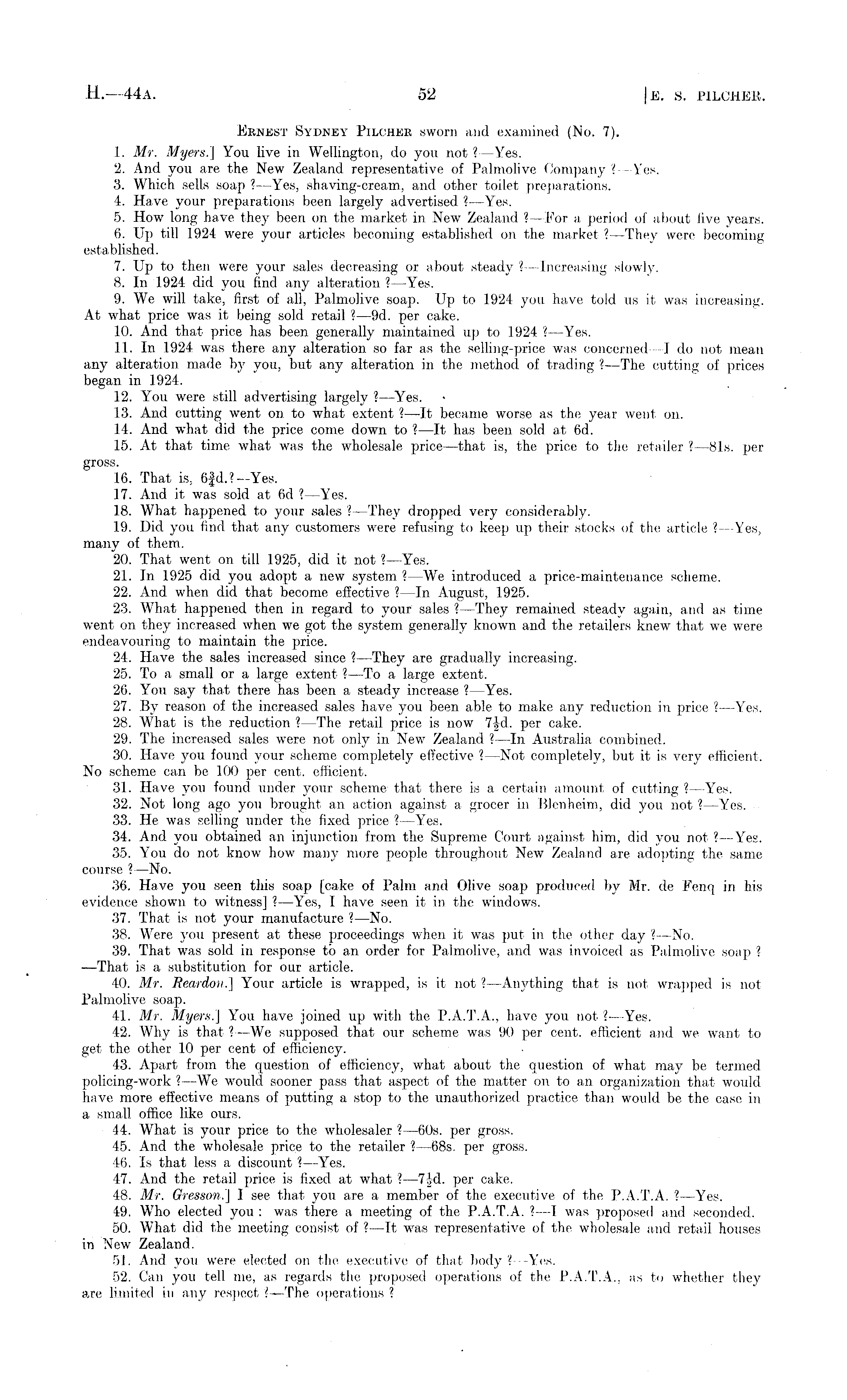 Ernest Sydney Pilchek sworn and examined (No. 7). 1. Mr. Myers.] You live in Wellington, do you not ? —Yes. 2. And you are the New Zealand representative of Palmolive Company ?—Yes. 3. Which sells soap ?—Yes, shaving-cream, and other toilet preparations. 4. Have your preparations been largely advertised ? —Yes. 5. How long have they been on the market in New Zealand ?—For a period of about five years. 6. Up till 1924 were your articles becoming established on the market ? —They were becoming established. 7. Up to then were your sales decreasing or about steady ? —lncreasing slowly. 8. In 1924 did you find any alteration ? —Yes. 9. We will take, first of all, Palmolive soap. Up to 1924 you have told us it was increasing. At what price was it being sold retail ? —9d. per cake. 10. And that price has been generally maintained up to 1924 ?—Yes. 11. In 1924 was there any alteration so far as the selling-price was concerned- 1 do not mean any alteration made by you, but any alteration in the method of trading ? —The cutting of prices began in 1924. 12. You were still advertising largely ? —Yes. 13. And cutting went on to what extent ?—lt became worse as the year went on. 14. And what did the price come down to ? —lt has been sold at 6d. 15. At that time what was the wholesale price—that is, the price to the retailer ?—Bls. per gross. 16. That is, 6fd.? —Yes. 17. And it was sold at 6d ?—Yes. 18. What happened to your sales ? —They dropped very considerably. 19. Did you find that any customers were refusing to keep up their stocks of the article ?—Yes, many of them. 20. That went on till 1925, did it not ? —Yes. 21. In 1925 did you adopt a new system ? —We introduced a price-maintenance scheme. 22. And when did that become effective ? —ln August, 1925. 23. What happened then in regard to your sales ? —They remained steady again, and as time went on they increased when we got the system generally known and the retailers knew that we were endeavouring to maintain the price. 24. Have the sales increased since ?—They are gradually increasing. 25. To a small or a large extent ?—To a large extent. 26. You say that there has been a steady increase ?—Yes. 27. By reason of the increased sales have you been able to make any reduction in price ? —Yes. 28. What is the reduction ?—The retail price is now 7|d.. per cake. 29. The increased sales were not only in New Zealand ?—ln Australia combined. 30. Have you found your scheme completely effective ? —Not completely, but it is very efficient. No scheme can be 100 per cent, efficient. 31. Have you found under your scheme that there is a certain amount of cutting ? —Yes. 32. Not long ago you brought an action against a grocer in Blenheim, did you not ? —Yes. 33. He was selling under the fixed price ?—Yes. 34. And you obtained an injunction from the Supreme Court against him, did you not ? —Yes. 35. You do not know how many more people throughout New Zealand are adopting the same course V —No. 36. Have you seen this soap [cake of Palm and Olive soap produced by Mr. de Fenq in his evidence shown to witness] ?—Yes, I have seen it in the windows. 37. That is not your manufacture ? —No. 38. Were you present at these proceedings when it was put in the other day ?—No. 39. That was sold in response to an order for Palmolive, and was invoiced as Palmolive soap ? —That is a substitution for our article. 40. Mr. Reardon.] Your article is wrapped, is it not ?—Anything that is not wrapped is not Palmolive soap. 41. Mr. Myers.] You have joined up with the P.A.T.A., have you not ?—Yes. 42. Why is that ? —We supposed that our scheme was 90 per cent, efficient and we want to get the other 10 per cent of efficiency. 43. Apart from the question of efficiency, what about the question of what may be termed policing-work ? —We would sooner pass that aspect of the matter on to an organization that would have more effective means of putting a stop to the unauthorized practice than would be the case in a small office like ours. 44. What is your price to the wholesaler ? —6os. per gross. 45. And the wholesale price to the retailer ? —6Bs. per gross. 46. Is that less a discount ? —Yes. 47. And the retail price is fixed at what ?—7|d. per cake. 48. Mr. Gresson.] I see that you are a member of the executive of the P.A.T.A. ?—Yes. 49. Who elected you : was there a meeting of the P.A.T.A. ?—I was proposed and seconded. 50. What did the meeting consist of ? —lt was representative of the wholesale and retail houses in New Zealand. 51. And you were elected on the executive of that body ?—Yes. •52. Can you tell me, as regards the proposed operations of the P.A.T.A., as to whether they are limited in any respect ?— I The operations ?