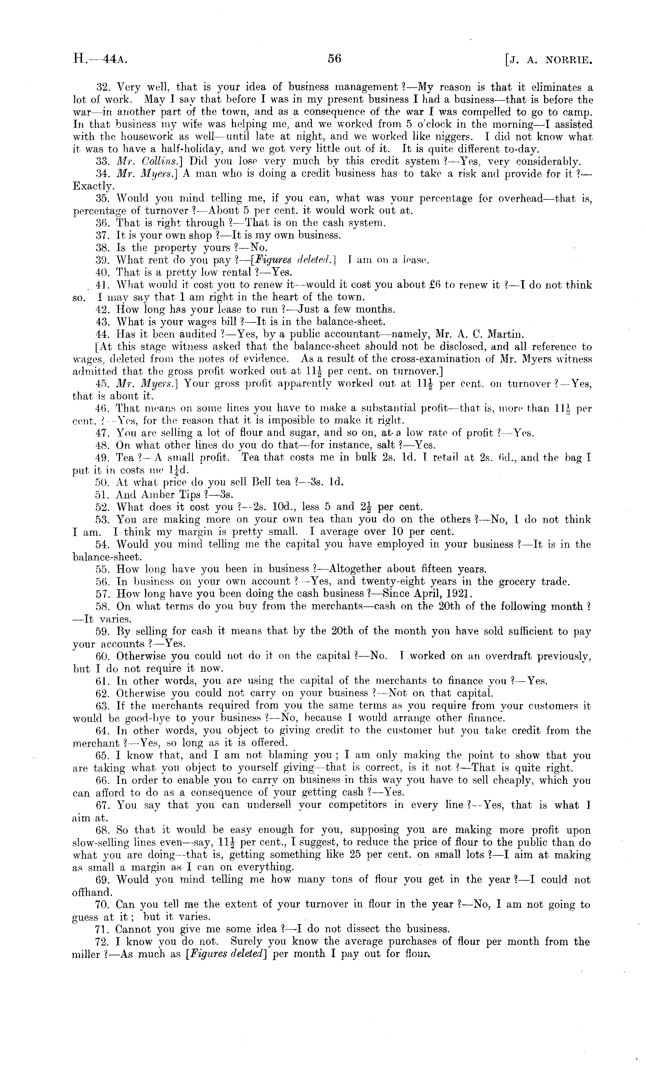 32. Very well, that is your idea of business management ? —My reason is that it eliminates a lot of work. May I say that before I was in my present business I had a business—that is before the war —in another part of the town, and as a consequence of the war I was compelled to go to camp. In that business my wife was helping me, and we worked from 5 o'clock in the morning—l assisted with the housework as well—until late at night, and we worked like niggers. I did not know what it was to have a half-holiday, and we got. very little out of it. It is quite different to-day. 33. Mr. Collins.] Did you lose very much by this credit system ? —Yes, very considerably. 34. Mr. Myers.] A man who is doing a credit business has to take a risk and provide for it ? — Exactly. 35. Would you mind telling me, if you can, what was your percentage for overhead—that is, percentage of turnover ?—About 5 per cent, it would work out at. 36. That is right through ? —That is on the cash system. 37. It is your own shop ? —lt is my own business. 38. Is the property yours?— No. 39. What rent do you pay ? —[Figures deleted.] I am on a lease. 40. That is a pretty low rental ? —Yes. 41. What would it cost you to renew it —would it cost you about £6 to renew it ? —I do not think so. I may say that lam right in the heart of the town. 42. How long has your lease to run ?—Just a few months. 43. What is your wages bill ? —lt is in the balance-sheet. 44. Has it been audited ? —Yes, by a public accountant —namely, Mr. A. C. Martin. [At this stage witness asked that the balance-sheet should not be disclosed, and all reference to wages, deleted from the notes of evidence. As a result of the cross-examination of Mr. Myers witness admitted that the gross profit worked out at llf per cent, on turnover.] 45. Mr. Myers.] Your gross profit apparently worked out at llf per cent, on turnover ?—Yes, that is about it. 46. That means on some lines you have to make a substantial profit—that is, more than 11| per cent. ? —Yes, for the reason that it is imposible to make it right. 47. You are selling a lot of flour and sugar, and so on, at a low rate of profit % —Yes. 48. On what other lines do you do that—for instance, salt ?—Yes. 49. Tea ?—A small profit. Tea that costs me in bulk 2s. Id. f retail at 2s. 6d., and the bag I put it in costs me ljd. 50. At what price do you sell Bell tea ?—3s. Id. 51. And Amber Tips ? —3s. 52. What does it cost you ? —2s. 10d., less 5 and 2-| per cent. 53. You are making more on your own tea than you do on the others ? —No, I do not think I am. I think my margin is pretty small. I average over 10 per cent. 54. Would you mind telling me the capital you have employed in your business ? —lt is in the balance-sheet. 55. How long have you been in business ? —Altogether about fifteen years. 56. In business on your own account ? -Yes, and twenty-eight years in the grocery trade. 57. How long have you been doing the cash business ? —Since April, 1921. 58. On what terms do you buy from the merchants—cash on the 20th of the following month % —It varies. 59. By selling for cash it means that by the 20th of the month you have sold sufficient to pay your accounts ? —Yes. 60. Otherwise you could not do it on the capital % —No. I worked on an overdraft previously, but I do not require it now. 61. In other words, you are using the capital of the merchants to finance you ?—Yes. 62. Otherwise you could not carry on your business ?—Not on that capital. 63. If the merchants required from you the same terms as you require from your customers it would be good-bye to your business ? —No, because I would arrange other finance. 64. In other words, you object to giving credit to the customer but you take credit from the merchant ?—Yes, so long as it is offered. 65. I know that, and I am not blaming you ; I am only making the point to show that you are taking what you object to yourself giving—that is correct, is it not ? —That is quite right. 66. In order to enable you to carry on business in this way you have to sell cheaply, which you can afford to do as a consequence of your getting cash ?—Yes. 67. You say that you can undersell your competitors in every line ?--Yes, that is what I aim at. 68. So tha/t it would be easy enough for you, supposing you are making more profit upon slow-selling lines even —say, 11| per cent., I suggest, to reduce the price of flour to the public than do what you are doing- that is, getting something like 25 per cent, on small lots ? —I aim at making as small a margin as I can on everything. 69. Would you mind telling me how many tons of flour you get in the year ? —I could not offhand. 70. Can you tell me the extent of your turnover in flour in the year ?—No, I am not going to guess at it; but it varies. 71. Cannot you give me some idea ? —I do not dissect the business. 72. I know you do not. Surely you know the average purchases of flour per month from the miller ?—As much as [Figures deleted] per month I pay out for flour..