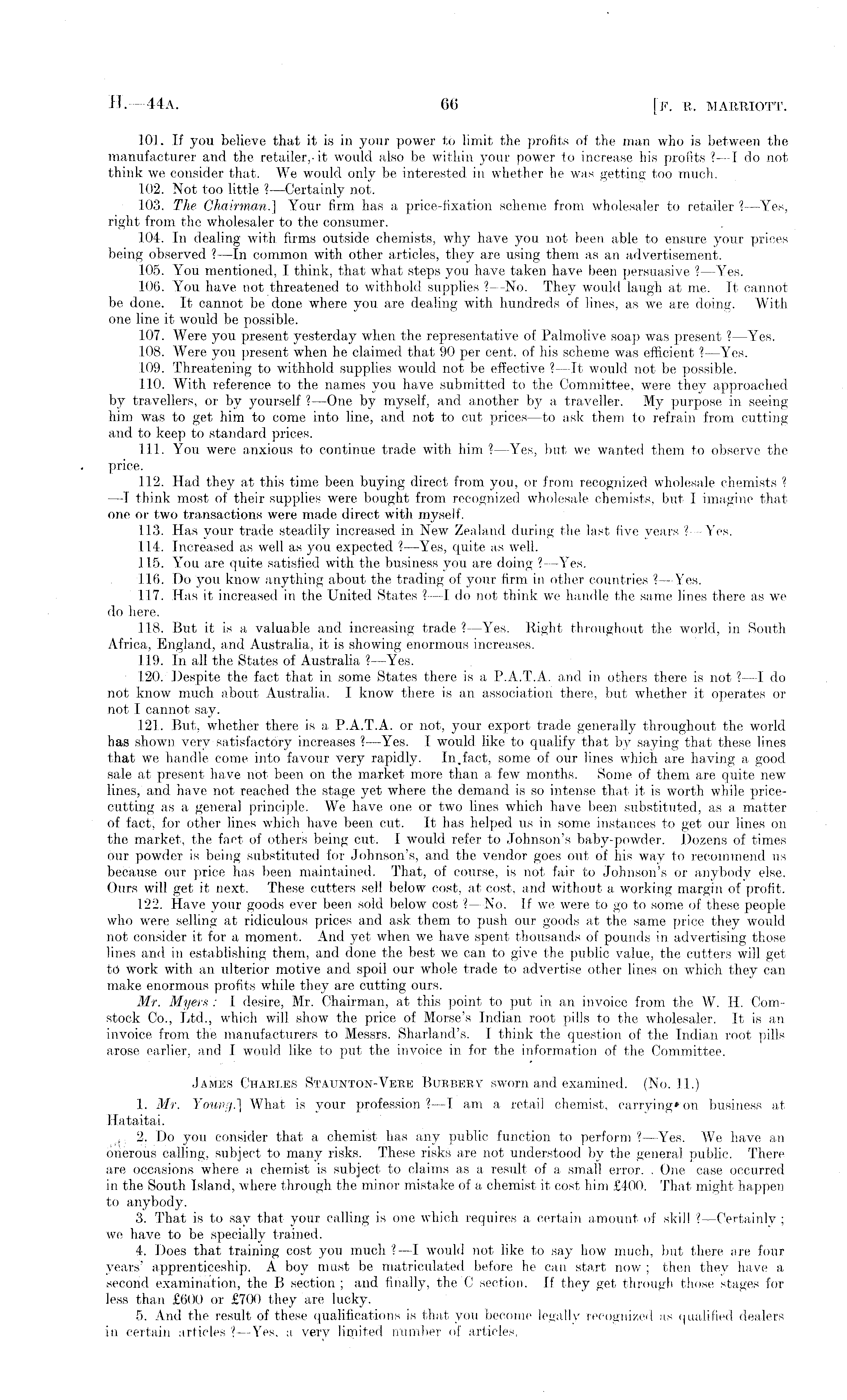 101. If you believe that it is in your power to limit the profits of the man who is between the manufacturer and the retailer,-it would also be within your power to increase his profits '? —I do not think we consider that. We would only be interested in whether he was getting too much. 102. Not too little ? —Certainly not. 103. The Chairman.] Your firm has a price-fixation scheme from wholesaler to retailer ?—Yes, right from the wholesaler to the consumer. 104. In dealing with firms outside chemists, why have you not been able to ensure your prices being observed ?—ln common with other articles, they are using them as an advertisement. 105. You mentioned, I think, that what steps you have taken have been persuasive ? —Yes. 106. You have not threatened to withhold supplies ?—-No. They would laugh at me. It cannot be done. It cannot be done where you are dealing with hundreds of lines, as we are doing. With one line it would be possible. 107. Were you present yesterday when the representative of Palmolive soap was present ?—Yes. 108. Were you present when he claimed that 90 per cent, of his scheme was efficient ? —Yes. 109. Threatening to withhold supplies would not be effective ? —lt would not be possible. 110. With reference to the names you have submitted to the Committee, were they approached by travellers, or by yourself ? —One by myself, and another by a traveller. My purpose in seeing him was to get him to come into line, and not to cut prices—to ask them to refrain from cutting and to keep to standard prices. 111. You were anxious to continue trade with him ? —Yes, but we wanted them to observe the price. 112. Had they at this time been buying direct from you, or from recognized wholesale chemists ? —I think most of their supplies were bought from recognized wholesale chemists, but I imagine that one or two transactions were made direct with myself. 113. Has your trade steadily increased in New Zealand during the last five years ? —Yes. 114. Increased as well as you expected ?—Yes, quite as well. Jl5. You are quite satisfied with the business you are doing ? —Yes. 116. Do you know anything about the trading of your firm in other countries ? —Yes. 117. Has it increased in the United States ?—I do not think we handle the same lines there as we do here. 118. But it is a valuable and increasing trade ? —Yes. Right throughout the world, in South Africa, England, and Australia, it is showing enormous increases. 119. In all the States of Australia ? —Yes. 120. Despite the fact that in some States there is a P.A.T.A. and in others there is not ? —I do not know much about Australia. I know there is an association there, but whether it operates or not I cannot say. 121. But, whether there is a P.A.T.A. or not, your export trade generally throughout the world has shown very satisfactory increases ? —Yes. I would like to qualify that by saying that these lines that we handle come into favour very rapidly. In,fact, some of our lines which are having a good sale at present have not been on the market more than a, few months. Some of them are quite new lines, and have not reached the stage yet where the demand is so intense that it is worth while pricecutting as a general principle. We have one or two lines which have been substituted, as a matter of fact, for other lines which have been cut. It has helped us in some instances to get our lines on the market, the fact of others being cut. I would refer to Johnson's baby-powder. Dozens of times our powder is being substituted for Johnson's, and the vendor goes out of his way to recommend us because our price has been maintained. That, of course, is not fair to Johnson's or anybody else. Ours will get it next. These cutters sell below cost, at cost, and without a working margin of profit. 122. Have your goods ever been sold below cost ? —No. If we were to go to some of these people who were selling at ridiculous prices and ask them to push our goods at the same price they would not consider it for a moment. And yet when we have spent thousands of pounds in advertising those lines and in establishing them, and done the best we can to give the public value, the cutters will get to work with an ulterior motive and spoil our whole trade to advertise other lines on which they can make enormous profits while they are cutting ours. Mr. Myers : I desire, Mr. Chairman, at this point to put in an invoice from the W. H. Comstock Co., Ltd., which will show the price of Morse's Indian root pills to the wholesaler. It is an invoice from the manufacturers to Messrs. Sharland's. I think the question of the Indian root pills arose earlier, and I would like to put the invoice in for the information of the Committee. James Chaet.es Staunton-Veee Burberv sworn and examined. (No. 11.) I. Mr. Young.'] What is your profession ?—I am a retail chemist, carrying*on business at Hataitai. , 2. Do you consider that a chemist has any public function to perform ?—Yes. We have an onerous calling, subject to many risks. These risks are not understood by the general public. There are occasions where a chemist is subject to claims as a result of a small error. . One case occurred in the South Island, where through the minor mistake of a chemist it cost him £400. That might happen to anybody. 3. That is to say that your calling is one which requires a certain amount of skill ?—Certainly ; we have to be specially trained. 4. Does that training cost you much ?—I would not like to say how much, but there are four years' apprenticeship. A boy must be matriculated before he can start now ; then they have a second examination, the B section ; and finally, the C section. If they get through those stages for less than £600 or £700 they are lucky. 5. And the result of these qualifications is that you become legally recognized as qualified dealers in certain articles ? —Yes, a verv limited number of articles,