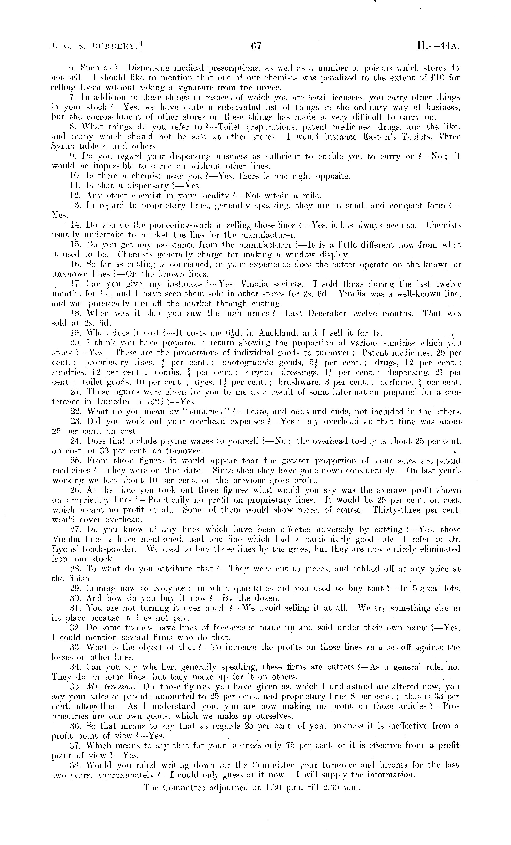 6. Such as ? —Dispensing medical prescriptions, as well as a number of poisons which stores do not sell. I should like to mention that one of our chemists was penalized to the extent of £10 for selling Lysol without taking a signature from the buyer. 7. In addition to these things in respect of which you are legal licensees, you carry other things in your stock ? —Yes, we have quite a substantial list of things in the ordinary way of business, but the encroachment of other stores on these things has made it very difficult to carry on. 8. What things do you refer to ? —Toilet preparations, patent medicines, drugs, and the like, and many which should not be sold at other stores. I would instance Baston's Tablets, Three Syrup tablets, and others. 9. Do you regard your dispensing business as sufficient to enable you to carry on ? —No ; it would be impossible to carry on without other lines. 10. Is there a chemist near you ? —Yes, there is one right opposite. 11. Is that a dispensary ? —Yes. 12. Any other chemist in your locality ?--Not within a mile. 13. In regard to proprietary lines, generally speaking, they are in small and compact form ? — Yes. 14. Do you do the pioneering-work in selling those lines ? —Yes, it has always been so. Chemists usually undertake to market the line for the manufacturer. 15. Do you get any assistance from the manufacturer ? —lt is a little different now from what it used to be. Chemists generally charge for making a window display. 16. So far as cutting is concerned, in your experience does the cutter operate on the known or unknown lines ? —On the known lines. 17. Can you give any instances ?— Yes, Vinolia sachets. I sold those during the last twelve months for Is., and I have seen them sold in other stores for 2s. 6d. Vinolia was a well-known line, and was practically run off the market through cutting. • 18. When was it that you saw the high prices ?—Last December twelve months. That was sold at 2s. 6d. 19. What does it cost ?— It costs me 6|d. in Auckland, and I sell it for Is. 20. I think you have prepared a, return showing the proportion of various sundries which you stock ? —-Yes. These are the proportions of individual goods to turnover : Patent medicines, 25 per cent. ; proprietary lines, § per cent. ; photographic goods, 5\ per cent. ; drugs, 12 per cent. ; sundries, 12 per cent. ; combs, § per cent. ; surgical dressings, 1|- per cent. ; dispensing, 21 per cent. ; toilet goods, 10 per cent. ; dyes, 1| per cent. ; brush ware, 3 per cent. ; perfume, £ per cent. 21. Those figures were given by you to me as a result of some information prepared for a conference in Dunedin in 1925 ? —Yes. 22. What do you mean by " sundries " ? —Teats, and odds and ends, not included, in..the others. 23. Did you work out your overhead expenses ? —Yes ; my overhead at that time was about 25 per cent, on cost. 24. Does that include paying wages to yourself ? —No ; the overhead to-day is about 25 per cent, on cost, or 33 per cent, on turnover. « 25. From those figures it would appear that the greater proportion of your sales are patent medicines ? —They were on that date. Since then they have gone down considerably. On last year's working we lost about 10 per cent, on the previous gross profit. 26. At the time you took out those figures what would you say was the average profit shown on proprietary lines ? —Practically no profit on proprietary lines. It would be 25 per cent, on cost, which meant no profit at all. Some of them would show more, of course. Thirty-three per cent. Would cover overhead. 27. Do you know of any lines which have been affected adversely by cutting?— Yes, those Vinolia lines I have mentioned, and one line which had a particularly good sale- —I refer to Dr. Lyons' tooth-powder. We used to buy those lines by the gross, but they are now entirely eliminated from our stock. 28. To what do you attribute that ? —They were cut to pieces, and jobbed off at any price at the finish. 29. Coming now to Kolynos : in what quantities did you used to buy that ?—ln 5-gross lots. 30. And how do you buy it now ?— By the dozen. 31. You are not turning it over much ?—We avoid selling it at all. We try something else in its place because it does not pay. 32. Do some traders have lines of face-cream made up and sold under their own name I—Yes, I could mention several firms who do that. 33. What is the object of that ? —To increase the profits on those lines as a set-off against the losses on other lines. 34. Can you say whether, generally speaking, these firms are cutters ? —As a general rule, no. They do on some lines, but they make up for it on others. 35. Mr. Gresso-n.] On those figures you have given us, which I understand are altered now, you say your sales of patents amounted to 25 per cent., and proprietary lines 8 per cent. ; that is. 33 per cent, altogether. As I understand you, you are now making no profit on those articles ?. —Proprietaries are our own goods, which we make up ourselves. 36. So that means to say that as regards 25 per cent, of your business it is ineffective from a profit point of view ?—Yes. 37. Which means to say that for your business only 75 per cent, of it is effective from a profit point of view ?—Yes. 38. Would you mind writing down for the Committee your turnover and income for the last two years, approximately ?— I could only guess at it now. I will supply the information. The Committee adjourned at 1.50 p.m. till 2.30 p.m.
